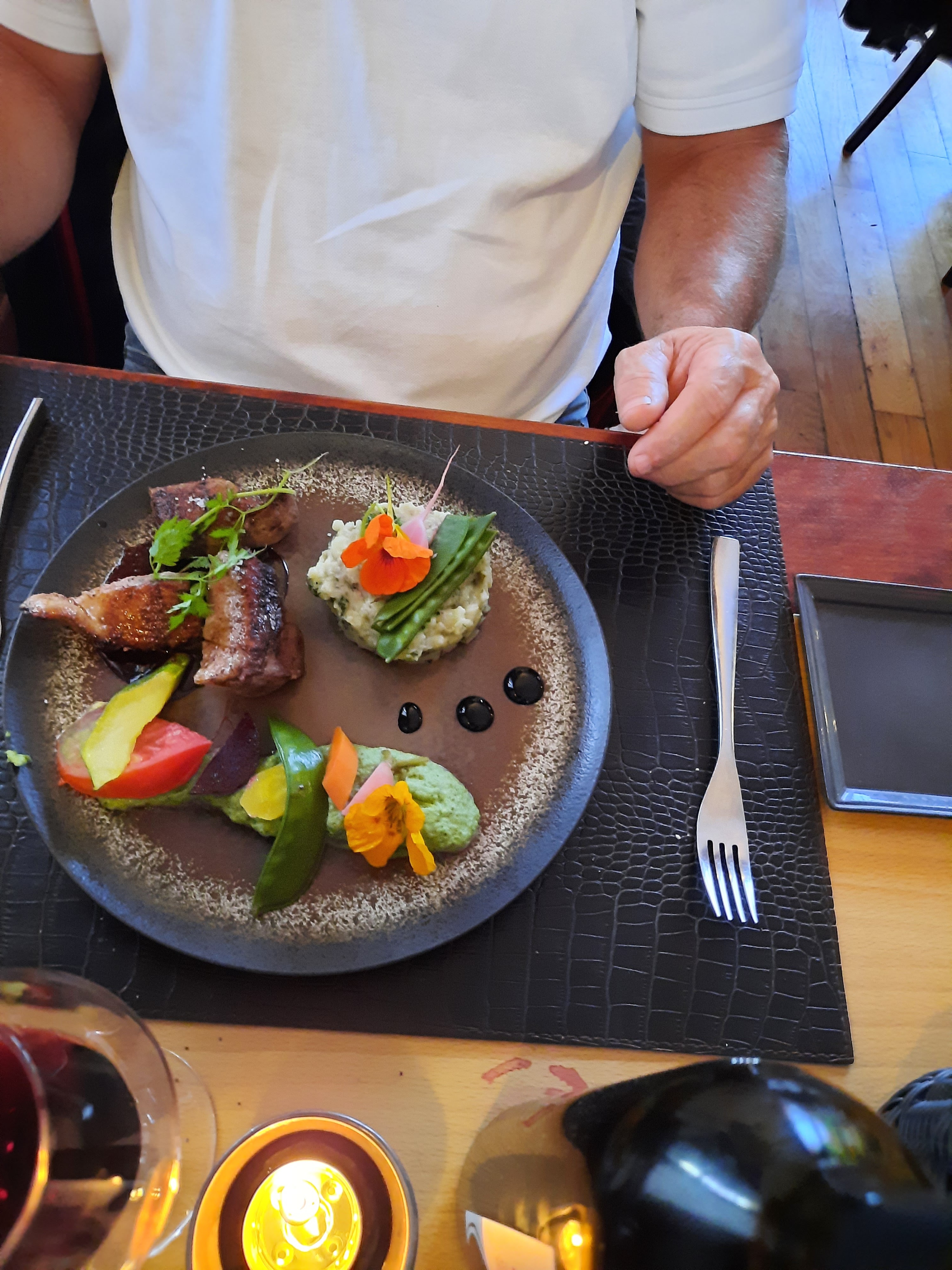 tres bon restaurant et en plus des tarifs plus que correct..service impeccable avec en plus la bonne humeur du serveur(compétent)aperitif coktail maison tres bon..menu a 48€Carpaccio de lotte fumée aux algues,Tournedos de bœuf Wellington revisité,(superbe morceau de viande)Filet de lieu jaune ....pain frais .beurre maison .tres bon legumes. a refaire surement