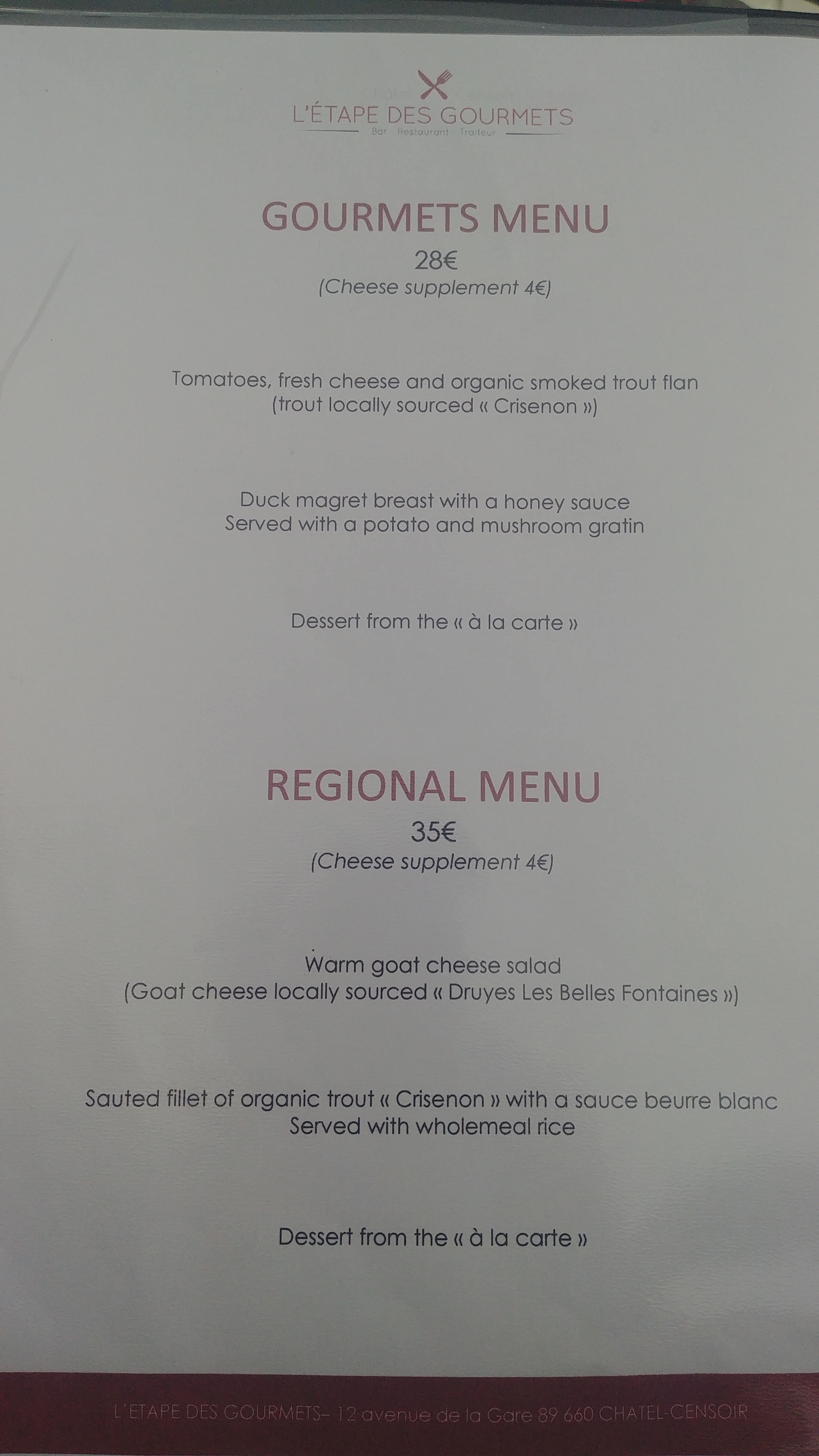 Bonjour restaurant très sympathique menu 15 euros délicieuse assiette de charcuterie du pays frites parfaites viande un peu dure(dommage) dessert faisselle agréable . Bon accueil accepte les chiens joli décor. Un verre de vin rouge de Coulanges gouleyant et parfumé. Bon rapport qualité prix. A notre prochain séjour dans l yonne on essaiera un menu Supérieur (29 euros). Bref une jolie halte.