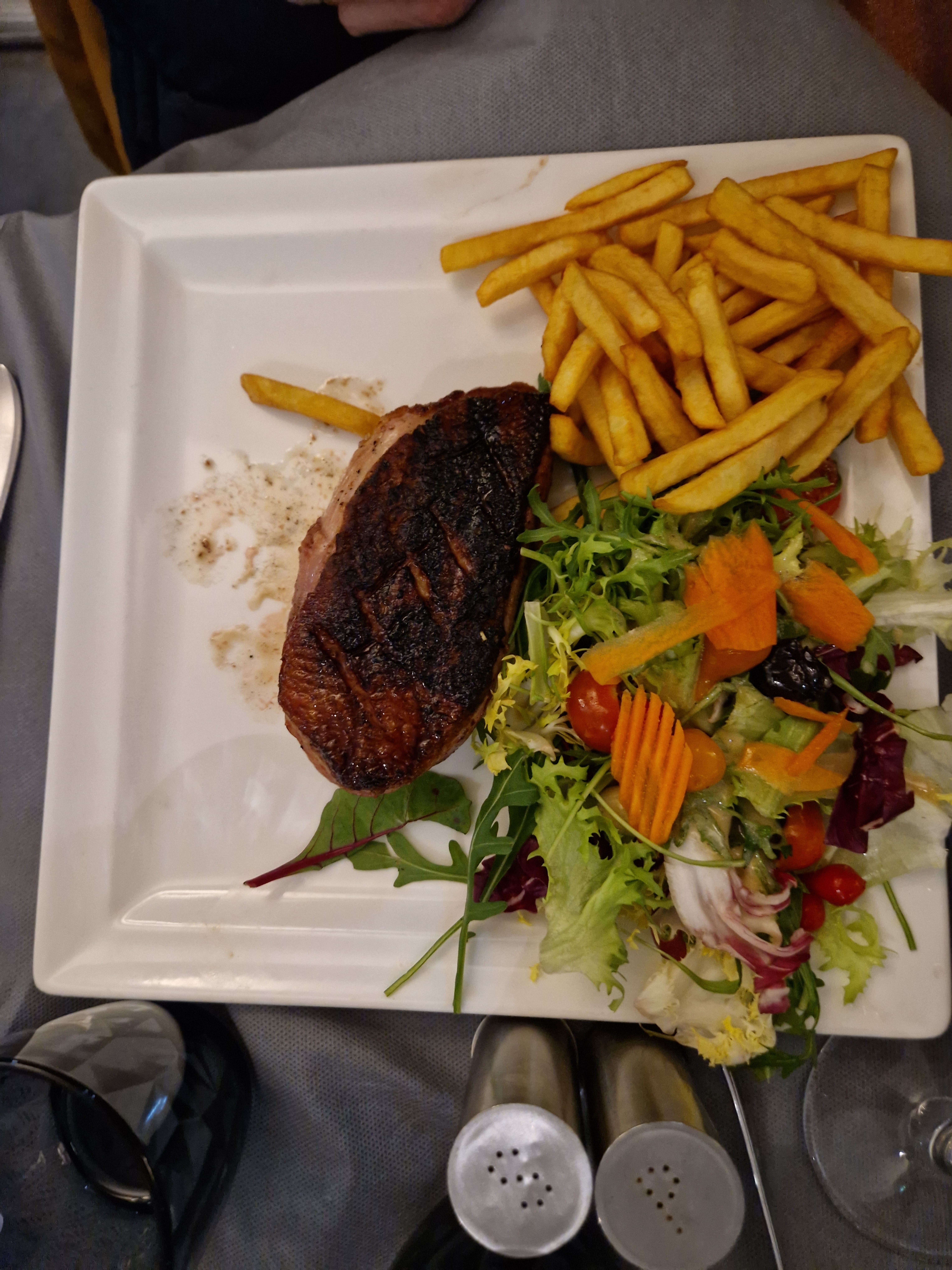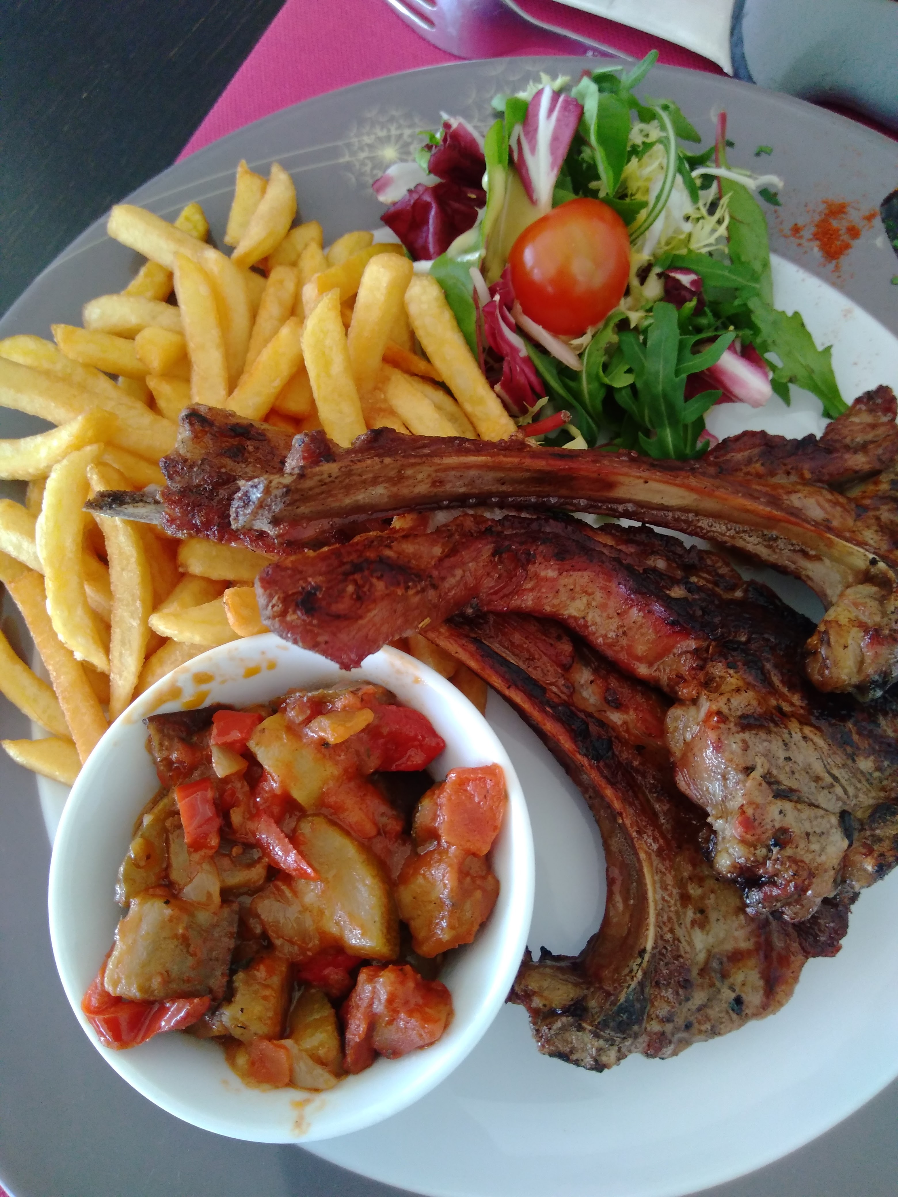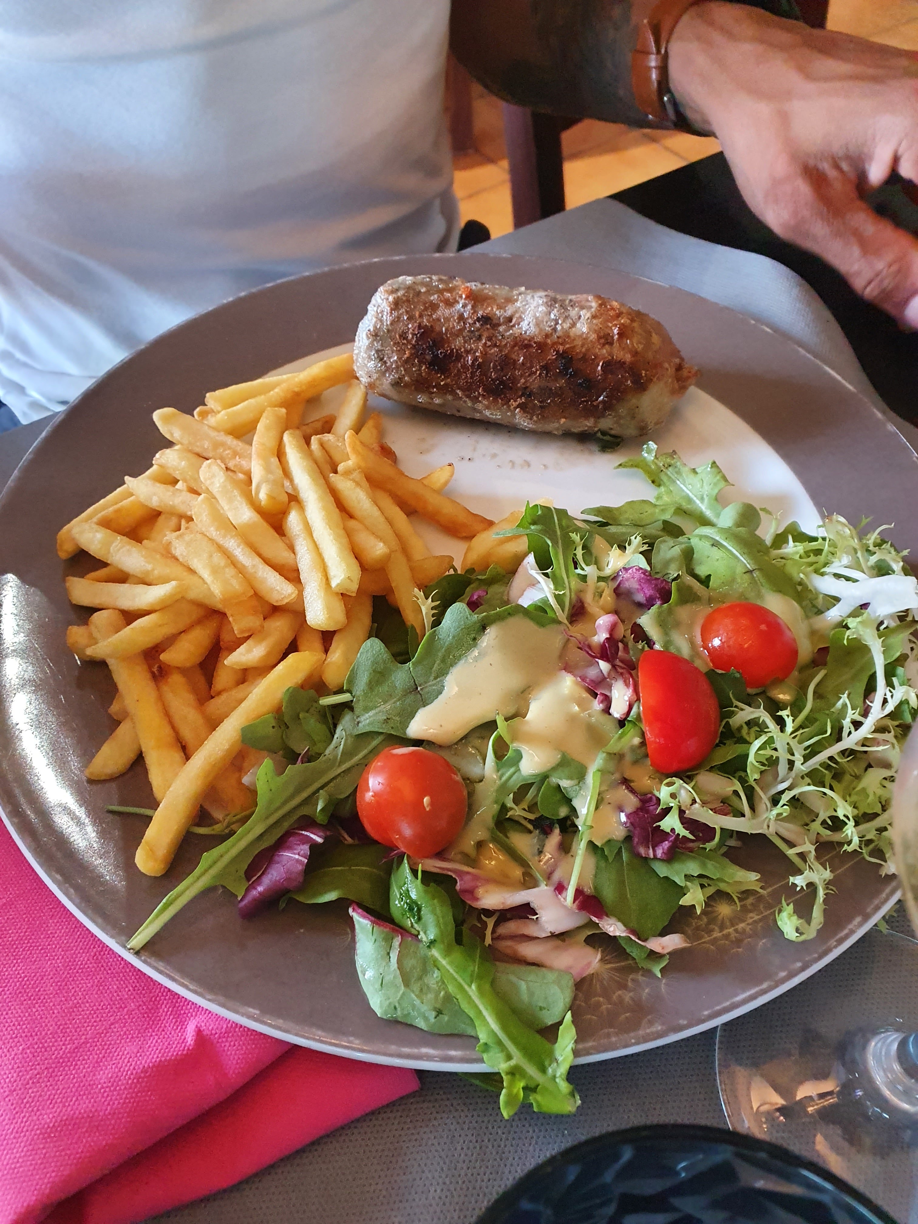 Nous étions sur une terrasse mise à disposition pour les personnes ayant réservées au dernier moment. Ok mais en plein soleil entre midi et deux avec des enfants c'est un peu léger... 1h d'attente pour les plats, Ok le restaurant est plein. Nous avions commandé entrecôte/bavette, la cuisson était parfaite, tendre mais quand je lis les commentaires copieux pardon? mais avec des plats entre 25 et 30e servis avec une mini coupelle de ratatouille, une poignée de salade mélangée type sachet qu'on trouve en grande surface avec une vinaigrette de même acabit, et des frites ou plutôt allumettes je dirais même des rataillons archi cuits, alors à ce prix là j'attends quand même un service un peu meilleur, et des plats de meilleur qualité, la viande vous sauve mais surtout les touristes qui apprécient dépenser de l'argent pour manger des plats qu'ils ne mangent certainement jamais... Je passe mon chemin.