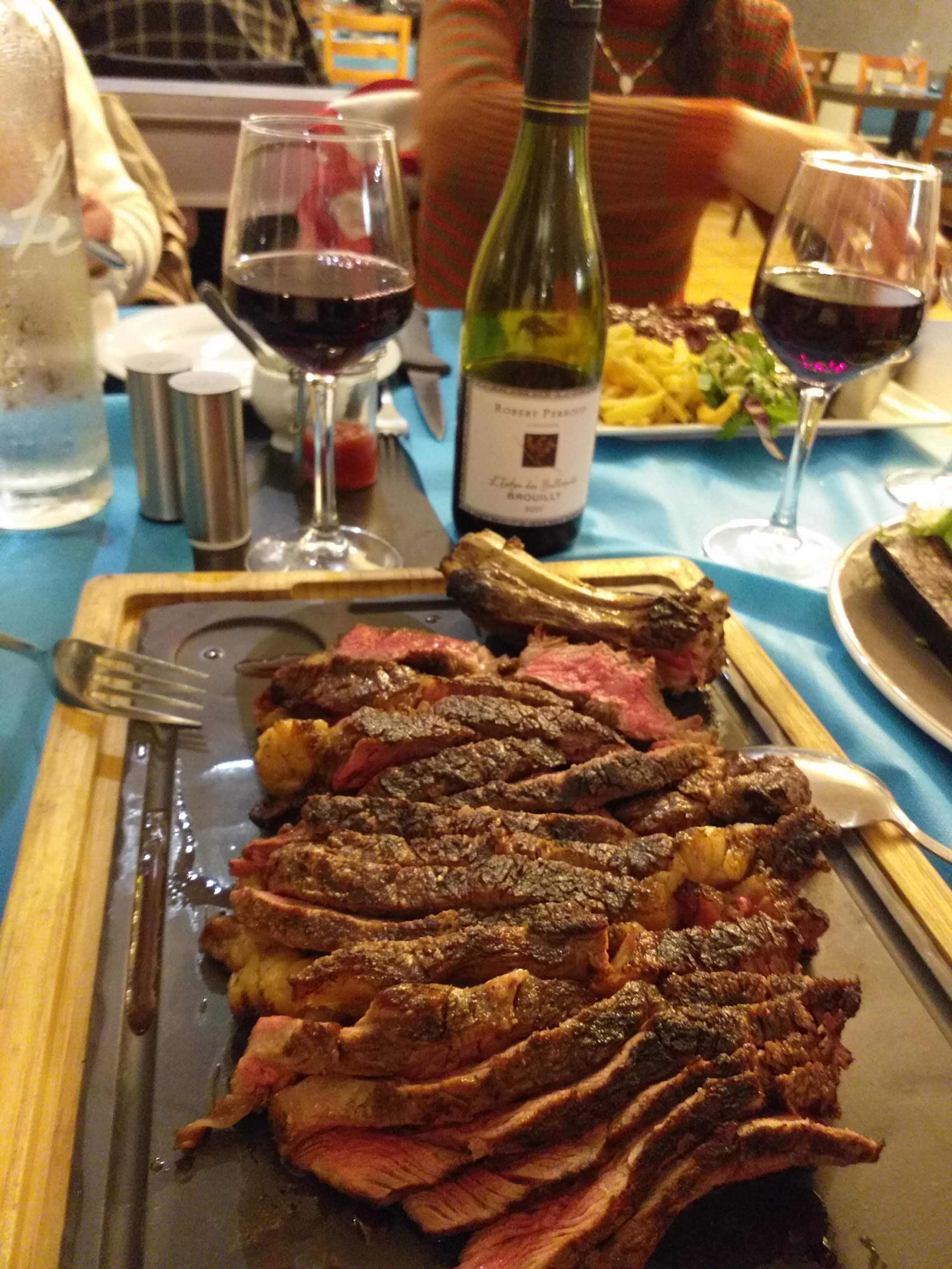 Nous avons mangé des viandes très bonnes cuites au feu de bois (servis avec des frites surgelés… dommage). Et je trouve dommage d’avoir une aussi belle cave et de servir le vin dans des verres à vin de cantine. Mais nous avons tout de même passé un bon moment :-)