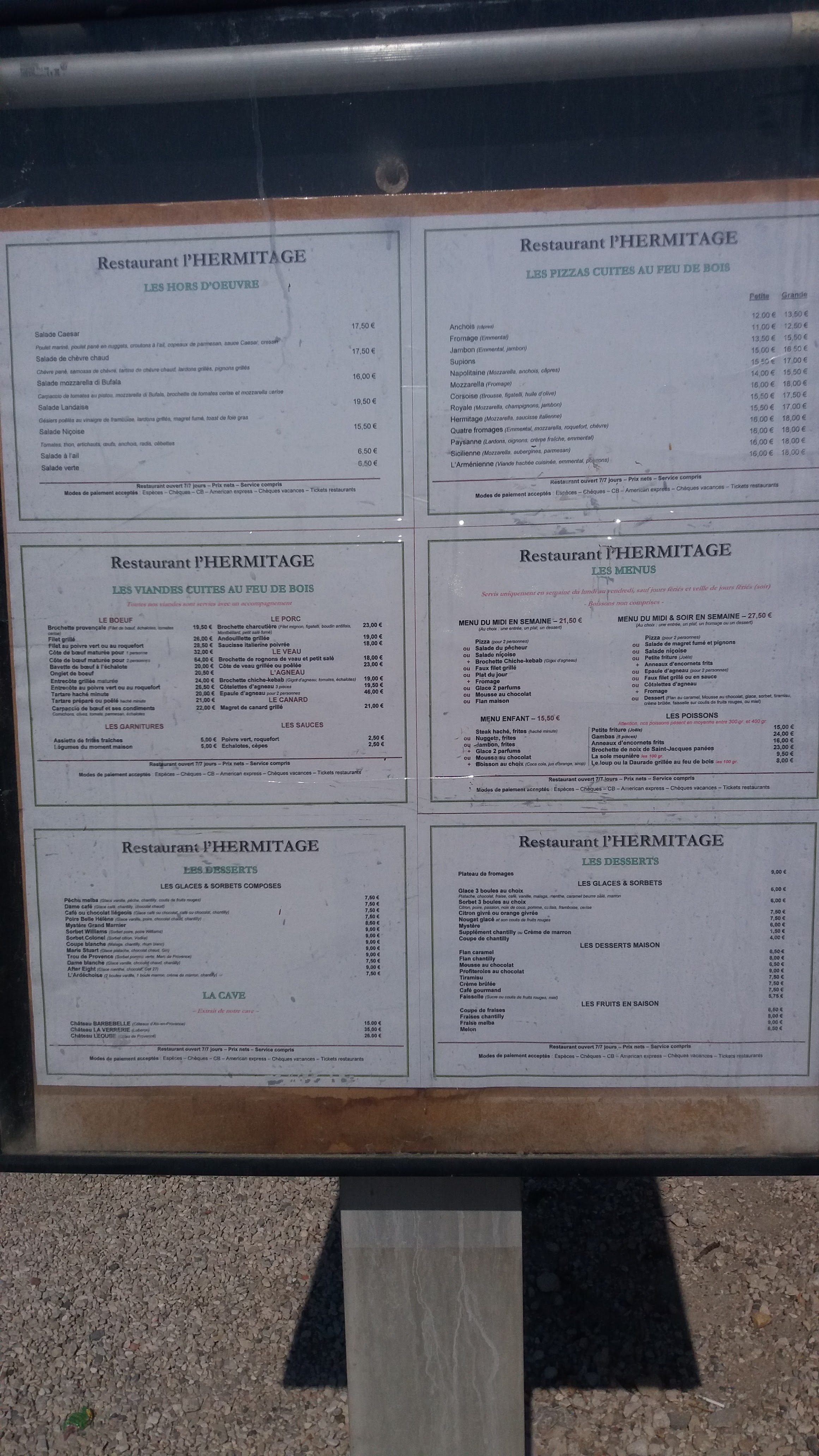 Mon évaluation datée d’il y’a Trois années je suis venu la modifier. Première visite à L’hermitage il y a 16 ans j’y vais 3-4 fois par an peut être pas un gros clients mais le service de hier était plus que lamentable, vite installé on nous presse pour commander puis le néant, les cocktail sont vide plus de glaçons que de boissons à 10€ le coktail on est vraiment dans de la rentabilité le plus mauvais de plus que j’ai bu sur les 10 dernières années manque même de sucre les plats ma fille a était servie elle avait fini que nous n’étions pas servi25 minutes avant nous mon fils et moi avons partagé une assiette de charcuterie et une pizza le temps d’attente entre les deux plats plus de 45 minutes on nous avait oublié d’ailleurs la pizza on se passera de commentaires pour le dessert avant de prendre notre commande il se passe encore 25 minutes Bref le repas horrible le repas de trop et osé me demander si ça a était je pense d’ailleurs ça se voyait à nos mines déconfites et on nous demande à quelle heure sommes nous arrive quand je lis les commentaires sur les 3 derniers mois ça va dans mon sens il faut se ressaisir c’était le restau ou j’avais amené ma femme a notre première rencontre mais la c’est la dernière fois une note à 120 balle voir un peu plus qui ne les vaux très certainement pas la gentillesse du personnel seul point positif mais dommage on a était les oubliés de la soirée