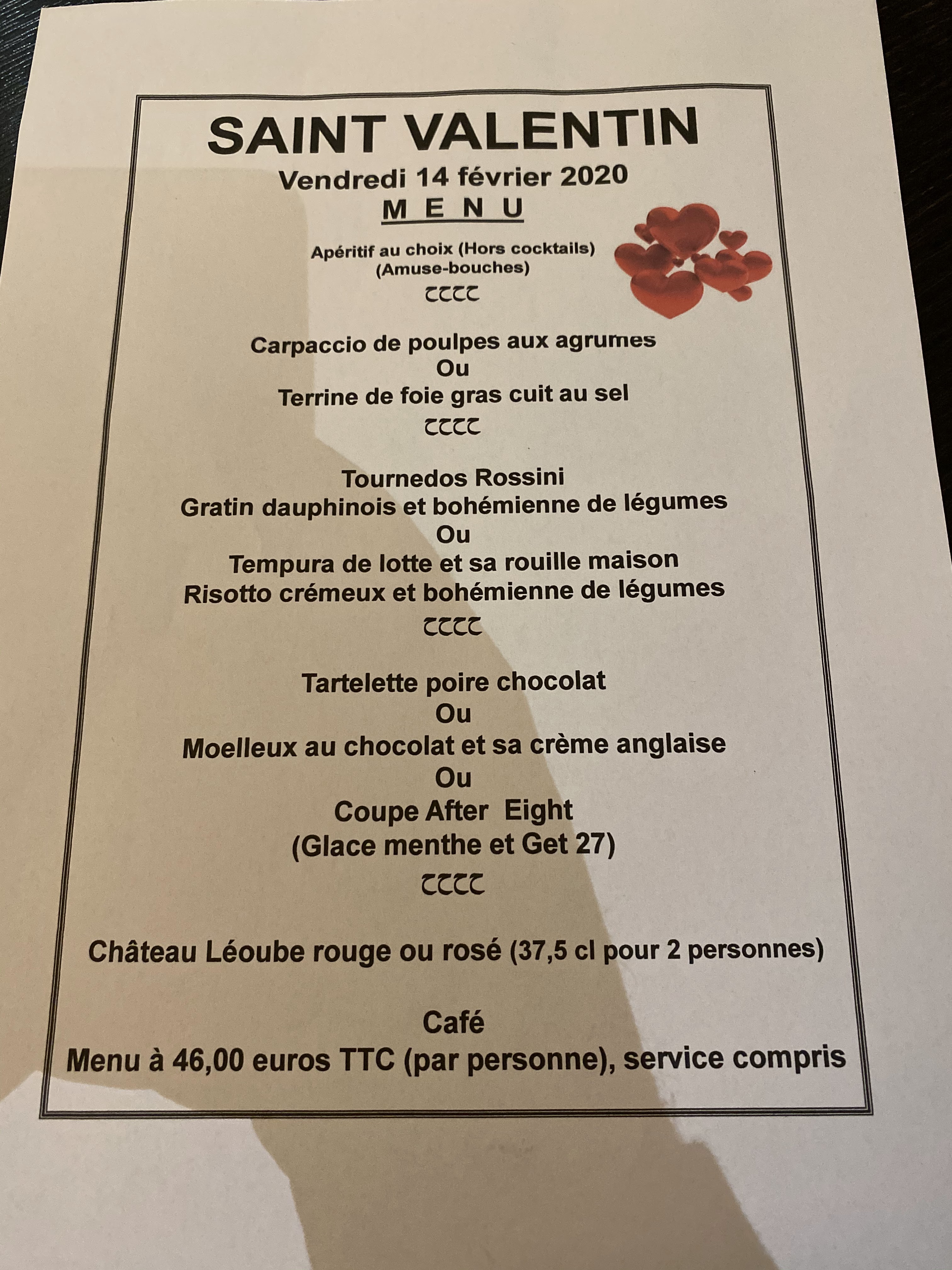 Lundi 6 mars. Une petite faim nous appelle pour ce restaurant. Plat du jour : gigot d agneau grillé et légumes salade. Dessert : profiteroles maison... résultat : un super repas servi par un personnel souriant accueillant... bref tout ce que l on aime attendre dans un resto. Je recommande vivement. Continuez ainsi