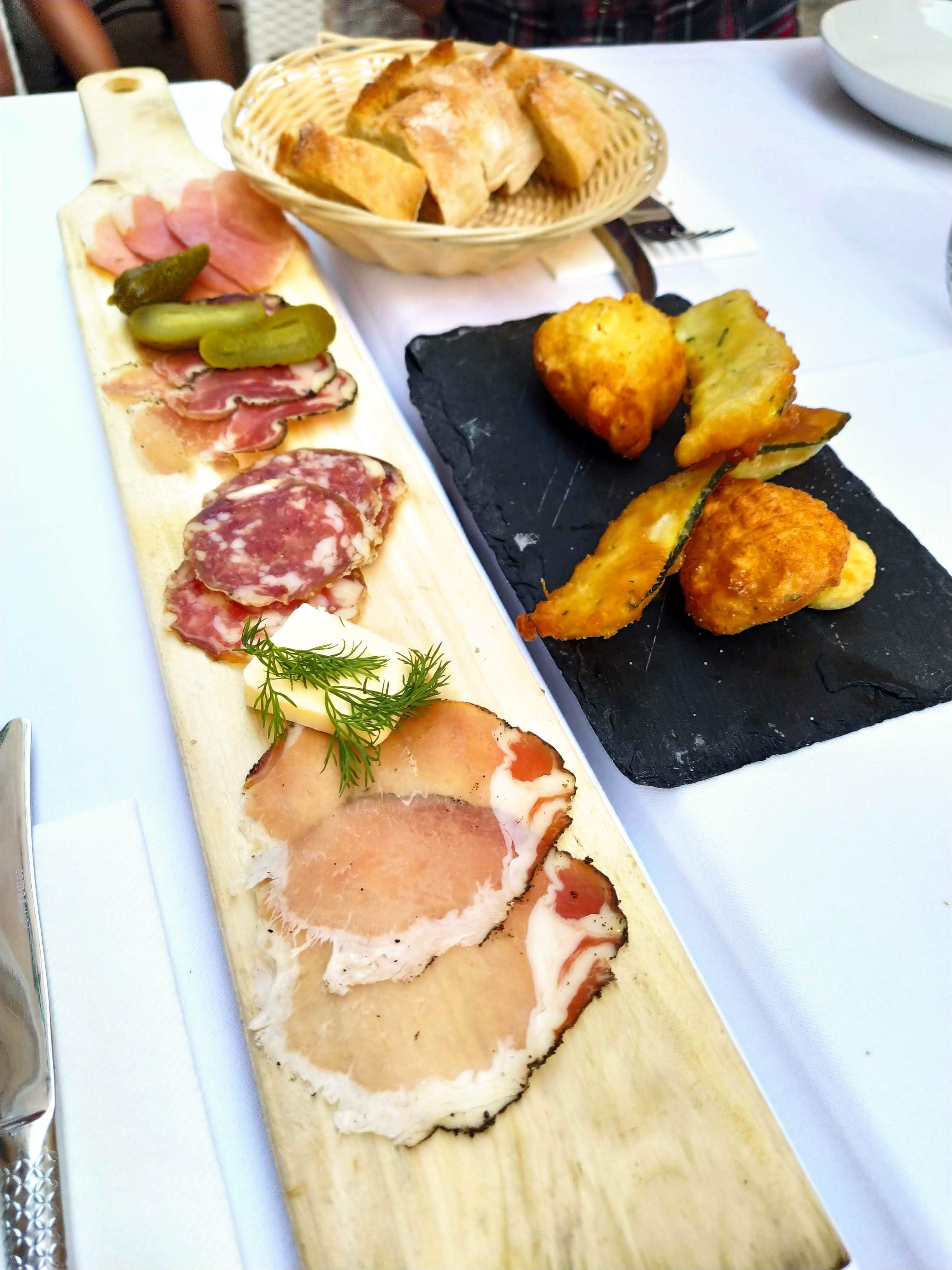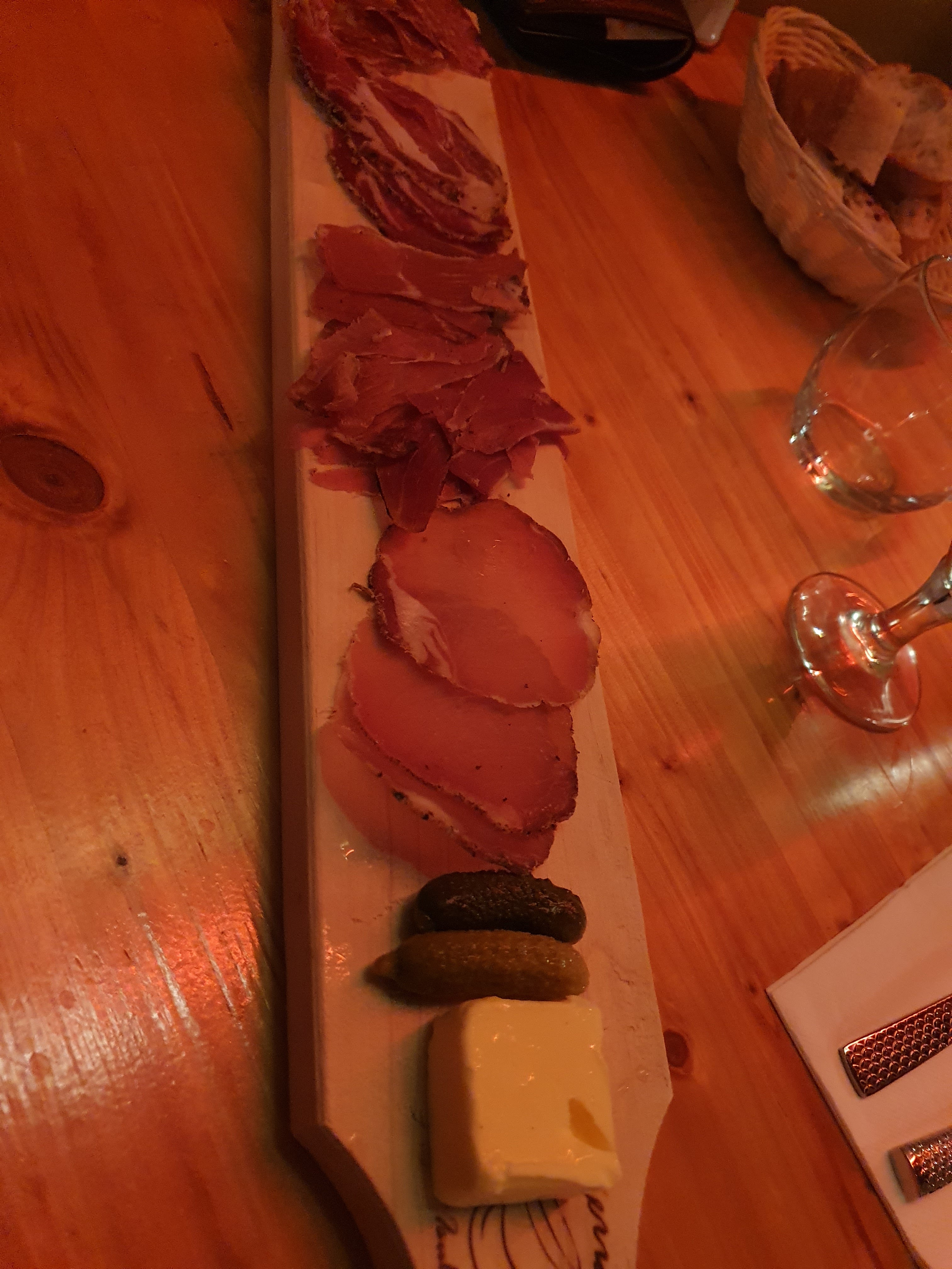 Produits exclusivement locaux d'excellente qualité (charcuterie, fromage ,viande, vins...). Nous avons pu déguster une excellente planche de charcuterie/fromage, une poire de veau excellente et cuite a la perfection, des desserts maison succulents : je recommande sans modération d'autant que Julien et son équipe sont adorables et d'excellent conseil