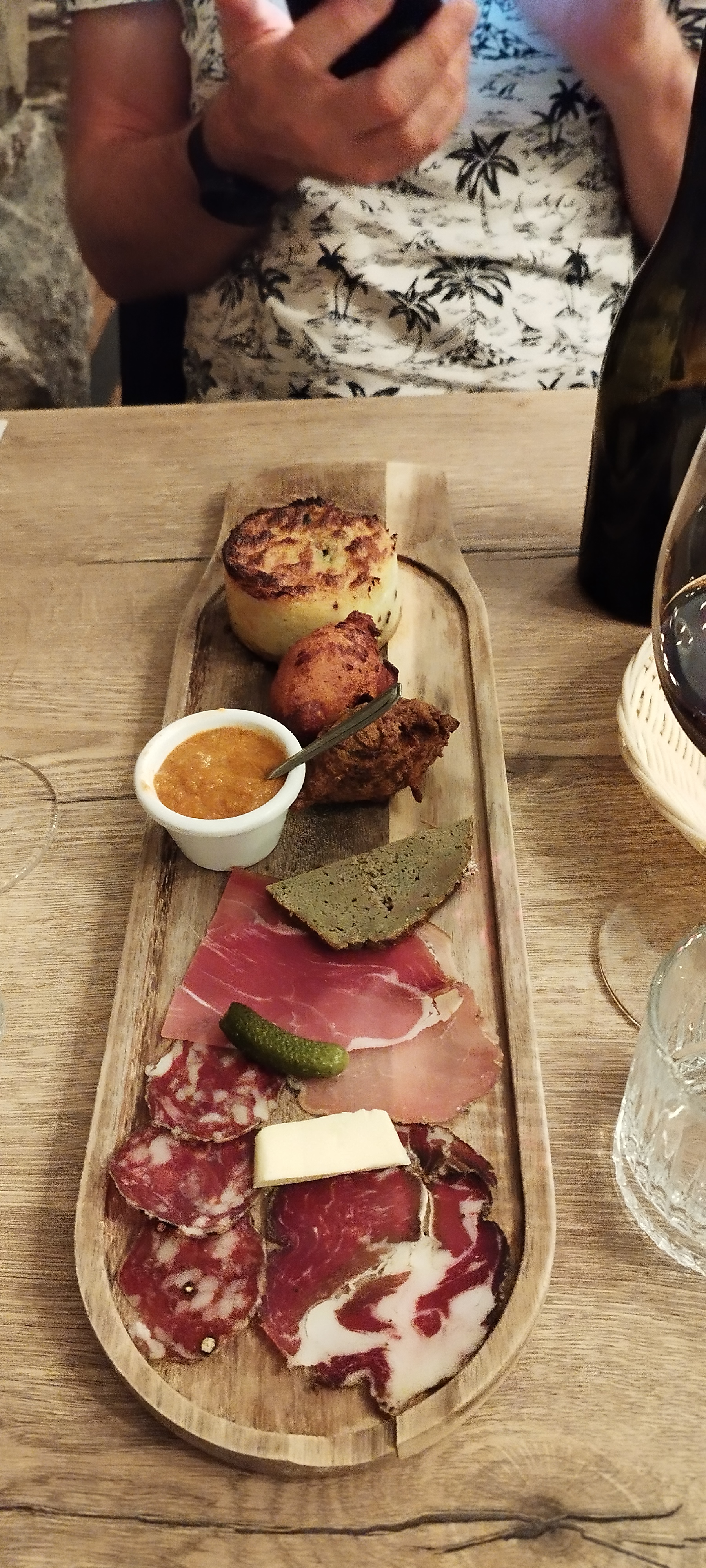 Très bon accueil apperitif vin corse sublime. Plat de charcuterie local hum!! Le vin rouge au verre pris celui de la région très fruité. Très bon repas .