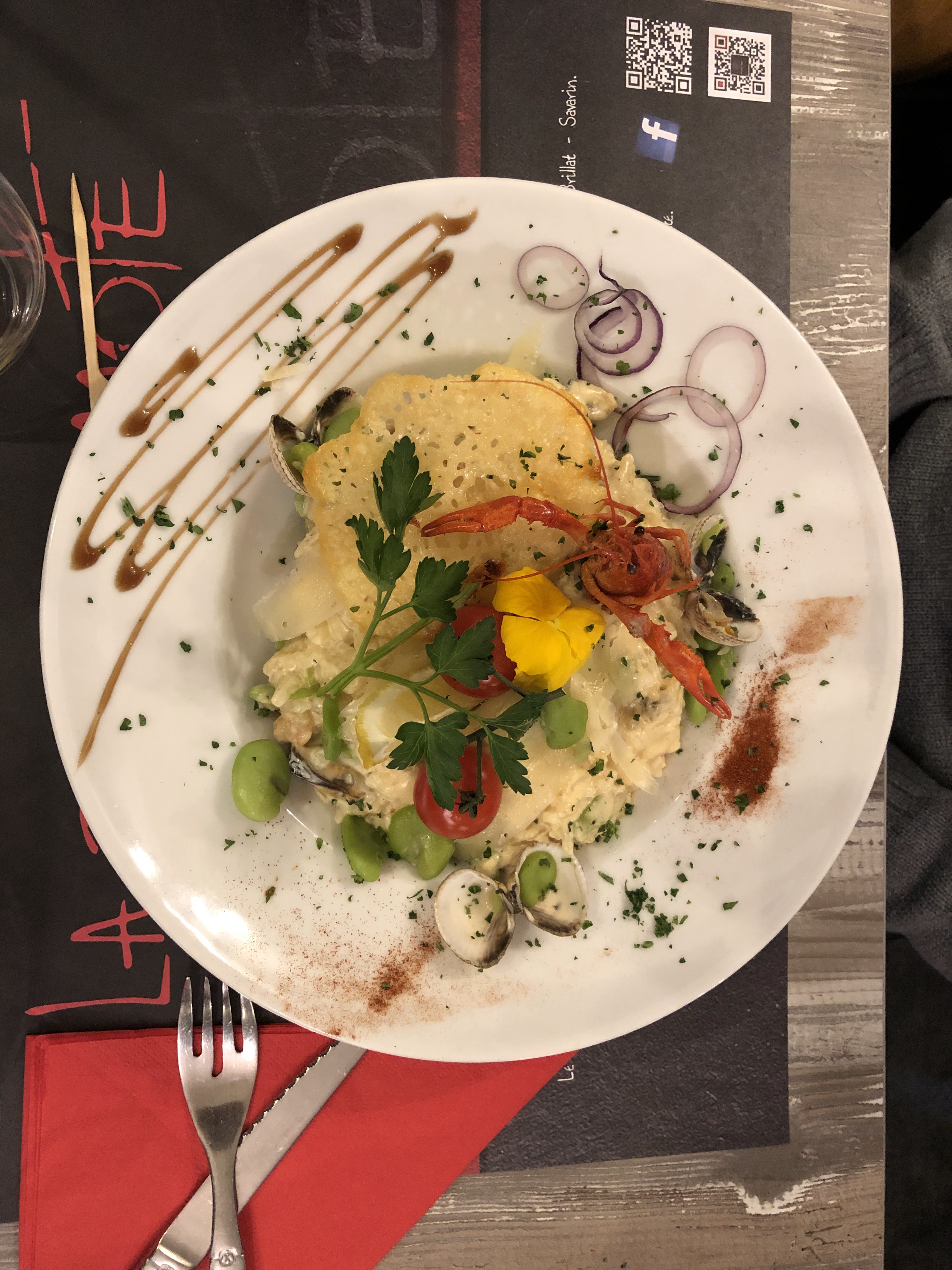 La cassolette de la mer est garnie d'une crevette non décortiquée, surprenant quand le patron nous explique qu'elle n'est pas faite pour être mangée mais en decoration. Je ne voulais pas aller au musée à contempler la decoration mais aller au restaurant. Je suis impatient de découvrir leur prochaine pizza au chorizo avec la peau. Rondelles à retirer bien sur car uniquement décoratives On a beau expliquer au patron, il est vindicatif, il vous prend de haut . Il ne fait pas preuve d'intelligence pour satisfaire ses clients . Dommage car le personnel est bien sympathique