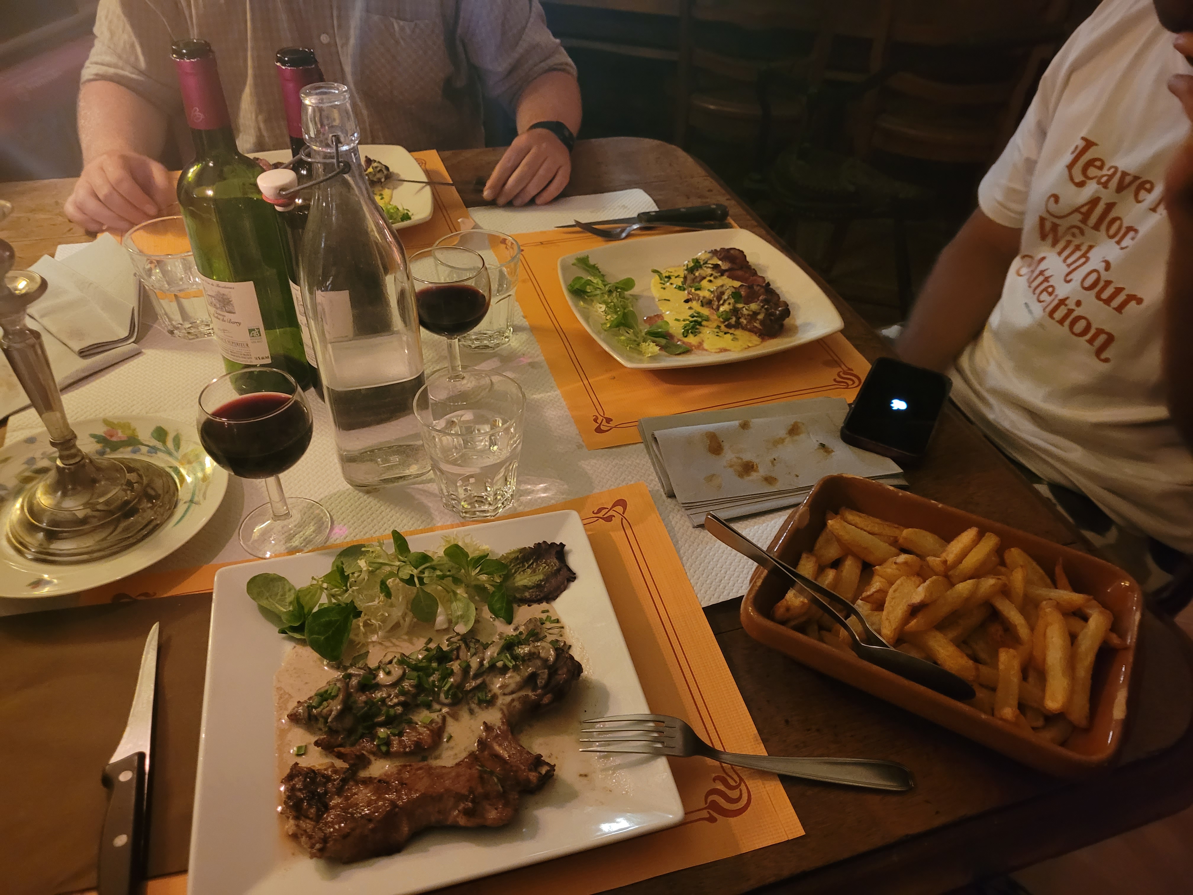 Ambiance : concept de tradition ancienne nel Ferme française, typique de la région. Vous avez l'impression d'entrer dans la maison de votre arrière-arrière-grand-mère. C'est cosy, ambiance familiale, chaleureuse, aux chandelles uniquement (j'ai failli m'endormir après le dîner) Nous avons pris le menu, c'est surtout de la cuisine française traditionnelle avec beaucoup de viande, essentiellement du veau, du bœuf et du canard, et des oiseaux. Tout est cuisiné SUR POINT, la qualité de la viande est vraiment bonne (on sait quand on a envie de manger du gras) et la serveuse était vraiment drôle et adorable. J'ai adoré le fait qu'il y ait des plantes partout, l'endroit est mystérieux et étonnamment grand en fait. En fait, c'est la première fois que je donne 5 étoiles à quelqu'un de toute ma vie. Le prix est VRAIMENT BON pour ce que vous obtenez. Mais je pense aussi que c'est un prix raisonnable. Tout le monde devrait vraiment... vraiment servir ce niveau minimum de qualité.