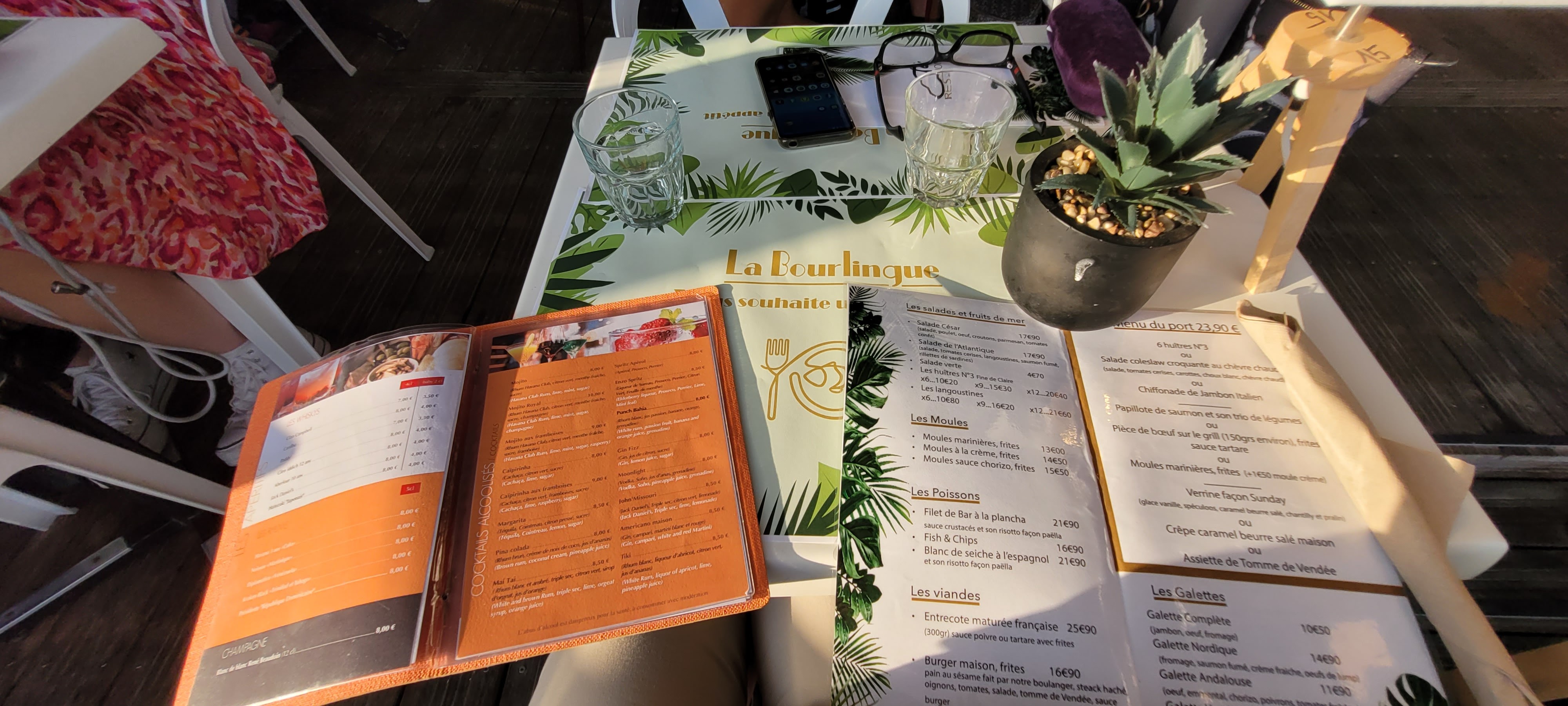 Les moules a la crème sont une tuerie d après ma femme, pour ma par j ai pris une crêpe andalouse très bonne et assez copieuse. Les dessert sont très bon , nous avons pris deux glaces et la quantité est la ( nous avons eu du mal a finir ). Très bon morito par contre la pina colada est basic.concernant l équipe elle est d une grande gentillesse et sont rapide dans la prise de commande. Bon petit resto sur le port de bourgenay sue je vous conseil pour le cadre et l accueil.