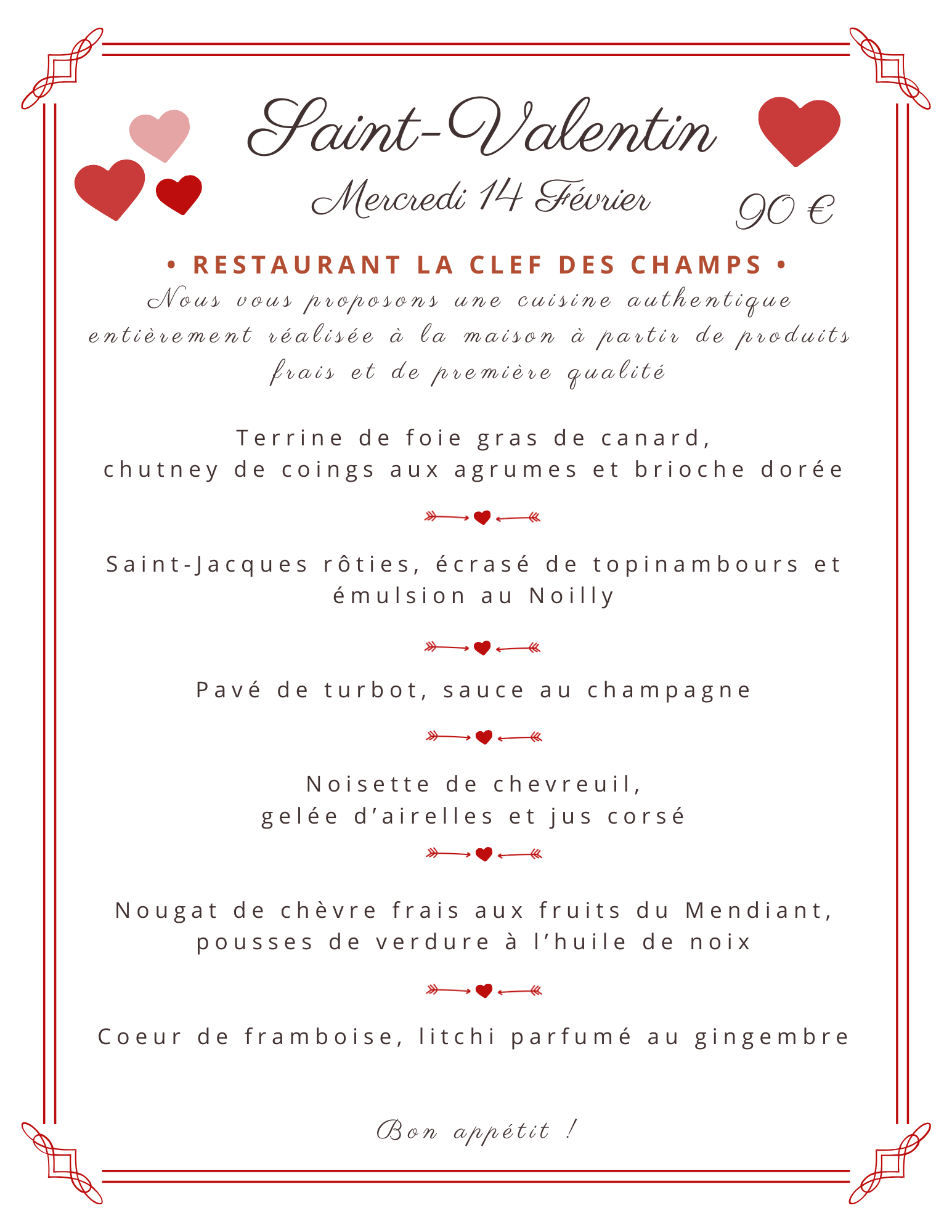 Posté le 04/12/2023 à 09:40"Les soirées passées à la Clef des Champs sont toujours excellentes, aussi bien en terme de repas, plats délit, qu’en terme de service!"