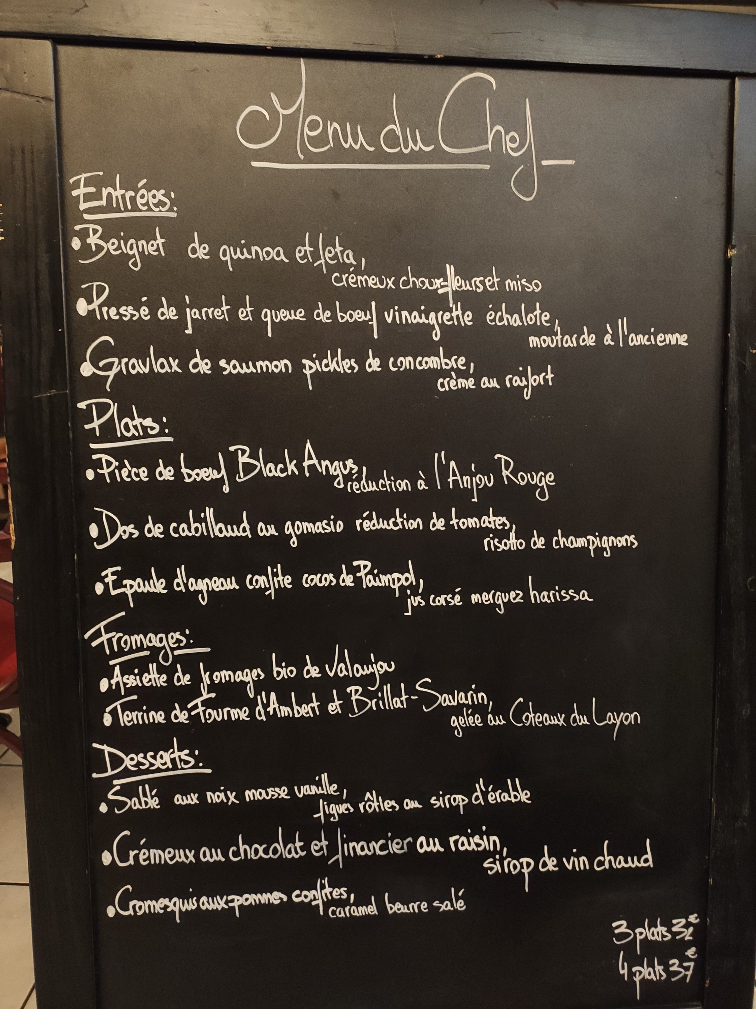Excellent! Des plats sur l'on ne mange pas à la maison, des profuits frais et de saison, des produits locaux, un service très sympathique. Nous nous sommes régalés de l'entrée au dessert. Je recommande !