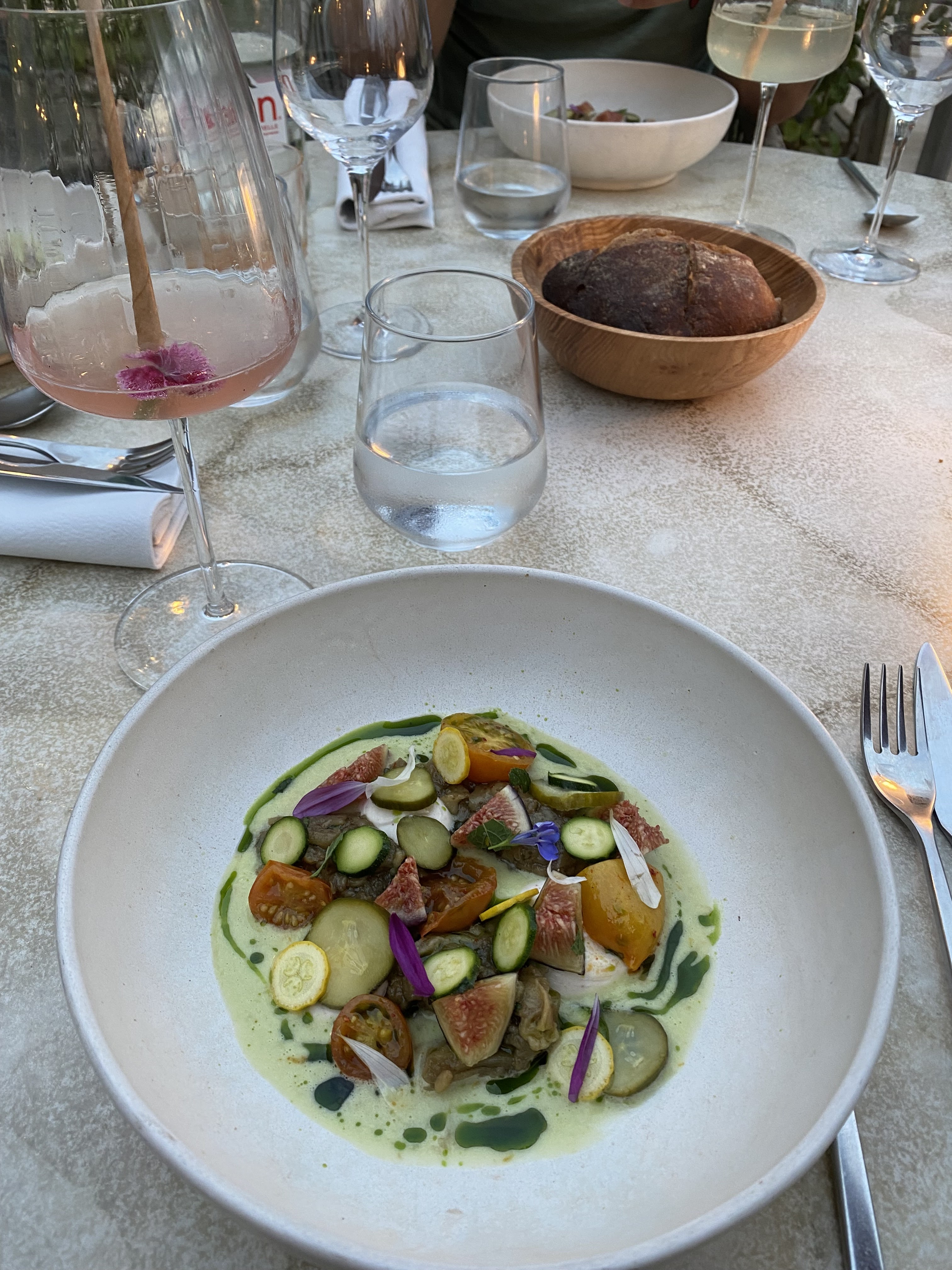 Un excellent moment! C'est dans cette bâtisse du XVII siècle que Martin Vial, Laura Rulens et leur équipe, travaillent des produits de saison et de producteurs locaux. Lorsque le temps le permet, vous pouvez déjeuner ou dîner sur leur grande terrasse qui offre une superbe vue panoramique sur le château de la ville. Bravo à vous tous pour la qualité des plats et du service, nous avons passé un très bon moment et nous ne manquerons pas de revenir lorsque nous retournerons à Semur. Au menu ce jour: Entrées Effiloché des premières aubergines du Moulin de Braux à la menthe poivrée Coulis de tomates green zébra / Caillé de vache / Figues de Mont Saint-Jean Émietté de tourteau breton / Gingembre bio du Potager des Bergeries Gelée de la nage de cuisson / Mayonnaise à l’huile de gingembre Plats Cannette des Dombes rôtie / Sucrine farcie des cuisses / Suc d'oignon / Betterave de Mont Saint-Jean / vinaigrette à la pulpe de mirabelle Turbot sauvage de nos côtes cuit sur l’arrête / Tartare de coques et couteaux à la laitue de mer Mini fenouil bio d’Etienne / Daïshi monté au beurre Desserts Abricot de la Drôme rôti au miel de Tilleul / Bavaroise abricot / Sorbet fromage blanc Jus d’abricot au poivre de Madagascar Ganache montée chocolat Jivara / Crème glacée pécan / Caramel beurre salé Lait brioché Le vin choisi pour ce repas: Le Hautes Côtes de Beaune 2021 d'Elodie Roy ! Une petite merveille de souplesse qui a su accompagner nos entrées et nos plats ;)