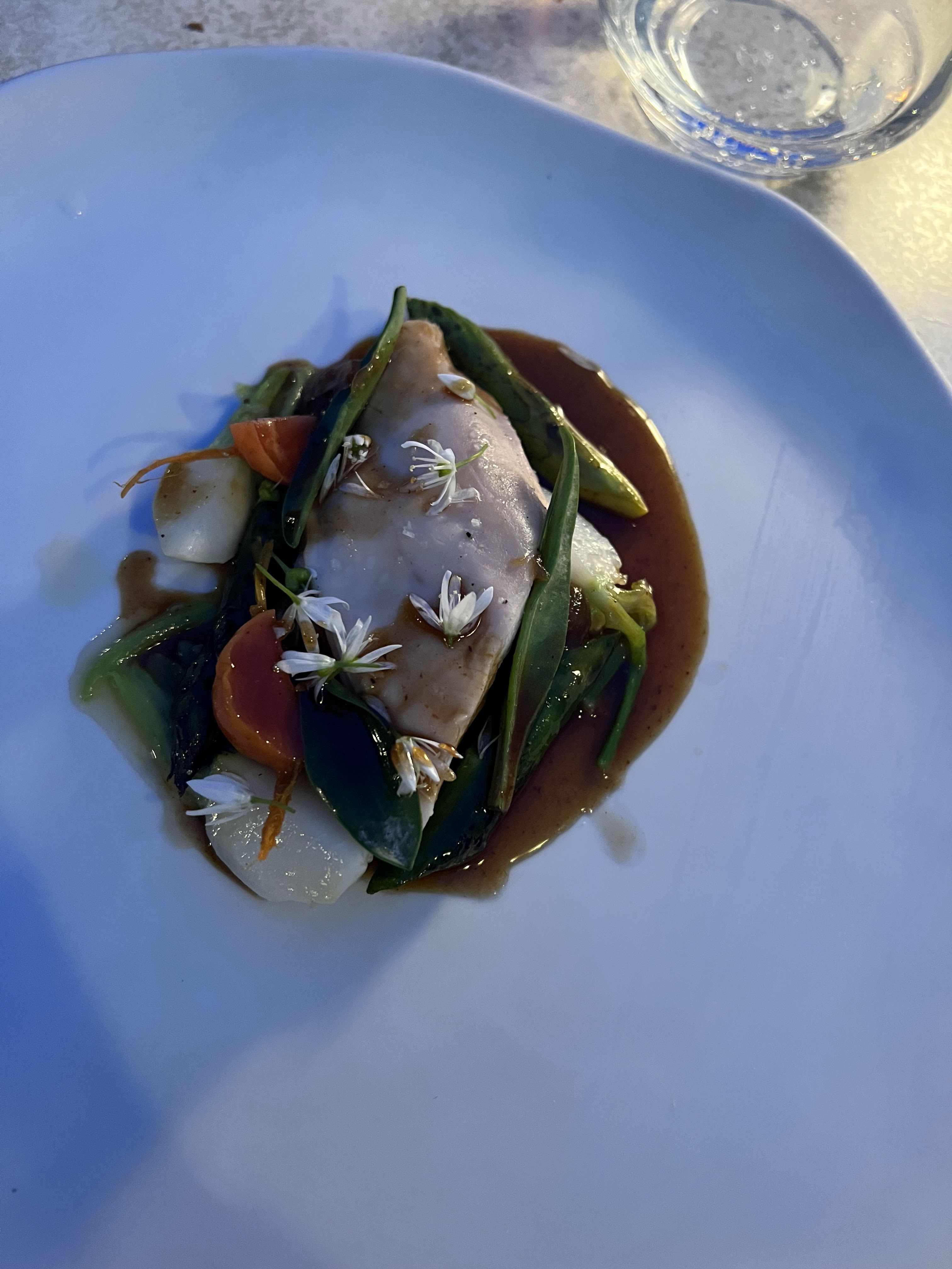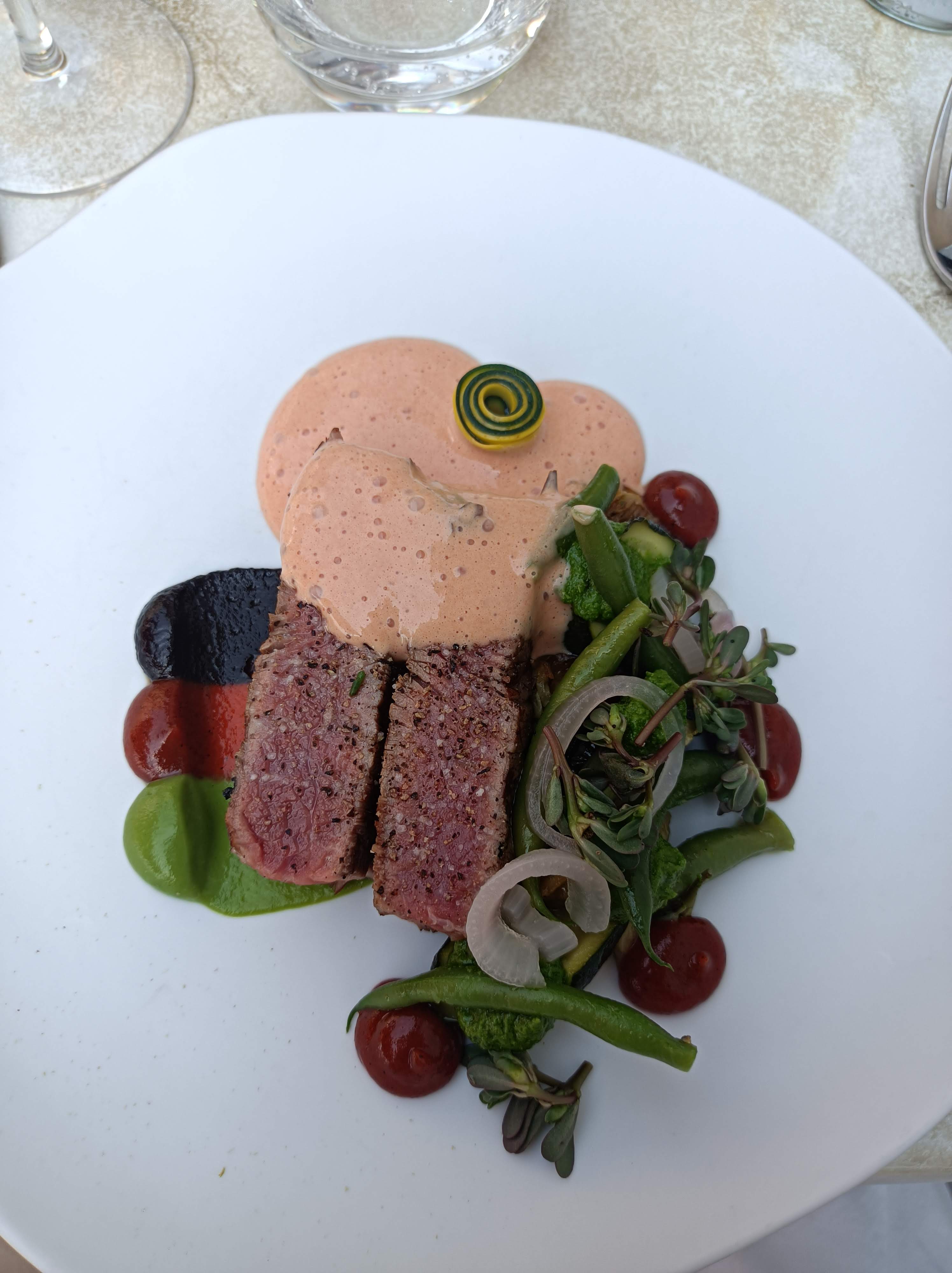 Magnifique endroit avec une terrasse incroyable Accueil très sympathique et service prévenant. Le chef n’hésite pas à être en salle Menu 5 services à 60€ Le chef aime les goûts marqués, l’acidité est présente, comme les épices. Mignardises : classiques et locales . La « façon meurette » est délicieuse. La bisque divine. Courgettes, chèvre, curry, fleurs. Très joli, bien relevé et très bon ! Le curry est cependant Sans doute un peu trop marqué pour tout le monde (mais pas pour nous) Sandre, courgettes, tomates cebettes, crème. Cuisson parfaite. À nouveau une pointe d’acidité. Bœuf mâturé poireaux pomme de terre pourpier Sauce poivron miso. À nouveau goût très marqué (dominance du poivron) Dommage que la viande soit tiède. La cerise, sorbet, émulsion amandes, praliné. Délicieux Au vu du cadre et de l’assiette, pas très loin des standards de l’étoile.