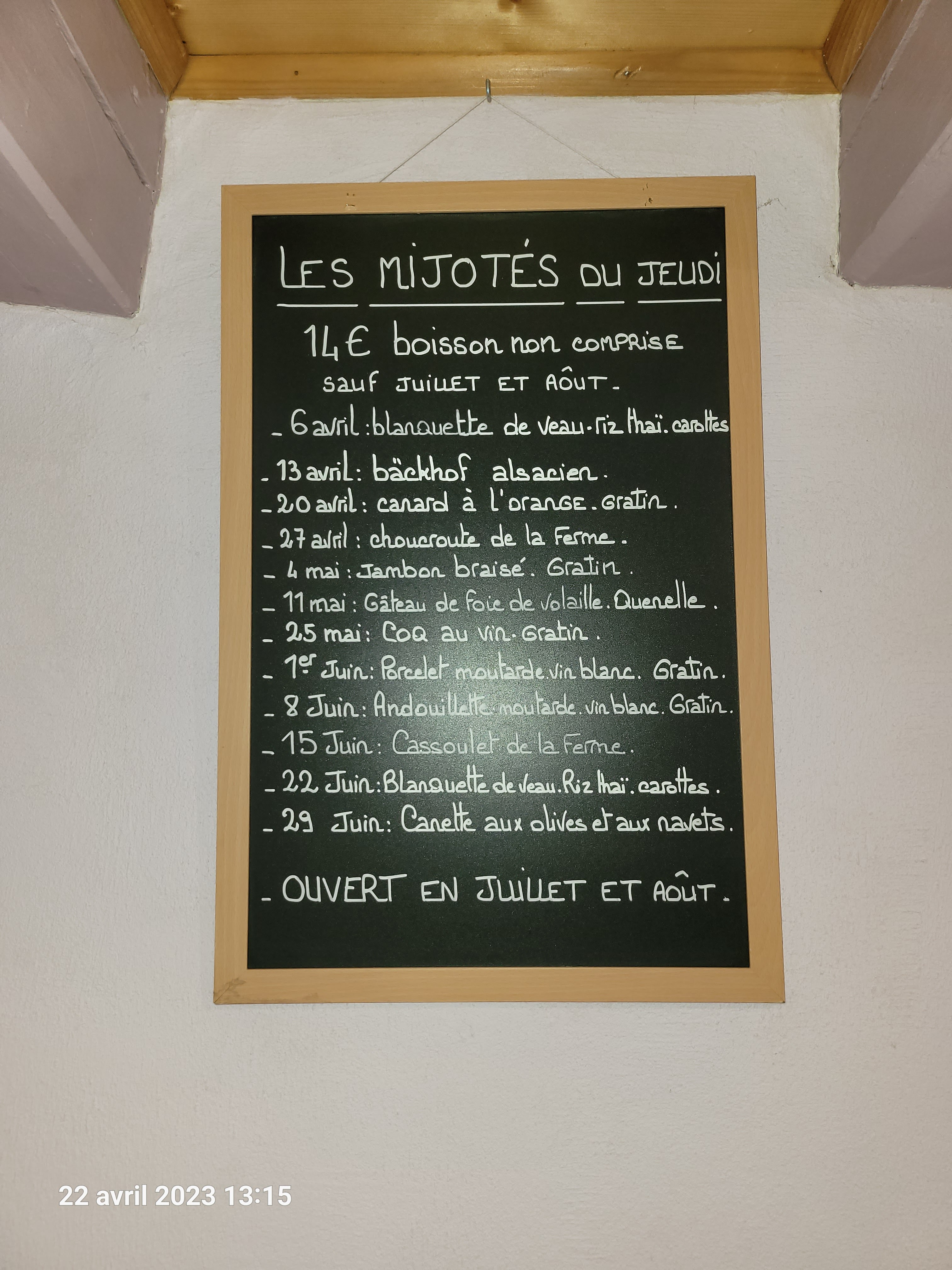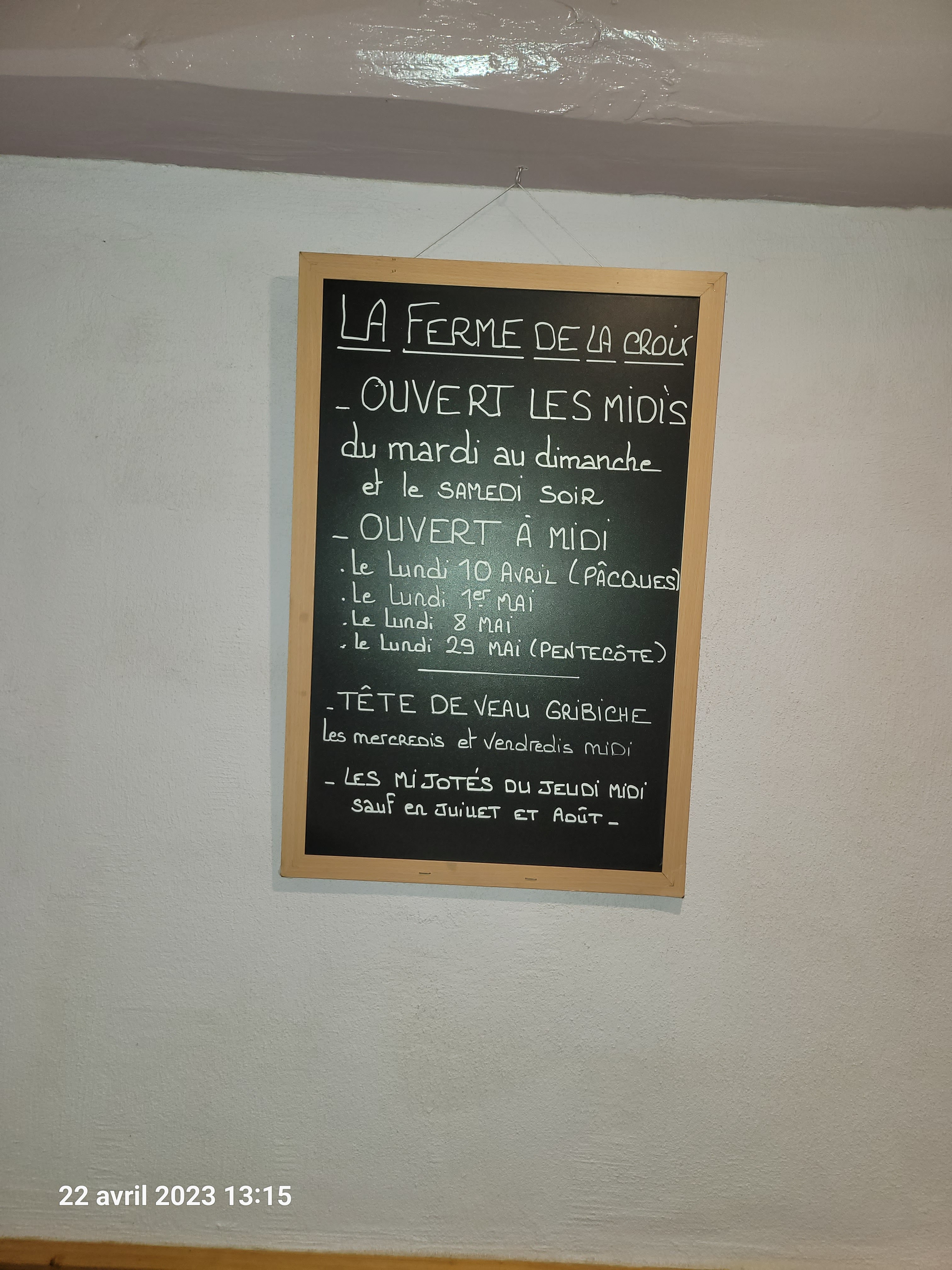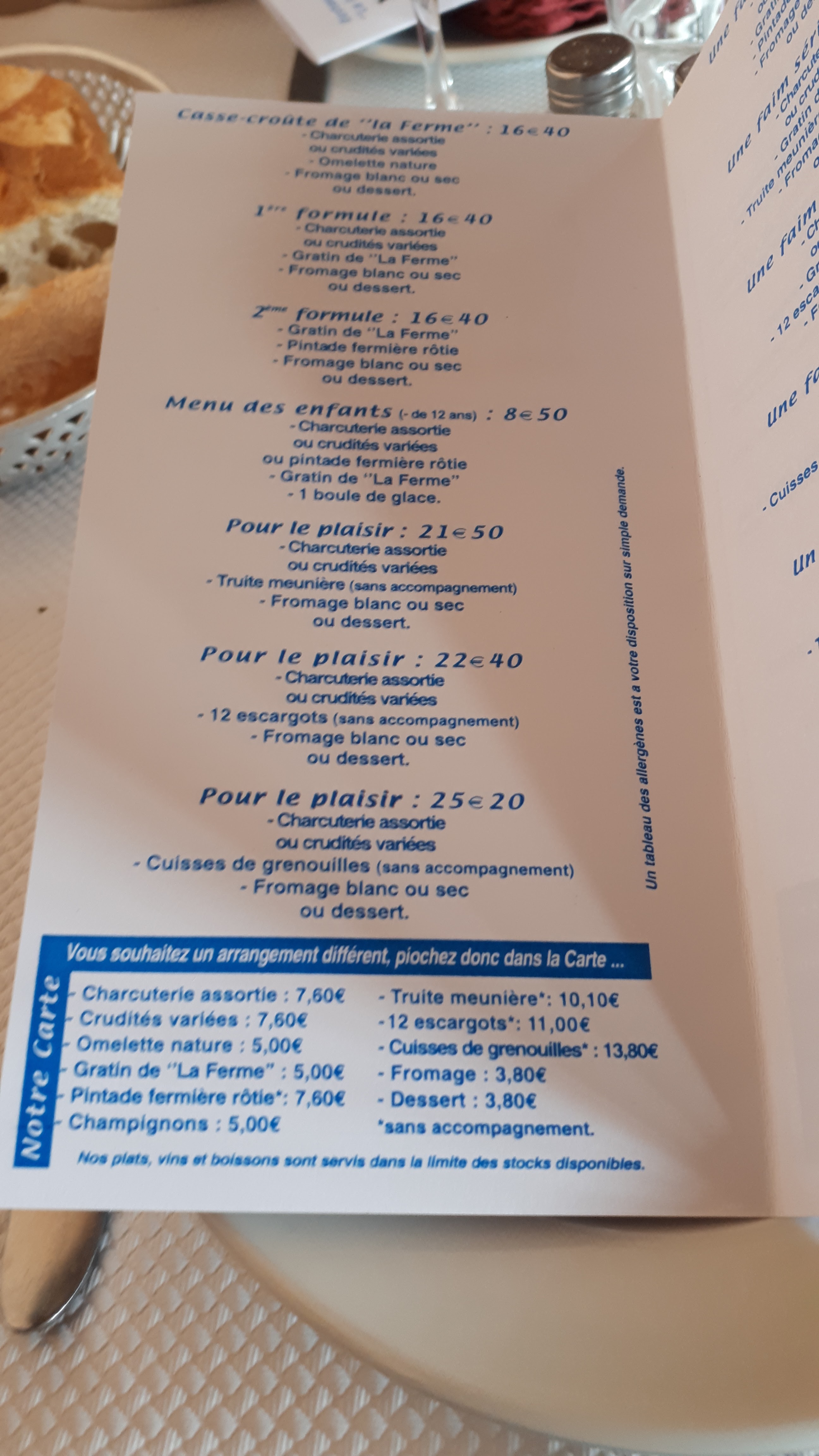 Bonjour, j’appelle cela de l’acharnement, car ça semble être la même table qui laisse le même type de commentaire. Les grenouilles ! Cuites à point ? Salées à point ? Chaudes ? Bon tant mieux ! Je répète : nous avons une carte de vins très élaboré avec 120 références, même si la serveuse a oublié de vous donner la carte de vins, vous avez bien dû voir que les autres tables avaient des bouteilles... car vous semblez avoir l’œil à tout. Mais peut être préfèreriez-vous la carafe d’eau ! Je n’ai pas eu connaissance d’un manque de desserts, quoi qu’il en soit nous n’en avons que 3 : vacherin glacé, nougat glacé et la coupe de la ferme, et bien sûr les glaces excellentes « Maître Artisan ». Alors si vous dites qu’il en manquait plusieurs ça signifie qu’il n’y en avait point et donc personne n’aurait eu de desserts ! Ça se serait su... très curieux ! Les enfants : il faut toujours les surveiller; on est au bord de la Départementale 62 ! Et l’accès handicapé, a, hier encore bien convenu aux 8 personnes en fauteuil qui ont déjeuné et profité de la terrasse. Les charcuteries de la planche sont locales et artisanales mais apparement pas à votre goût ! Possible. Je comprends bien que la prochaine fois vous irez ou c’est mieux et pas plus cher. Tout à fait logique ! Mais on a bien conscience qu’on ne peut pas plaire à tout le monde. Bonne journée.