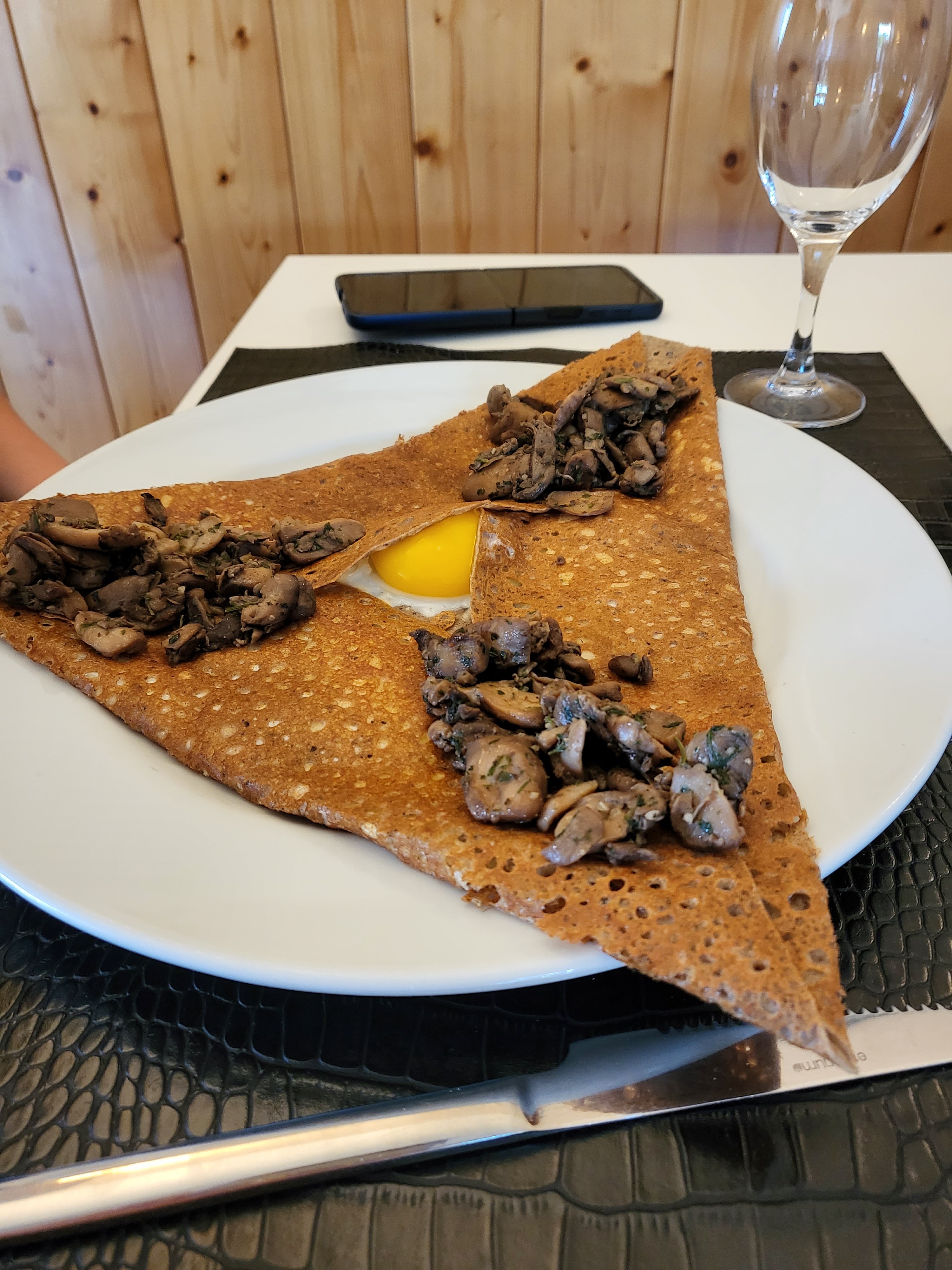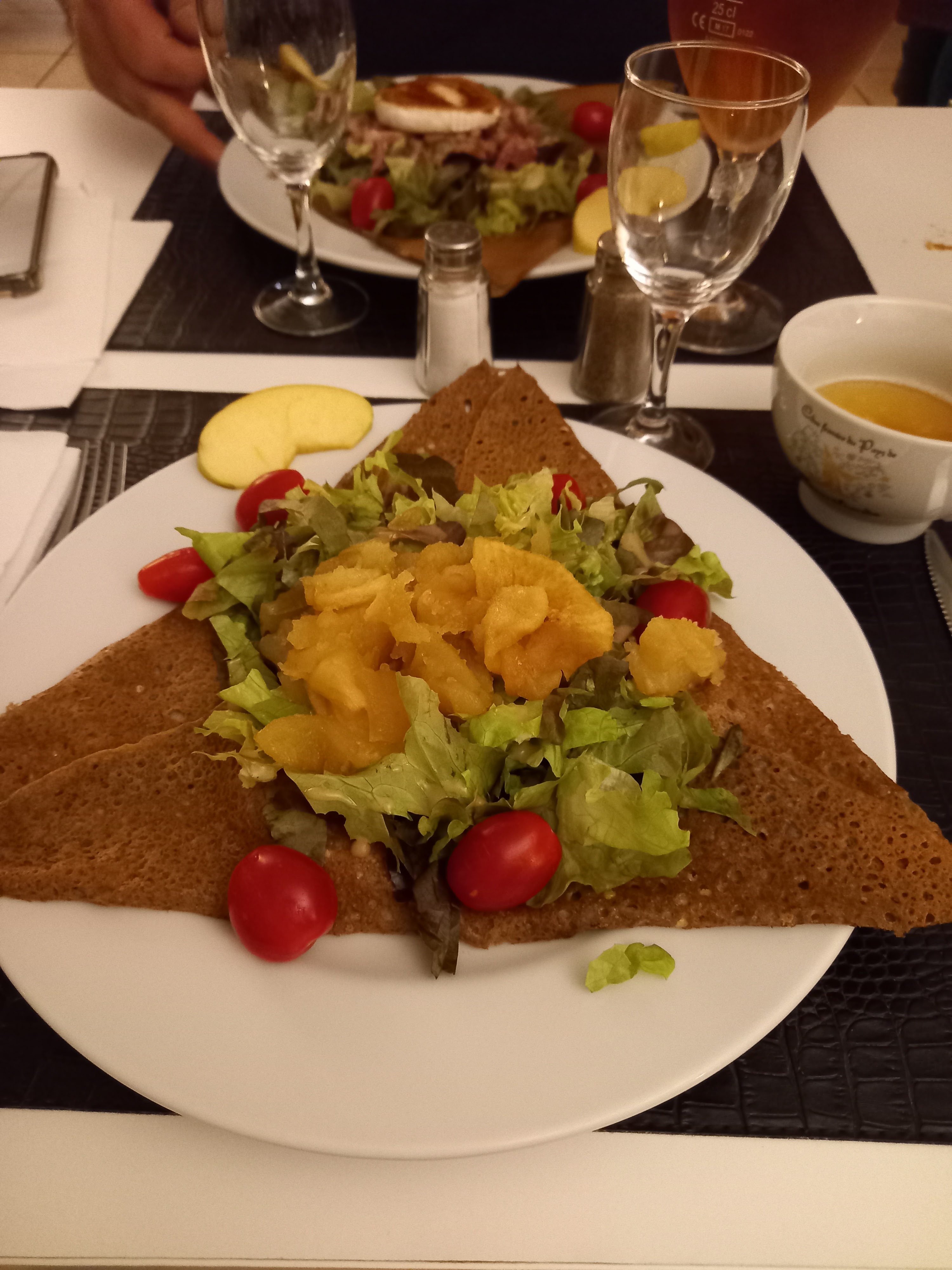 Ambiance chaleureuse (avec un soleil radieux, ça joue) et repas exquis : crêpe complète goûteuse et généreuse. Dessert dans le salon de jardin, au soleil, le long de la baie vitrée (à l'intérieur car trop de vent tout de même). J'ai passé un moment de déjeuner parfait ! Merci 🙏🏼