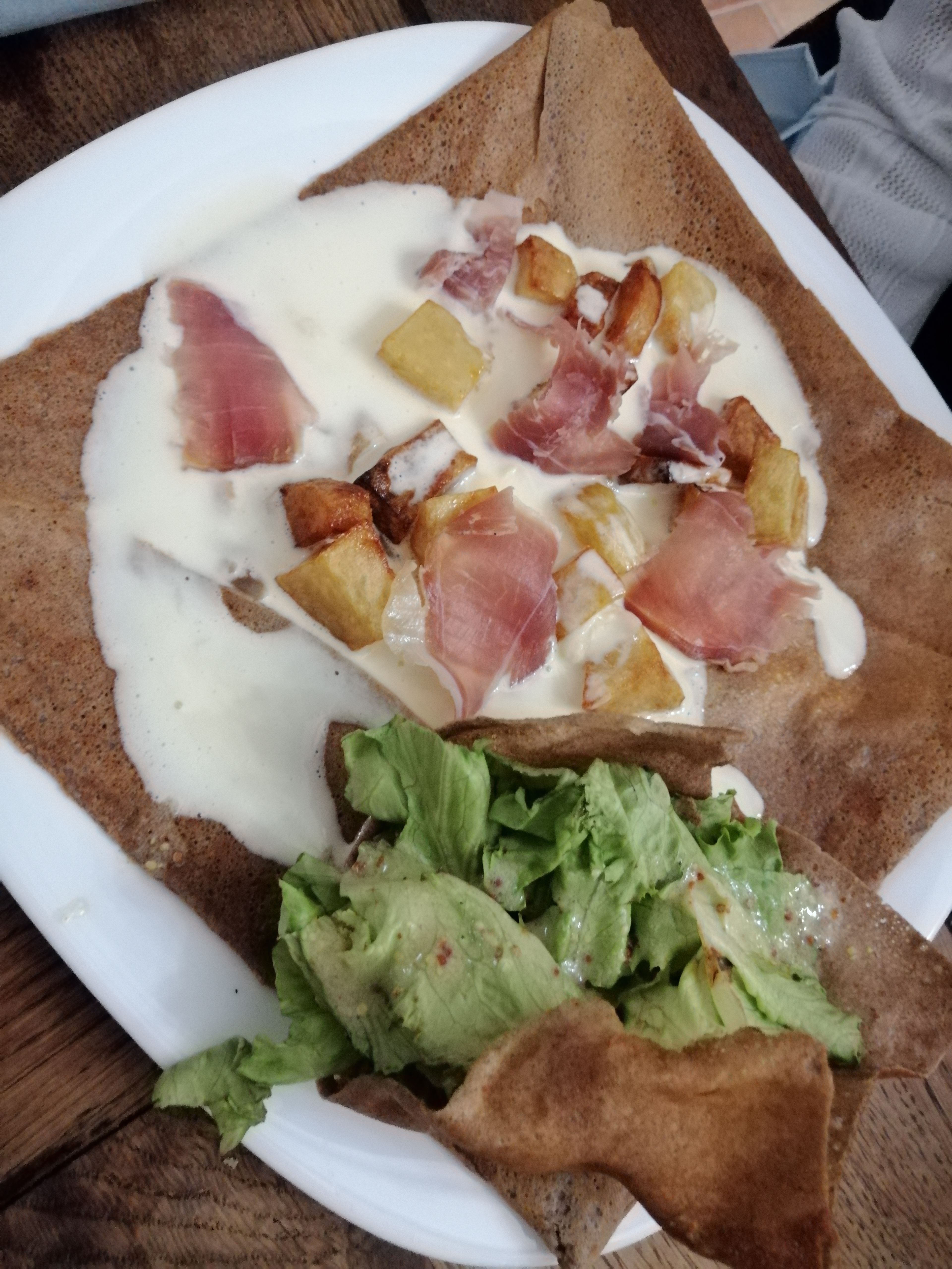 Menu assez copieux et assez fin. Bonnes propositions du terroir : terrine de poisson maison, foi gras maison.... Les galettes sont très fines et gouteuseuses avec de belles présentations. Cardre verdoyant en été qui égaye une sortie au restau surtout en cette année 2021. Les glaces Les Alpes son maison aussi.