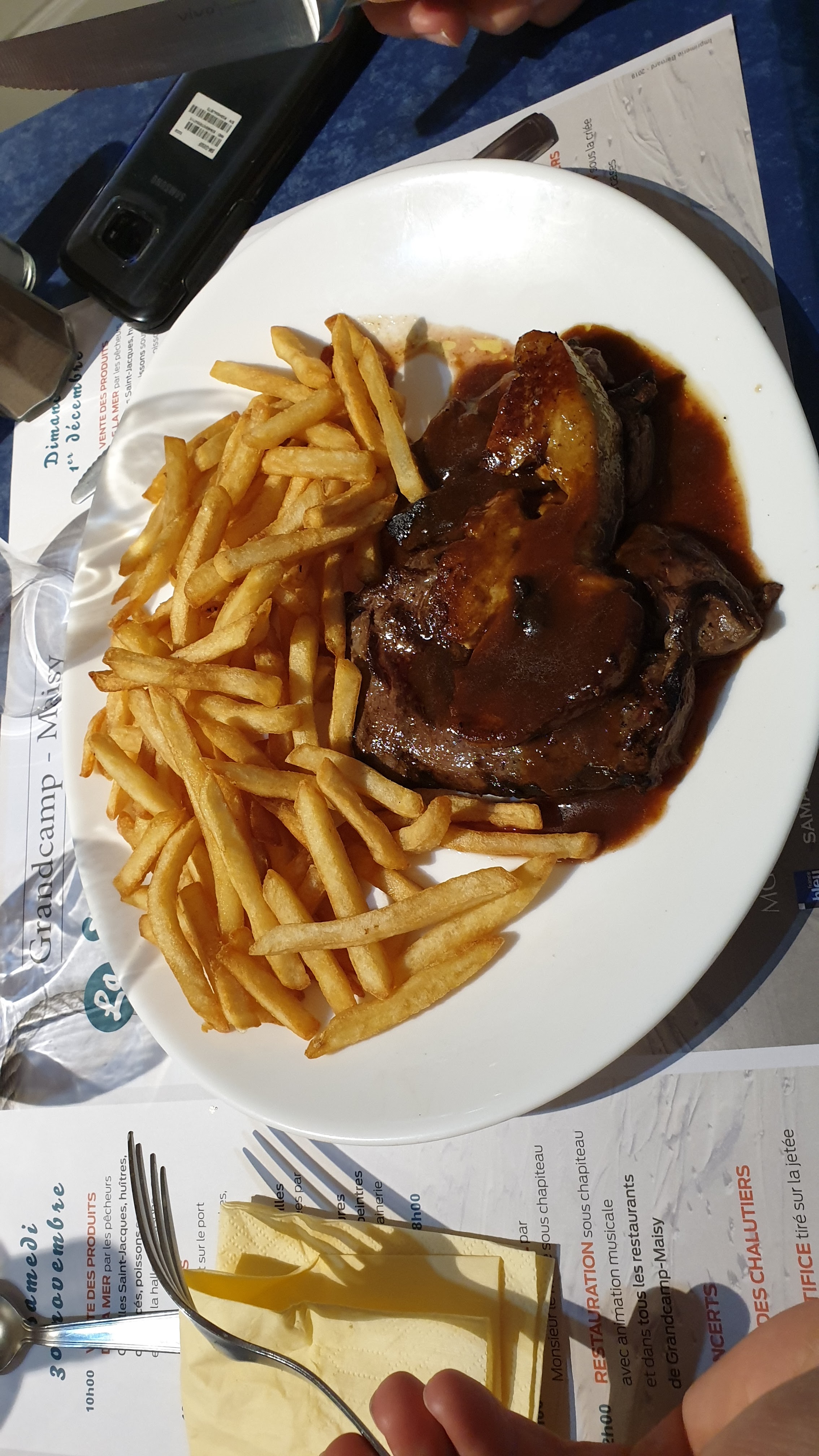 Assez déçus, nous avons pris des moules frites à emporter. Trop de frites beaucoup trop cuites et sèches (reste réchauffés du midi ?), les moules étaient bonnes mais mal lavées. Portions (trop) généreuse en frites, mais vraiment trop justes en moules. Dommage.