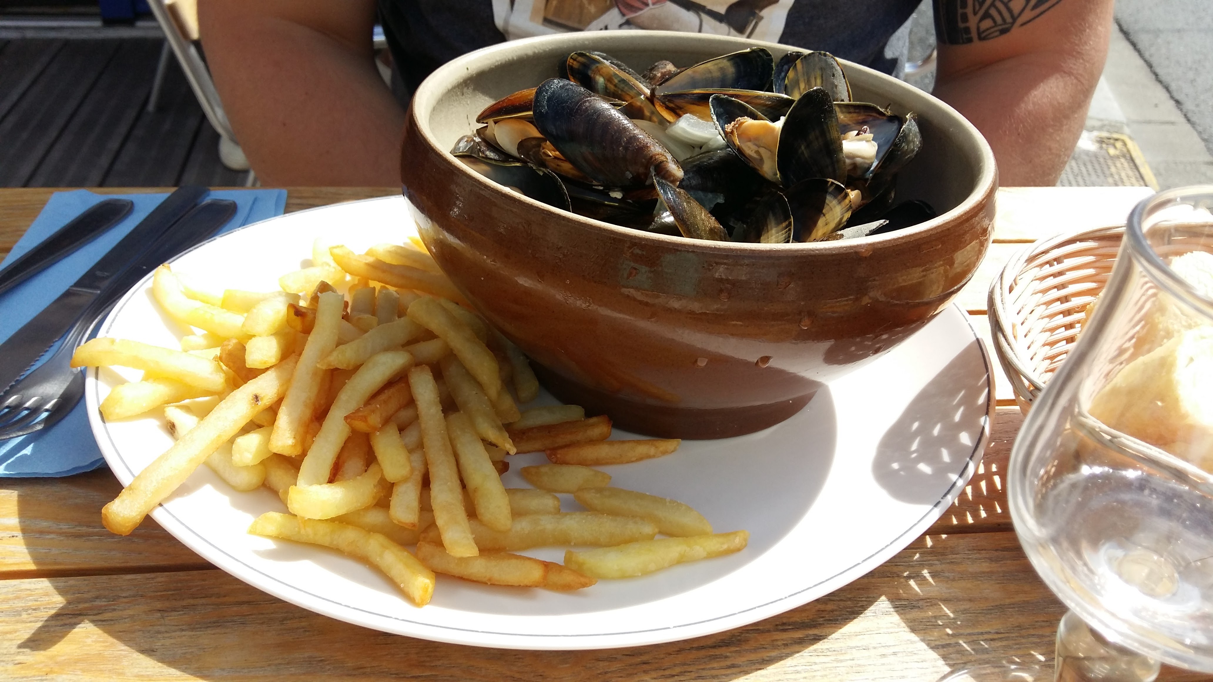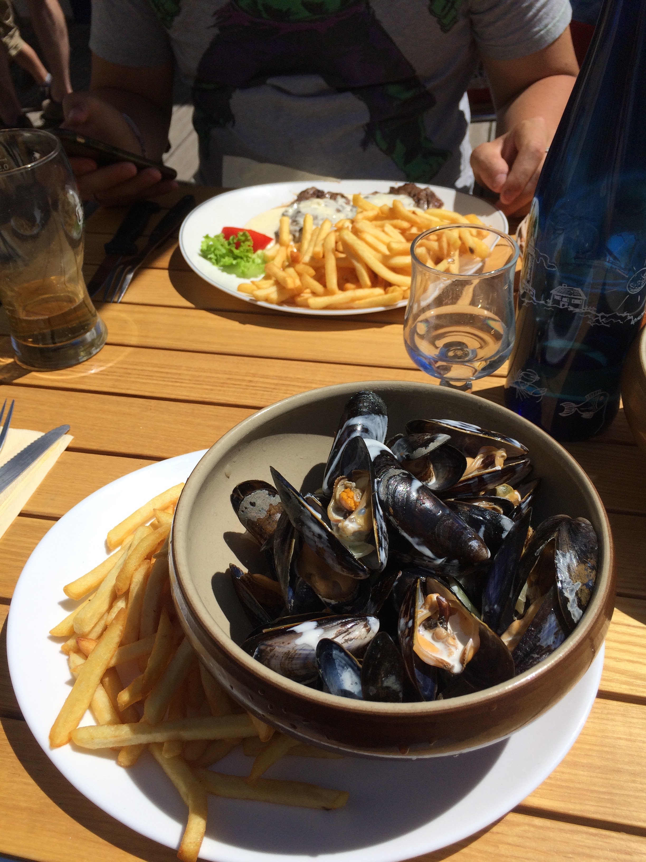 Le restaurateur a refusé que nous mangions en terrasse car il avait peur que nous partions sans payer. J'ai mangé des moules frites et j'ai regretté qu'il ait si peu de frites et surtout surgelés. Le serveur nous a demandé de manger rapidement pour libérer les tables. Quant aux toilettes elle était bien présente mais impossible de s'y rendre car réservé pour le personnel. On se sent à l'étroit dans la salle car elle est très petite.