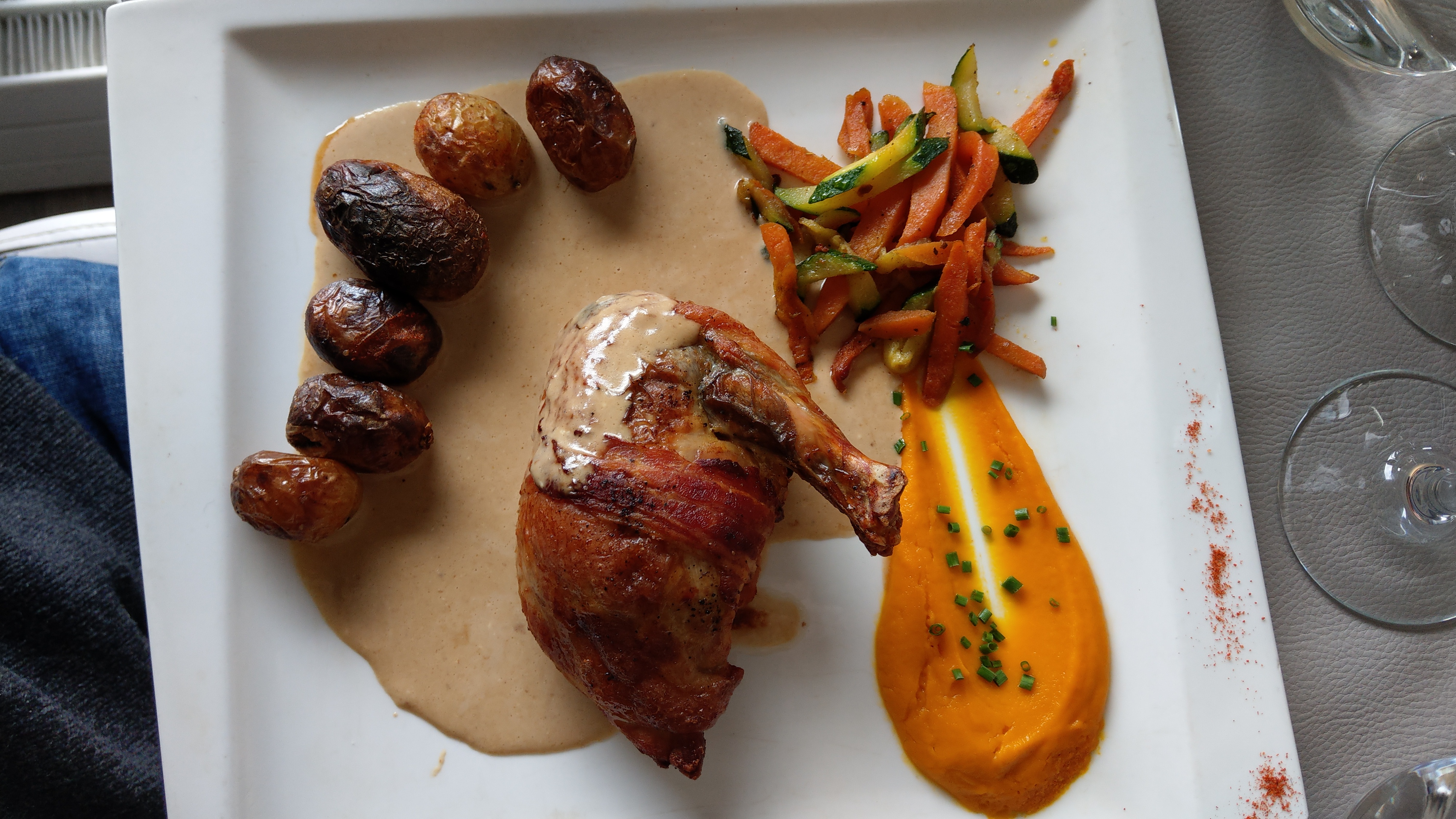 Posté le 16/10/2022 à 13:56"Entrées caille pomme framboise et foie gras avec pain brioché sec et froid. Plats très bons et copieux magret frites de patates douces et joue de porc et pomme de terre grenaille. Dessert correct."