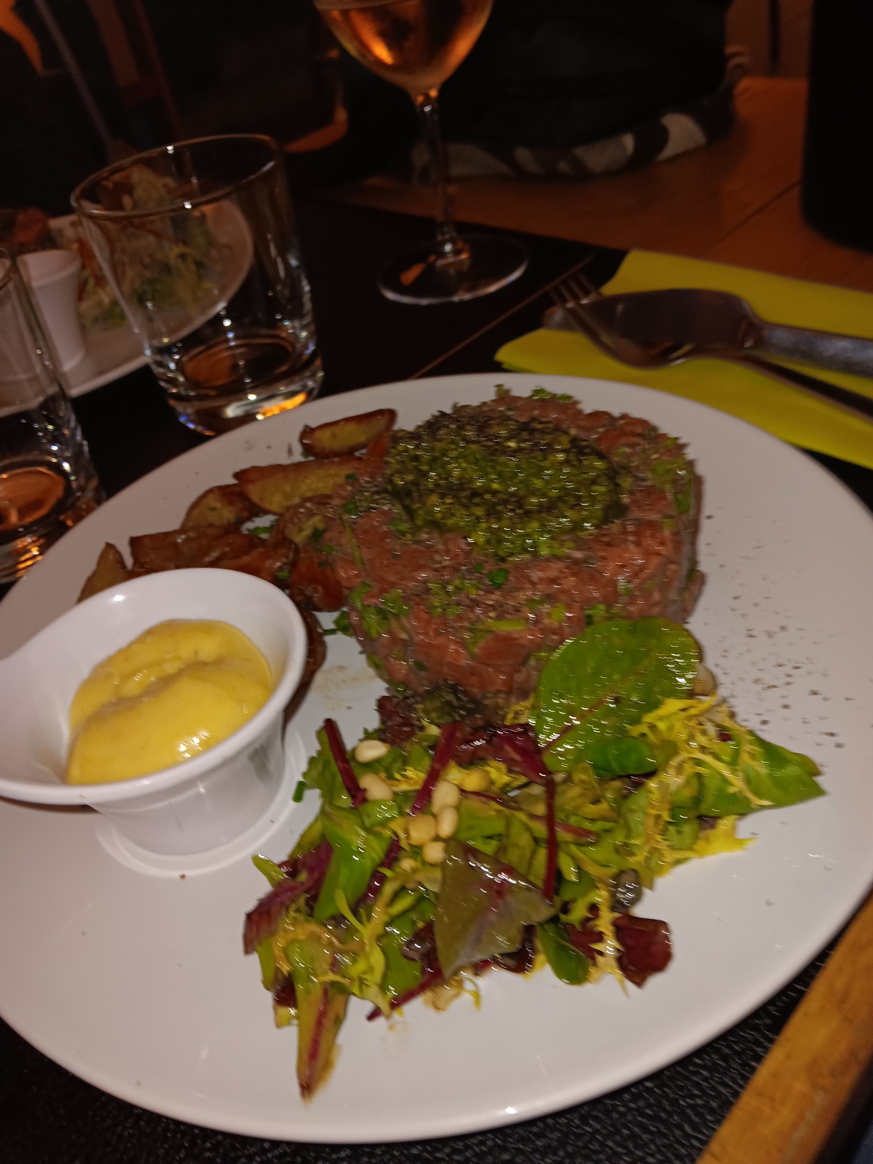 Lieu très convivial, avec un tartare au couteau à se damner! Produits frais et de saison! Je recommande et j'ai hâte d'y retourner dès que j'en aurais à nouveau le droit!