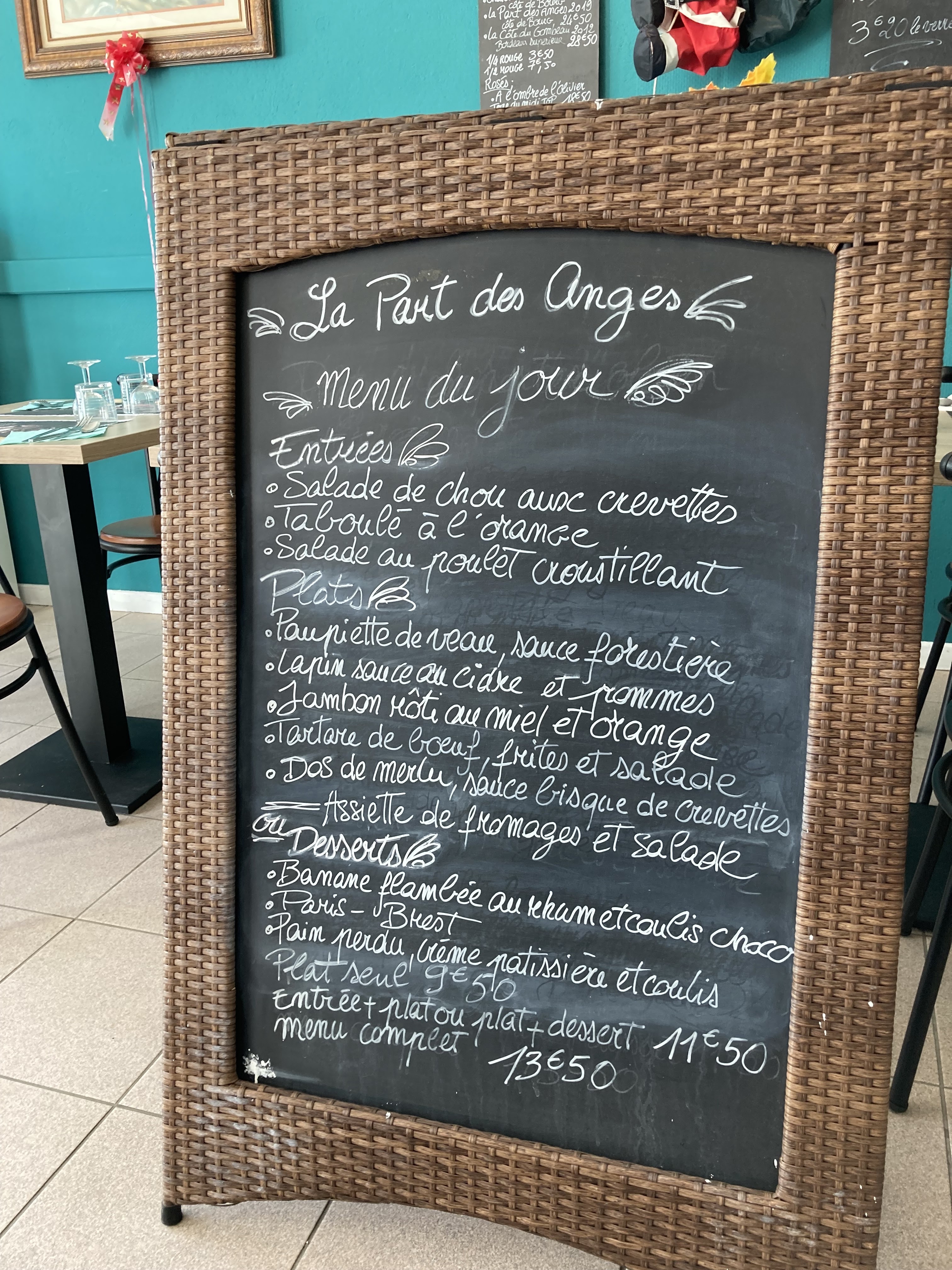 Posté le 30/11/2024 à 08:53"La Part des Anges est une agréable surprise. Cuisine soignée maison avec produits naturels. L’occasion de redécouvrir les cailles farcies finement. Aussi des légumes bien cuisinés, foies gras mi-cuit, petites pâtisseries gourmandes. Le savoir-faire du Chef s’accorde parfaitement à deux serveurs sympathiques. Merci à eux."
