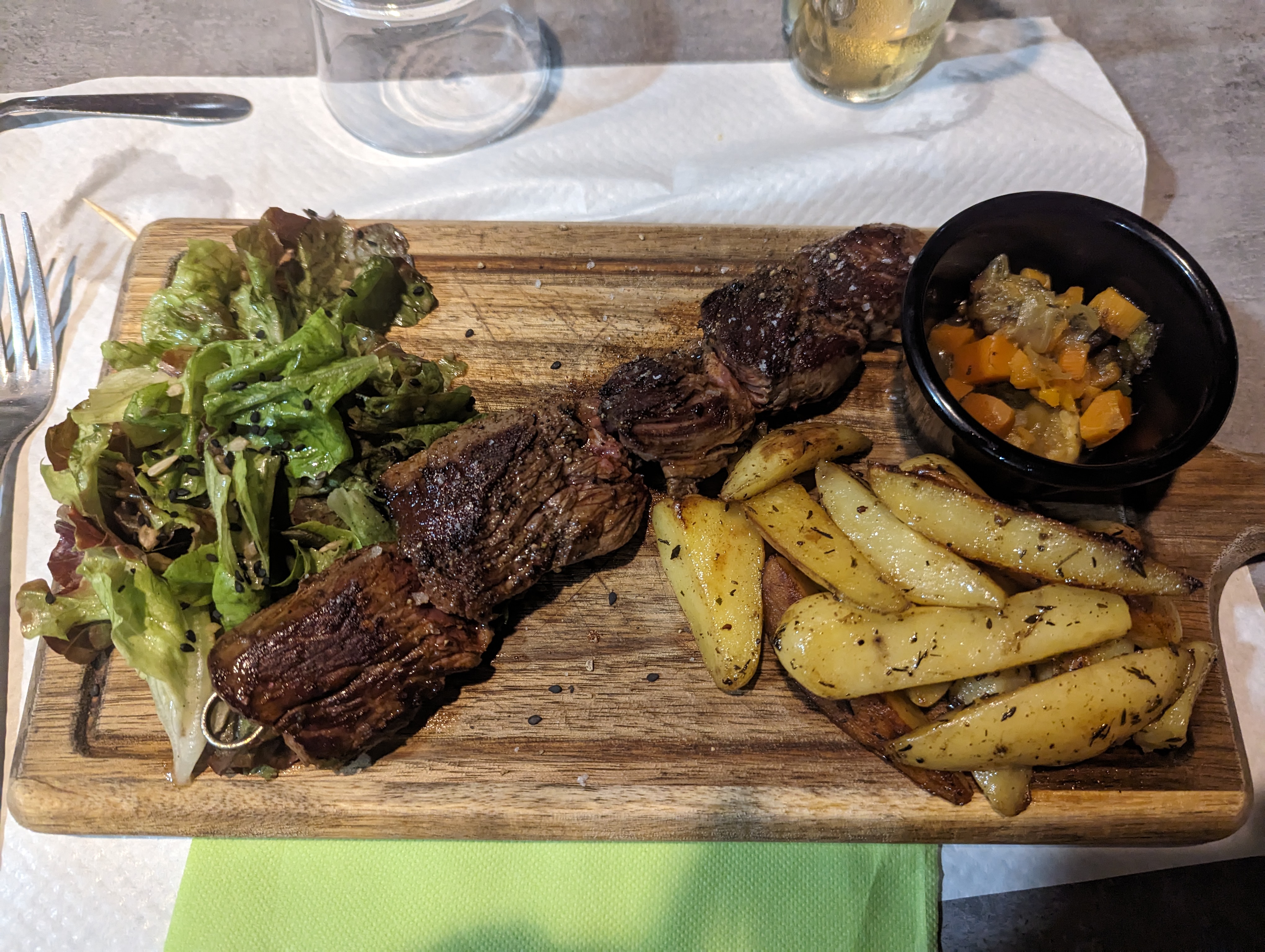 L'entrée un peu juste, beaucoup de salade pr faire du volume Le plat de résistance très bien ( qualité - quantité - goût - prix). Le dessert bon mais un peu juste en quantité Cadre très bien (extérieur) Ds l'ensemble très bien