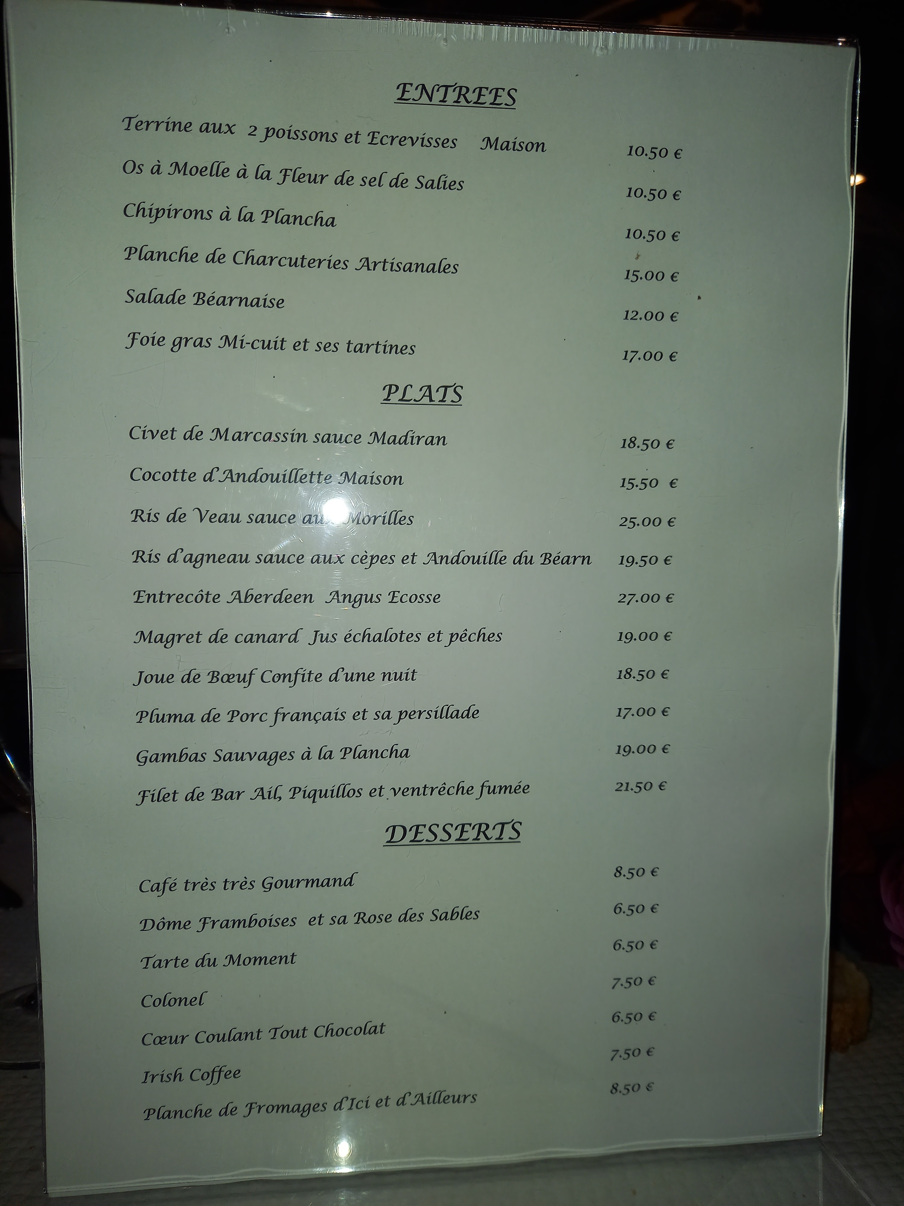 Accueil correct, essayez de vous attablés en bas, cadre convivial par rapport à un étage neutre. Menu à 28€ sans vin. Salade béarnaise copieuse, jambon délicieu. Plat plaisant mais maigrelet. Dessert basique. Menu au tarif un peu élevé. Je suis sûr qu'ils peuvent s'améliorer.