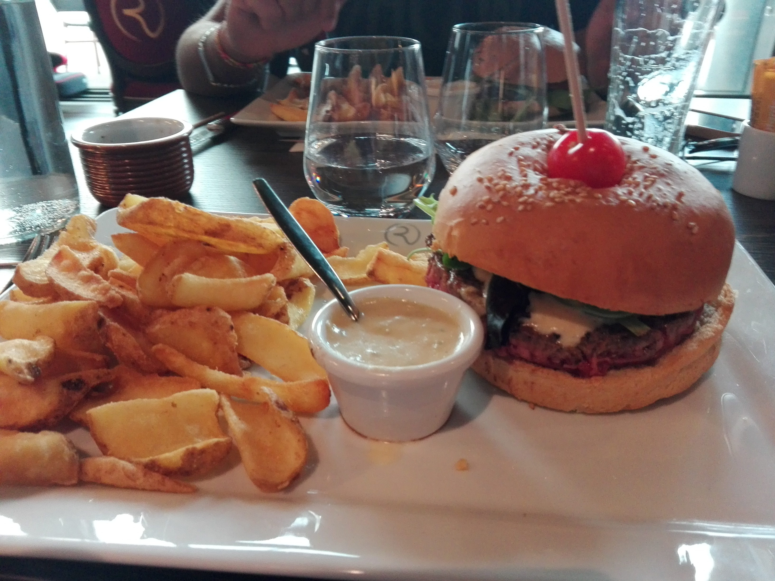 "Bon mais un peu trop cher. Serveurs sympa. Bons produits pour la salade gourmande à 17 euros, burger normal pas exceptionnel, viande de bœuf trop dure."