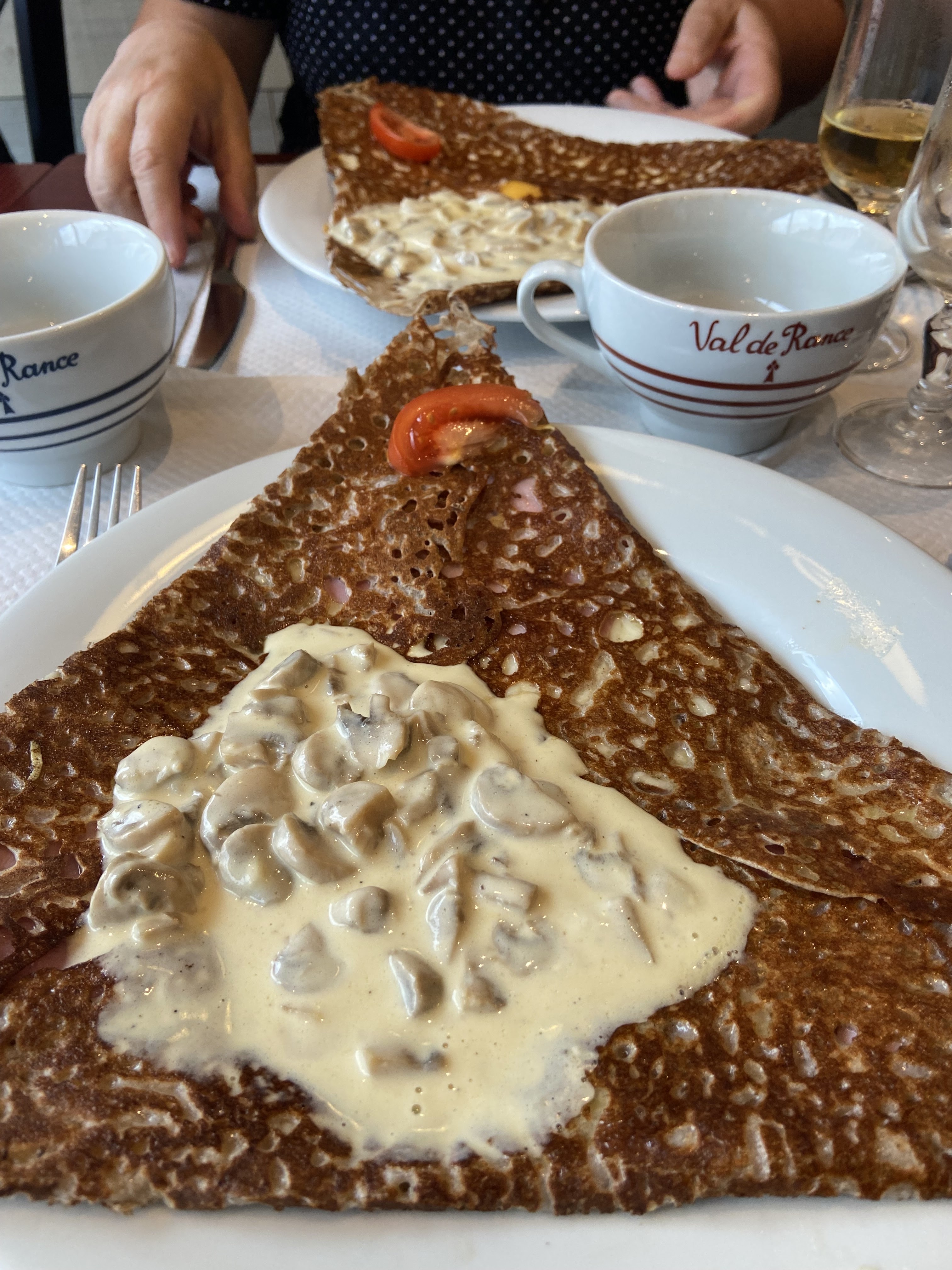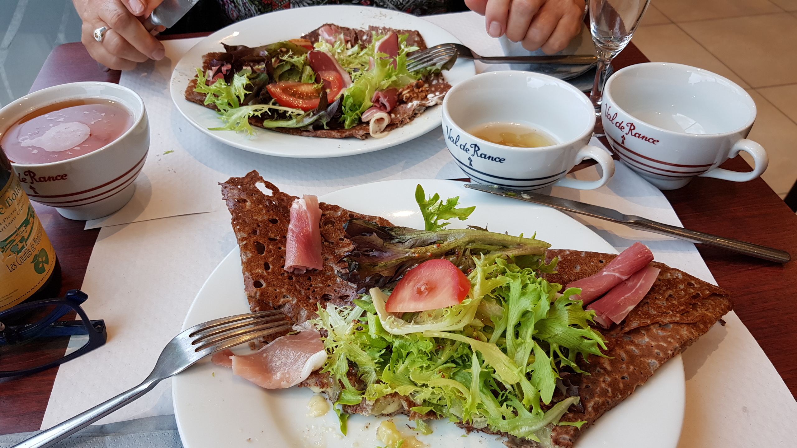 Le camping-car arrêté sur la place de l'église. Nous décidons d'aller manger dans cette petite crêperie. La recettes sont gourmandes et copieuses. On se regale....