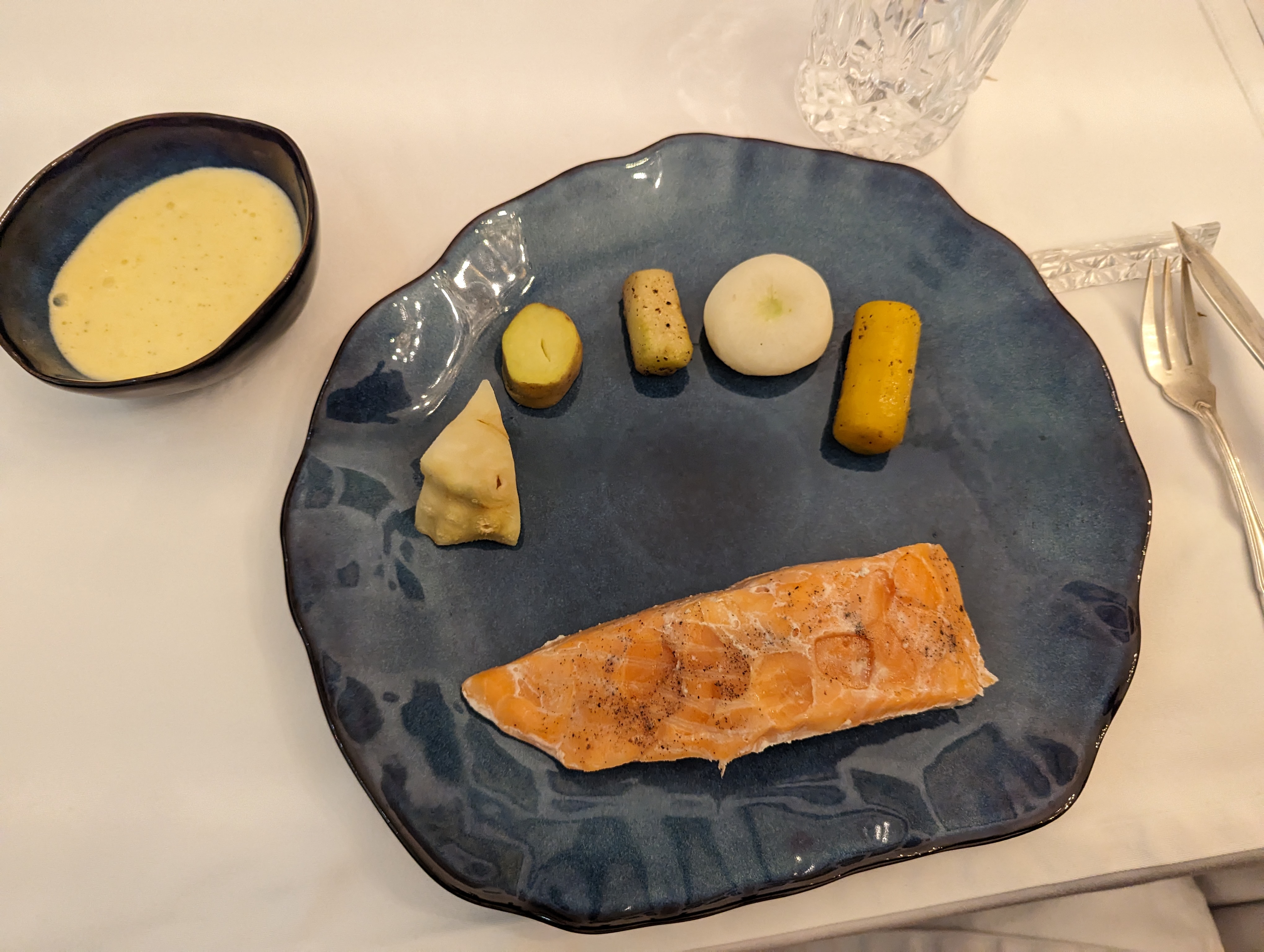Une 4eme visite toujours aussi agréable et fastueuse ! Alexandre ne sait pas limiter la générosité de ses plats, et comme la qualité est excellente, c'est véritable festin ! Cette fois, j'ai repris de son sublime foie gras maison au safran (c'est un must), des morilles fourrées au foie gras (oui j'aime ça) accompagnées de magrets de canard séchés, un pavé de saumon à l'encre de seiche cuit en basse température (une découverte, tellement fondant !), et le tout accompagné d'un très bon vin du Jura.