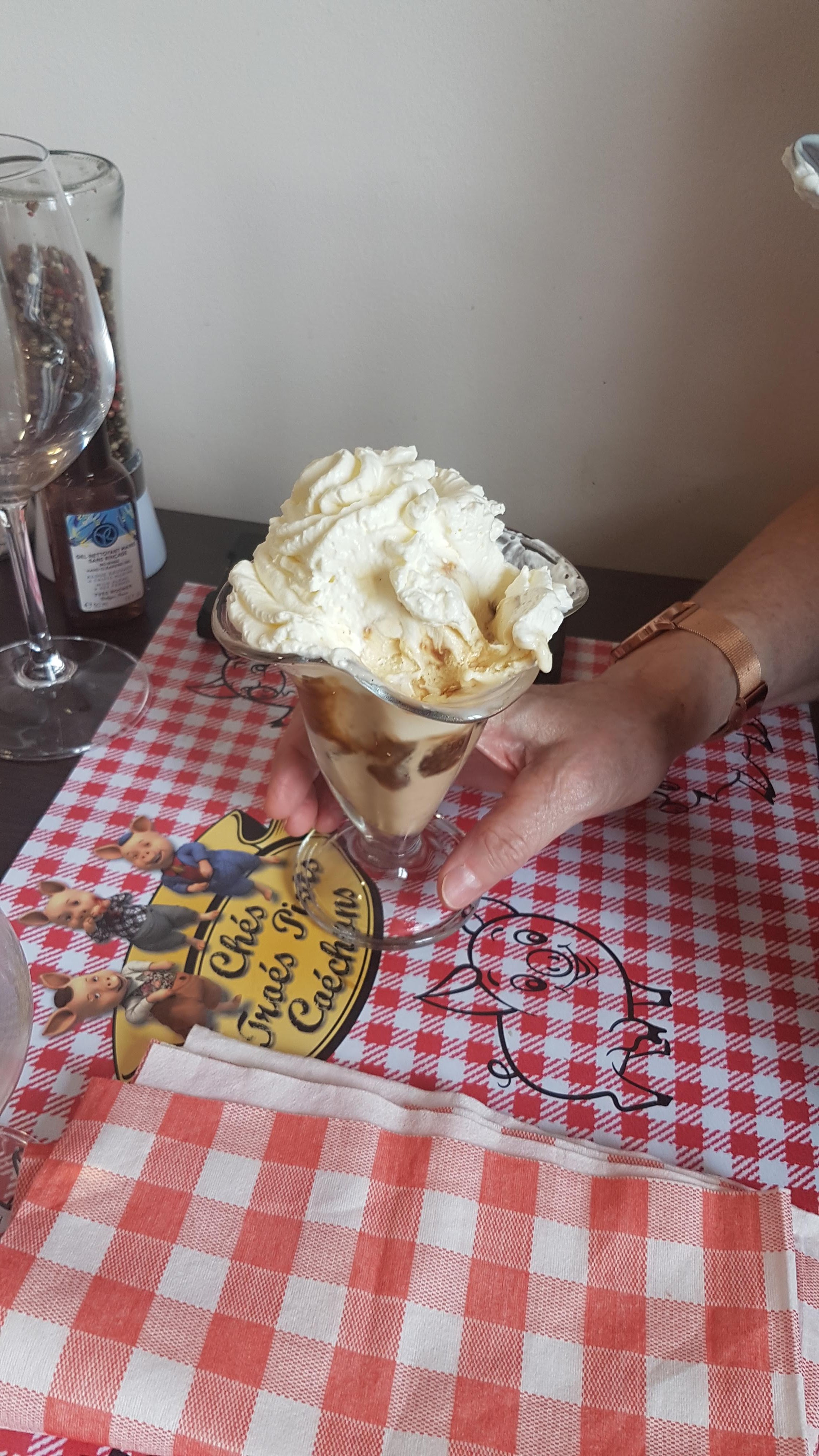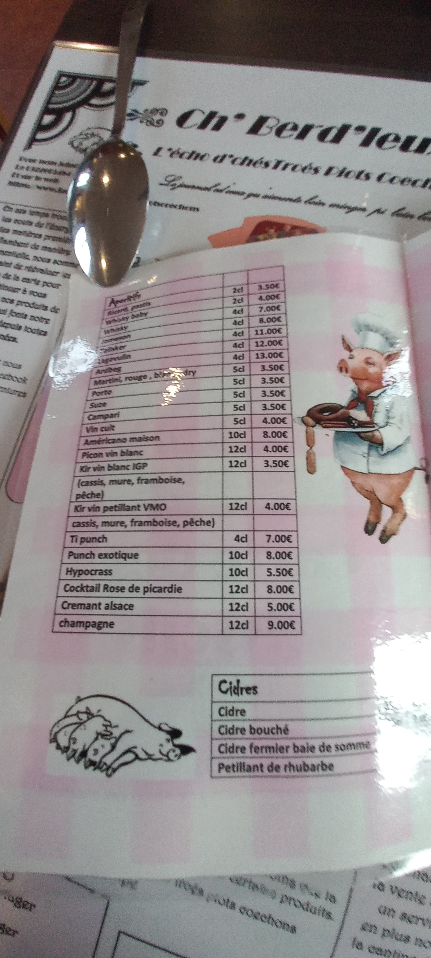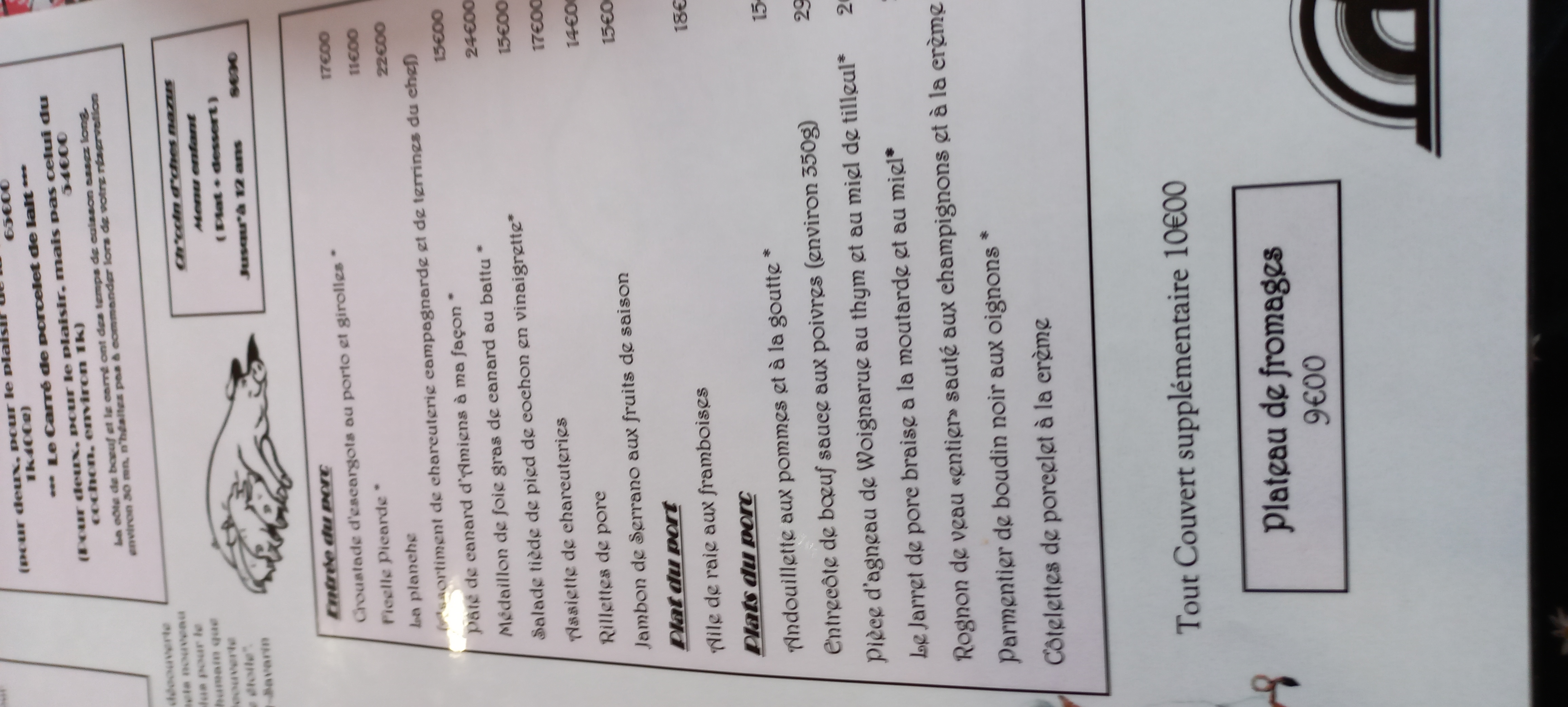 Du très lourd et très bon dans une ambiance kitsch et conviviale. J'ai opté pour le menu presque tout cochon à 28€ avec 2 délicieux pieds de porc en entrée, très copieux et bon même si la ficelle picarde qu'ont prise des amis m'avait l'air tout aussi bonne. Les côtelettes de porcelet à la crème sont fondantes à souhait. Le plateau de fromage qui vient est déjà en trop mais comment résister aux fromages locaux : maroilles, Neuchâtel et camembert fermier et autres fromages français ? Le dessert : un café gourmand composé de la charlotte aux fraises (dessert du jour), meringue et glace vanille était insipide, pas grave, on était pas venu pour ça.
