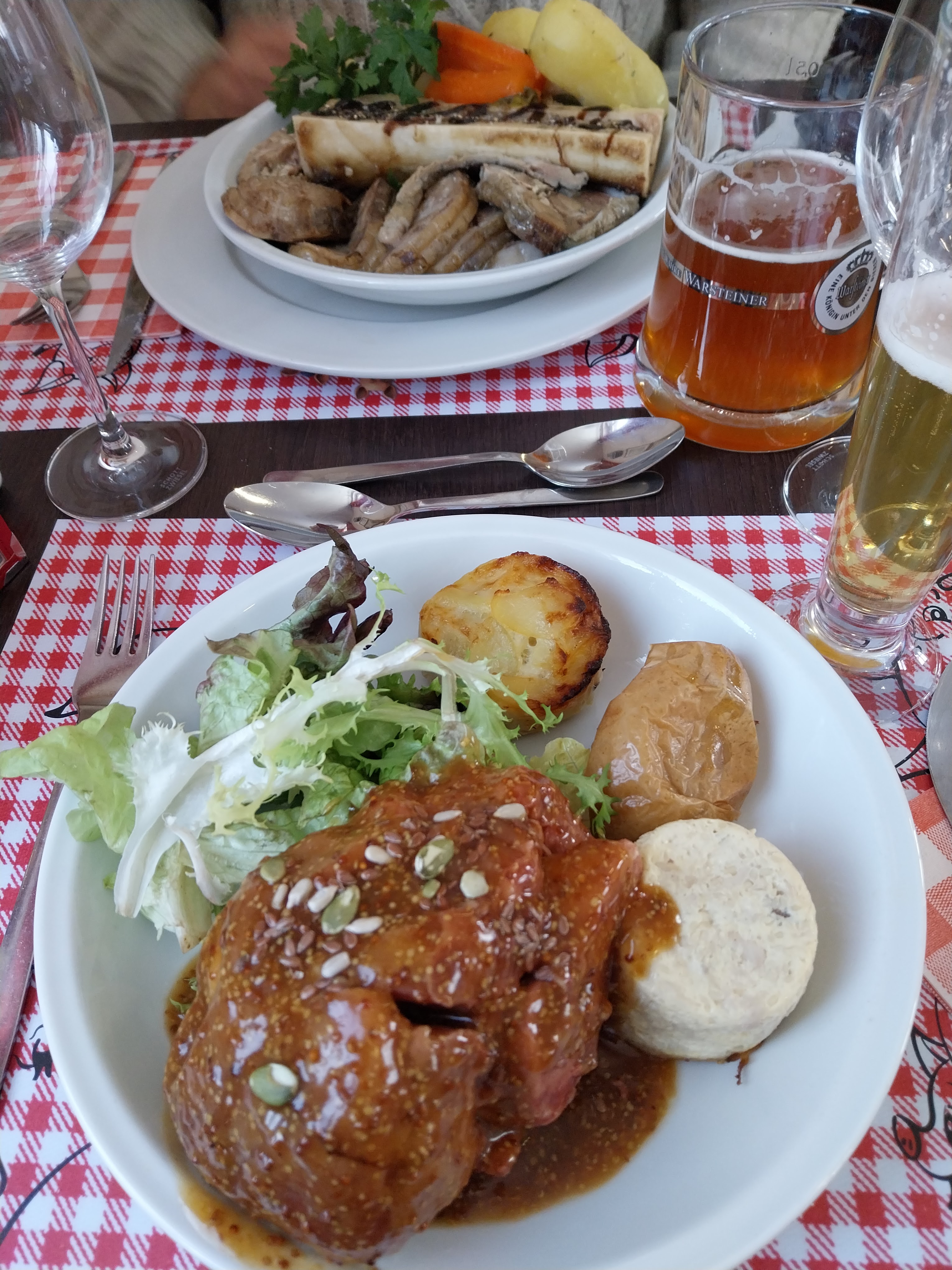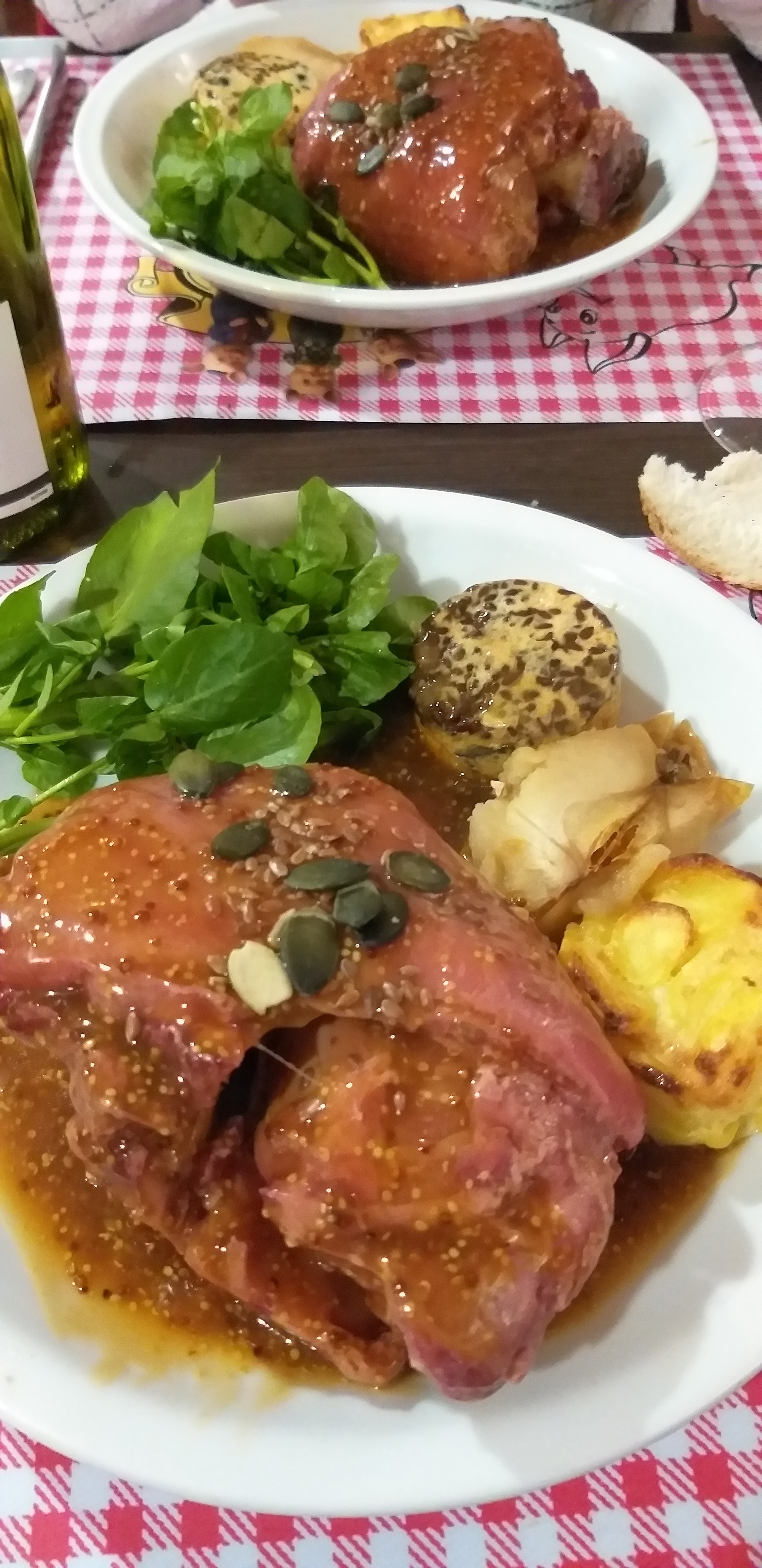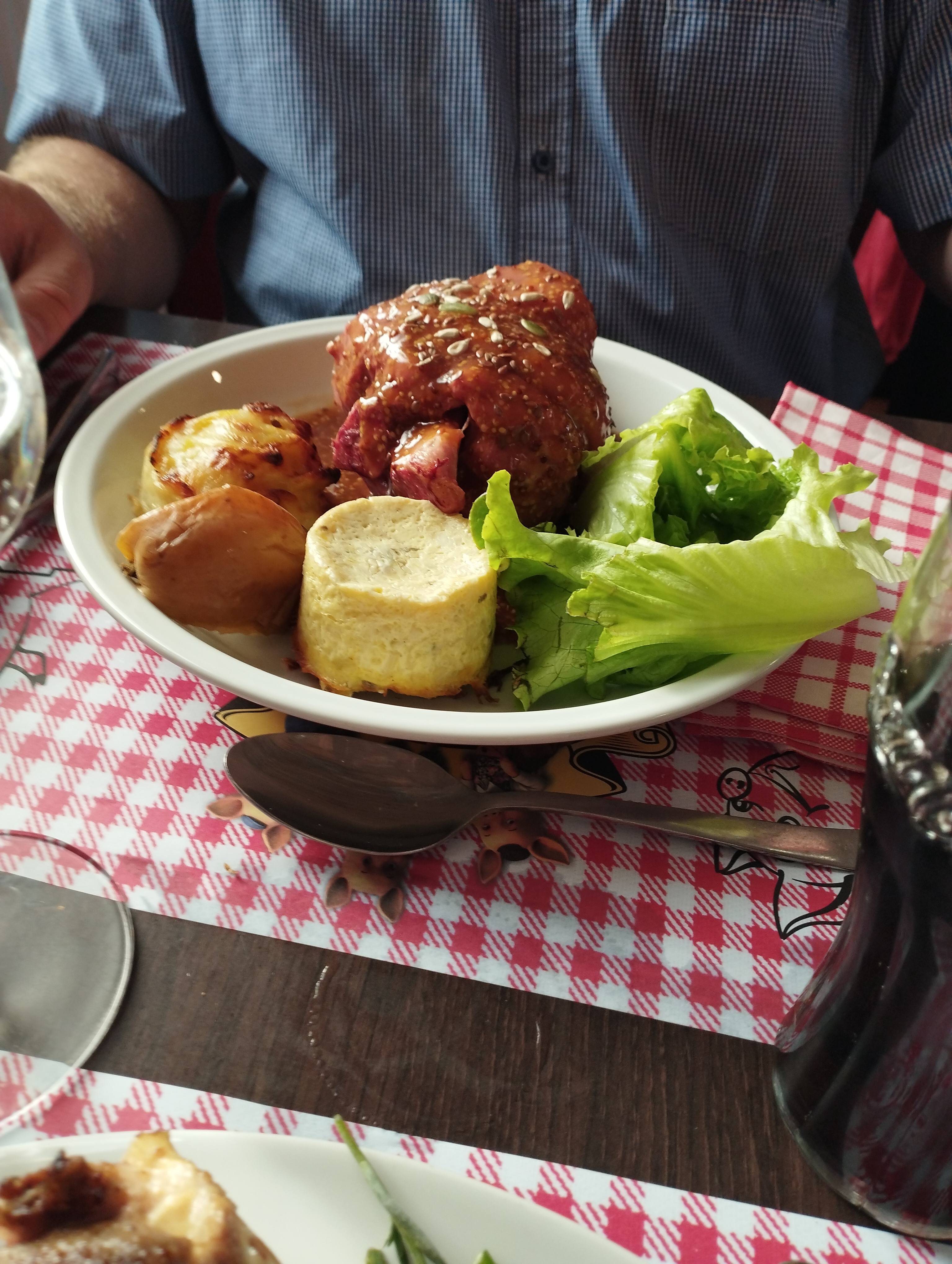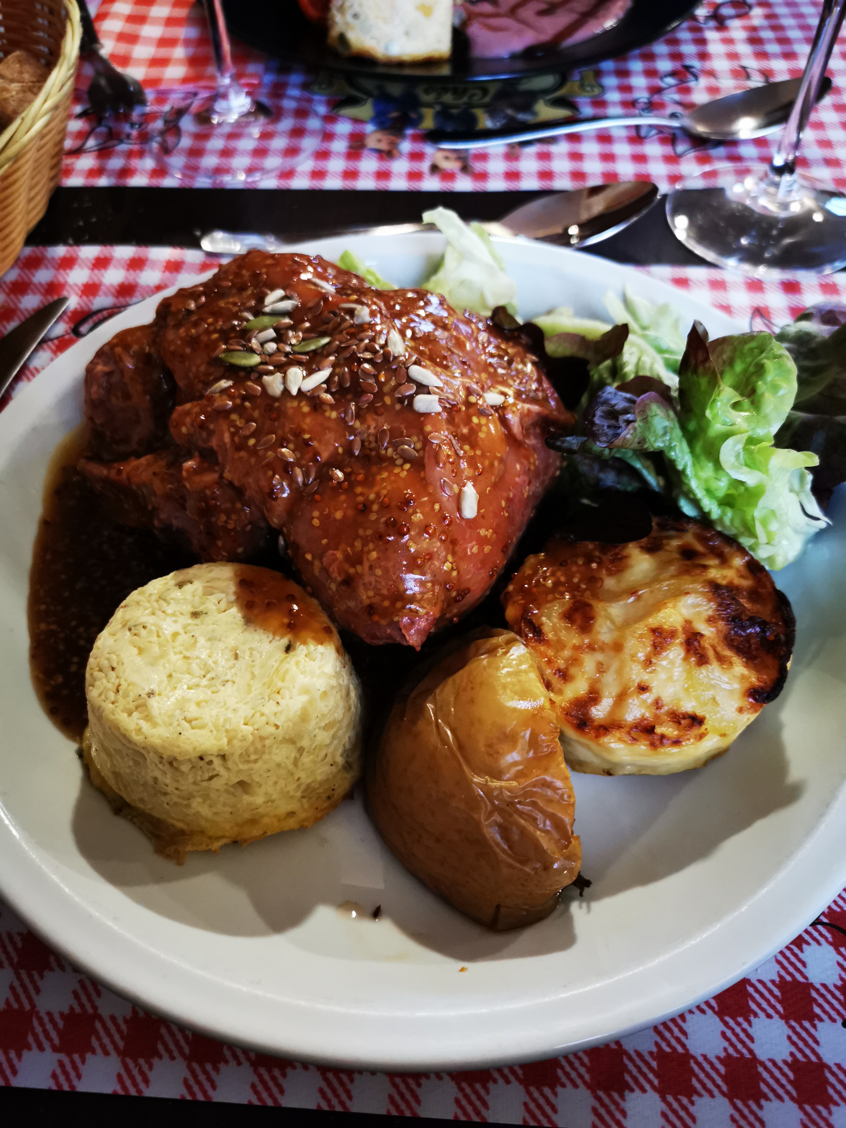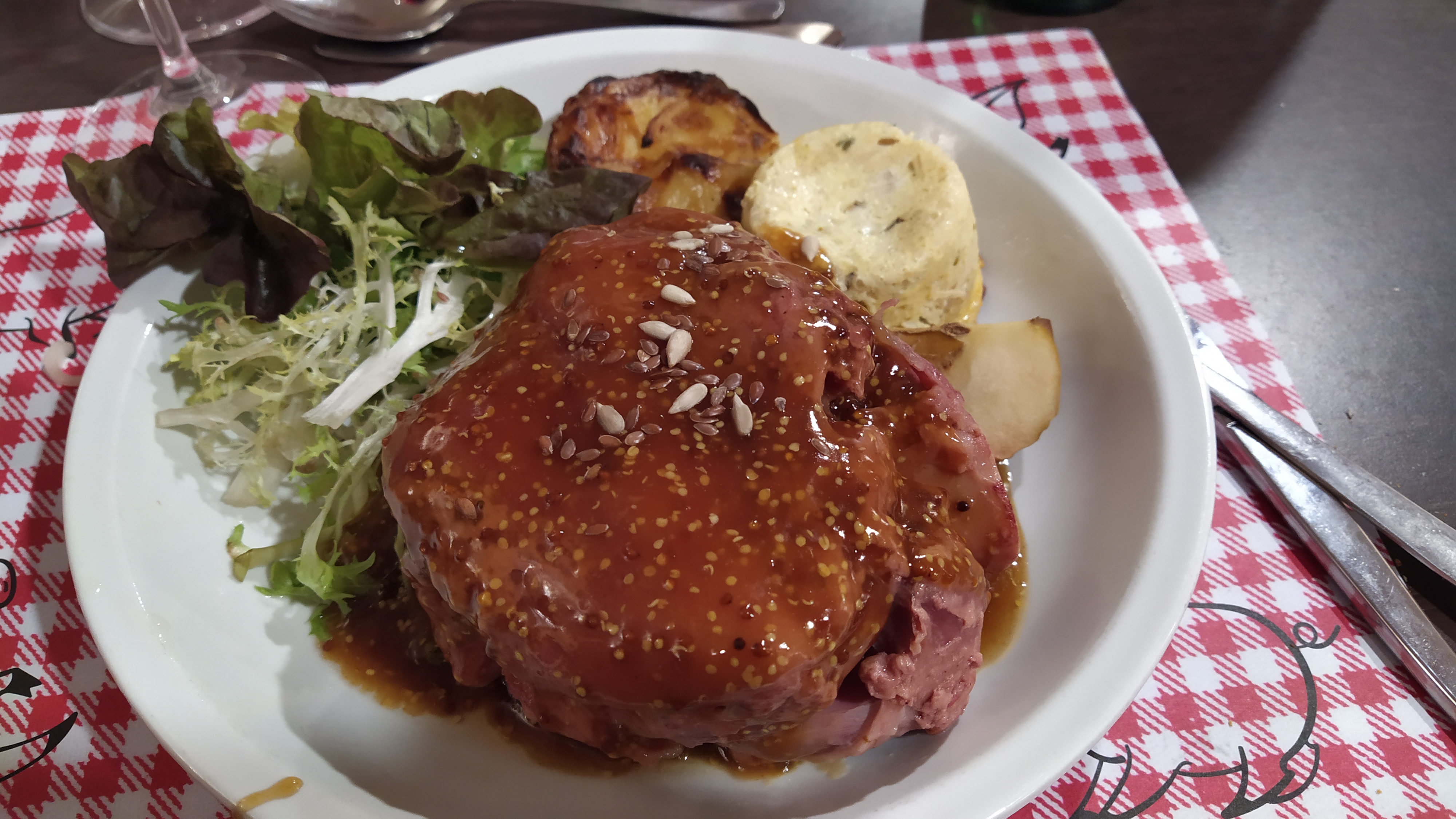 Accueil sympathique, dans un cadre original. Repas copieux (voir très copieux). Des plats d'antan. A découvrir 👏👏 En photo le jaret d'environ 500gr au miel et graine de moutarde .