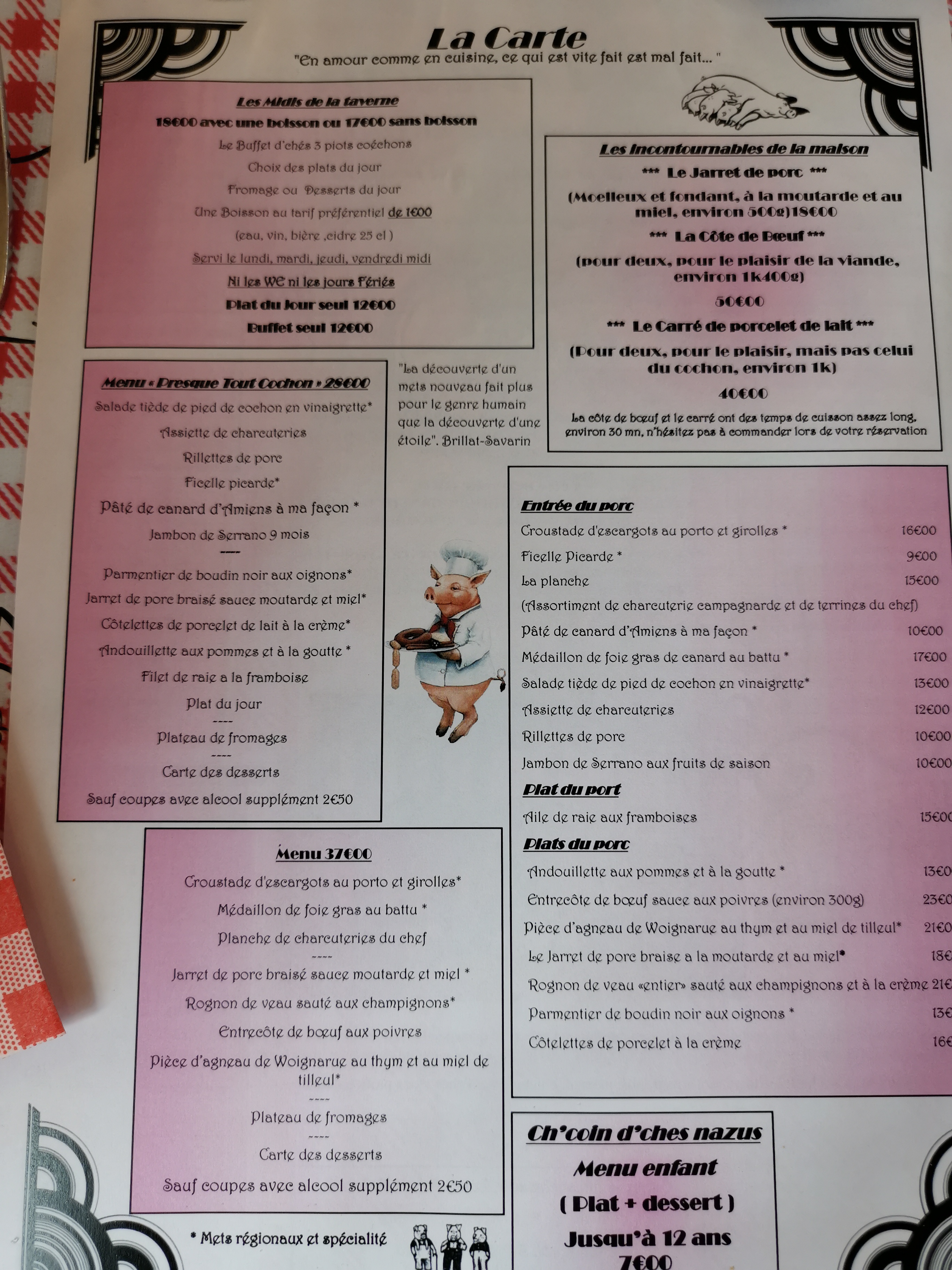 Super taverne sur le thème du cochon. Un service impeccable. 3 menu au choix. 37 euro. 28 euro et 18 euro. Avec ma femme nous avons pris celui à 28. Entrée plat fromage et dessert. Tout est copieux et surtout très bon. Un conseil si vous i allez le midi, ne mangez pas la veille et pour le soir, ne mangez pas le midi. Nous reviendrons très vite dans ce super resto. Très belle découverte.