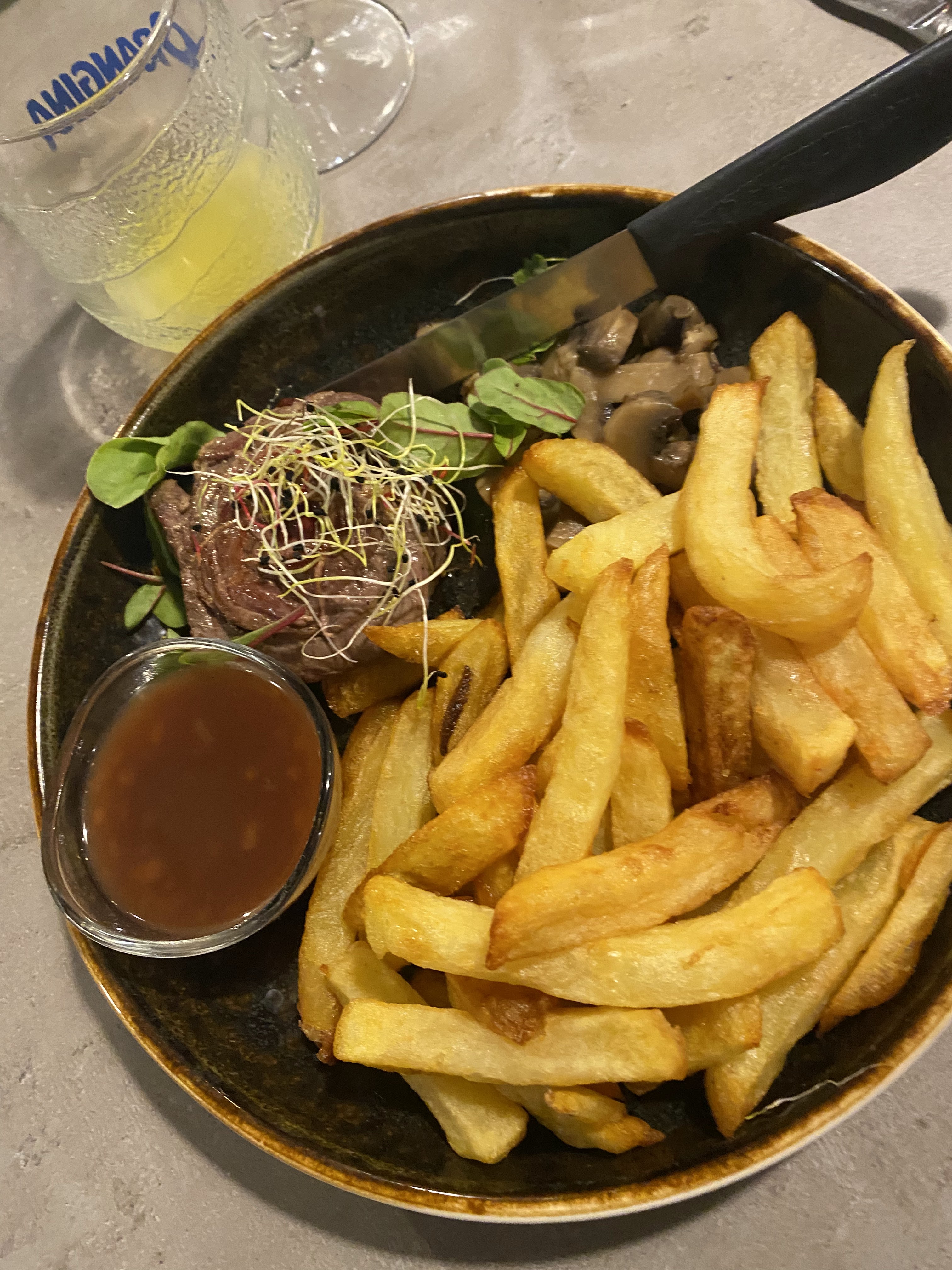 Arrivé un peu en avance... Donc pour patienter, commande d'un apéritif, qui ne viendra jamais.....ensuite, prise des commandes 30 minutes après l'arrivée de mes amisil serait bien de demander pour l'apéritif pendant l'attente.... Repas correct, copieux... Frites molles.... Viande demandée à point, servie limite rouge.... Le vin était bon lalande pomerol...