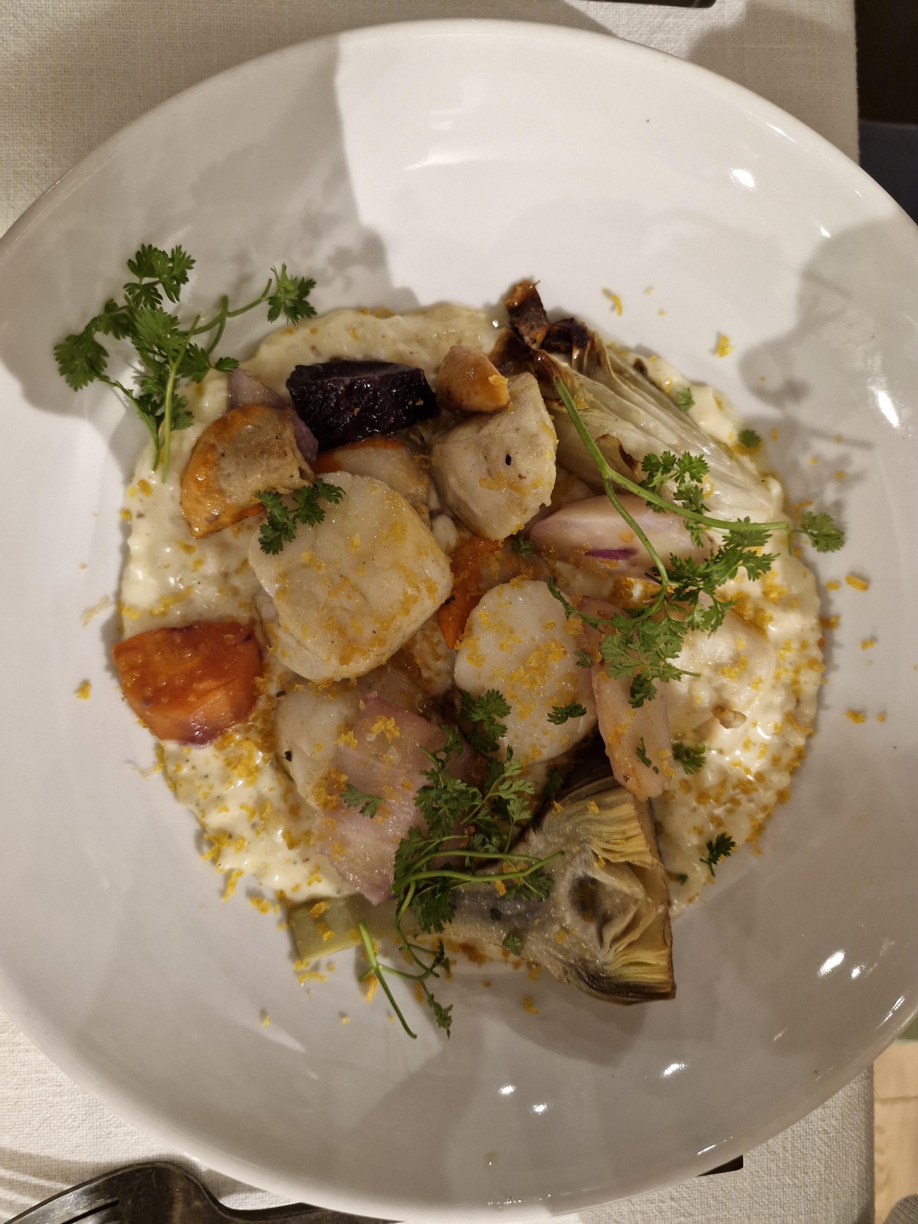 Plat de poisson formidable. Service super, arrivé sous la pluie en moto, les vêtements ont été mis à sécher. Menu original et équilibré. Un bon moment gustatif et reposant.