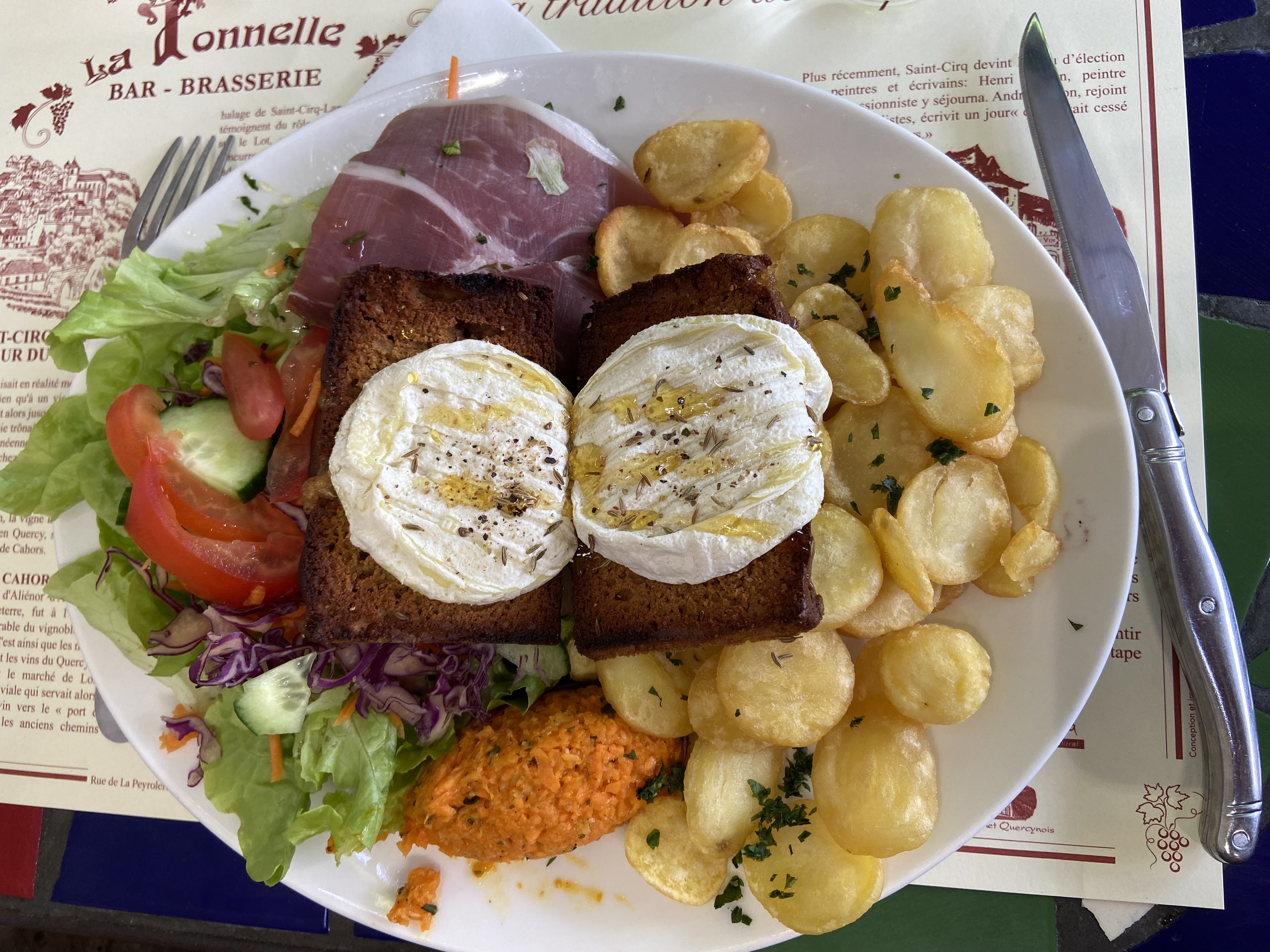 Posté le 17/06/2024 à 21:56"Repas ce midi en terrasse : beaucoup de monde lié au succès du lieu, mais peu d'attente et un service rapide et agréable. Nous avons été plus que rassasiés avec ces jolies assiettes complètes, avec viande, pommes de terre, salade, légumes, cabecou... La terrasse ombragée est très agréable et le restaurant est idéalement placé lorsque l'on visite Saint Cirq Lapopie. Ps : Merci pour la gamelle d'eau pour le chien, c'est toujours apprécié 😉"
