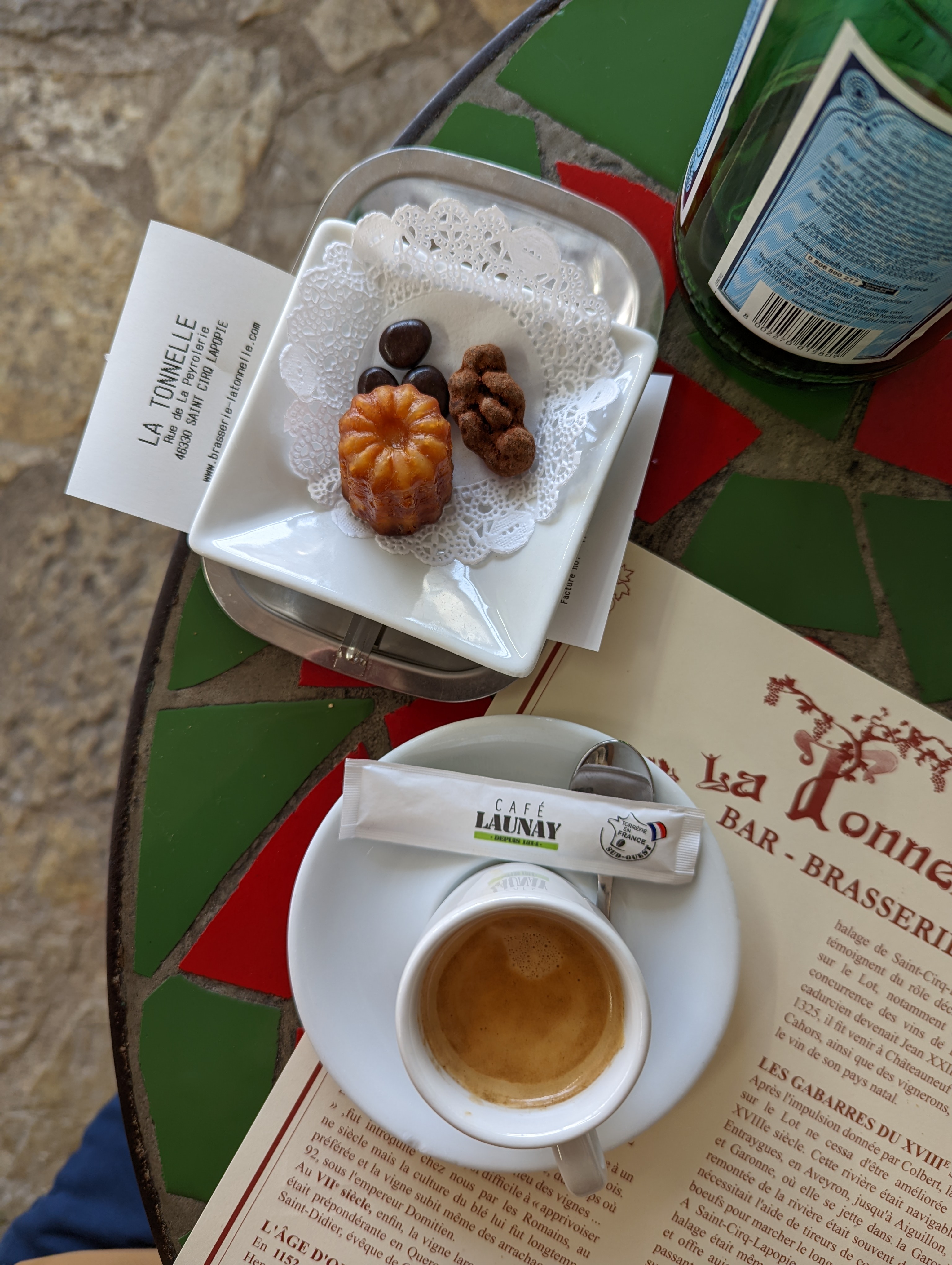 Parfaite étape à St Cirq. L'endroit est délicieusement charmant. Les serveurs agréables, de bon conseil, et le service rapide. Faute de temps nous avons pris une assiette Express : salade noix magret séché cabecou et pommes frites. Très bien pour moins de 11 euros. Et nous avons goûté l'apéritif local un fénélon (cahors crème de cassis et vin de noix) Pour les enfants le menu à 8,90€ avec aiguillettes de canard ou saucisse, frite et glace.