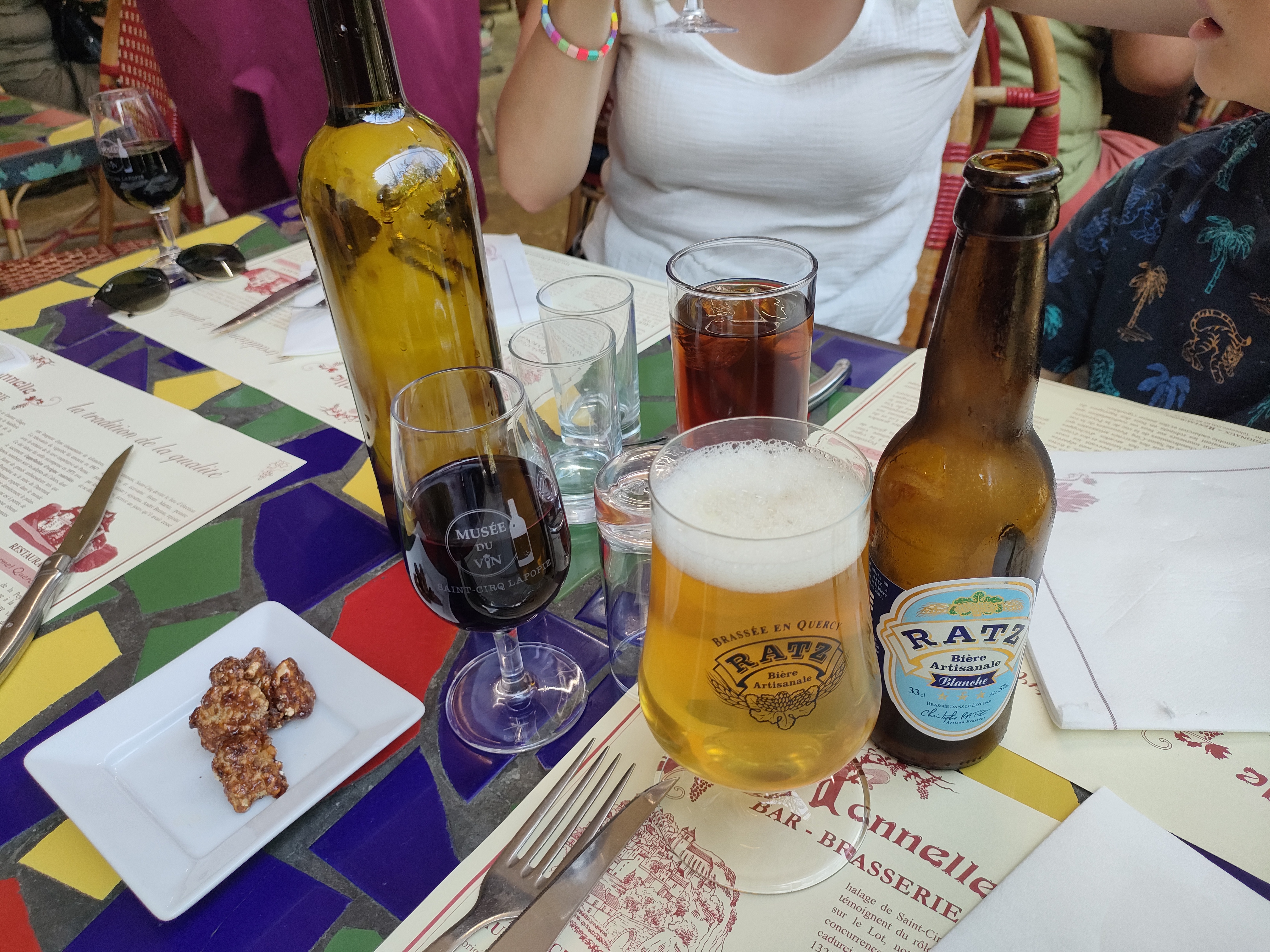 très jolie terrasse ombragée. beaucoup de choix. j ai fait une jolie découverte en prenant un verre de Fėnelon en apéritif (à base de vin rouge et vin de noix). la salade st cirq est complète et délicieuse.....
