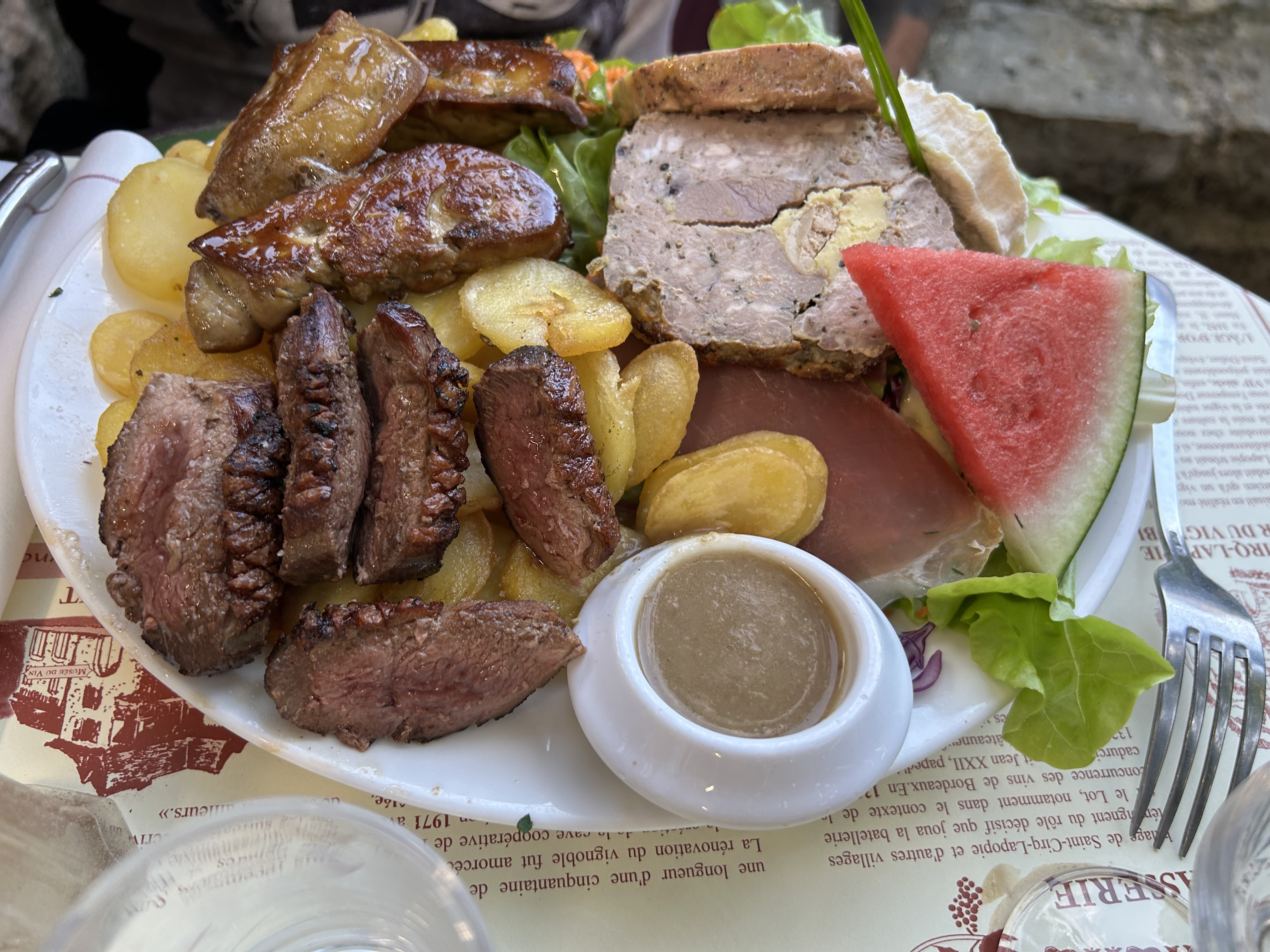 Posté le 07/09/2023 à 10:59"Dans un village exceptionnel, un restaurant ou en été on est servi sous une tonnelle. Le principe des plats ce sont des assiettes très bien garnies de salade crudités jambon de pays et cabecou puis vous choisissez la viande, saucisses, omelette aux cèpes, foie gras etc ...le tout accompagné de pommes de terre sautées. Même en étant gourmand on a du mal a terminé son assiette."