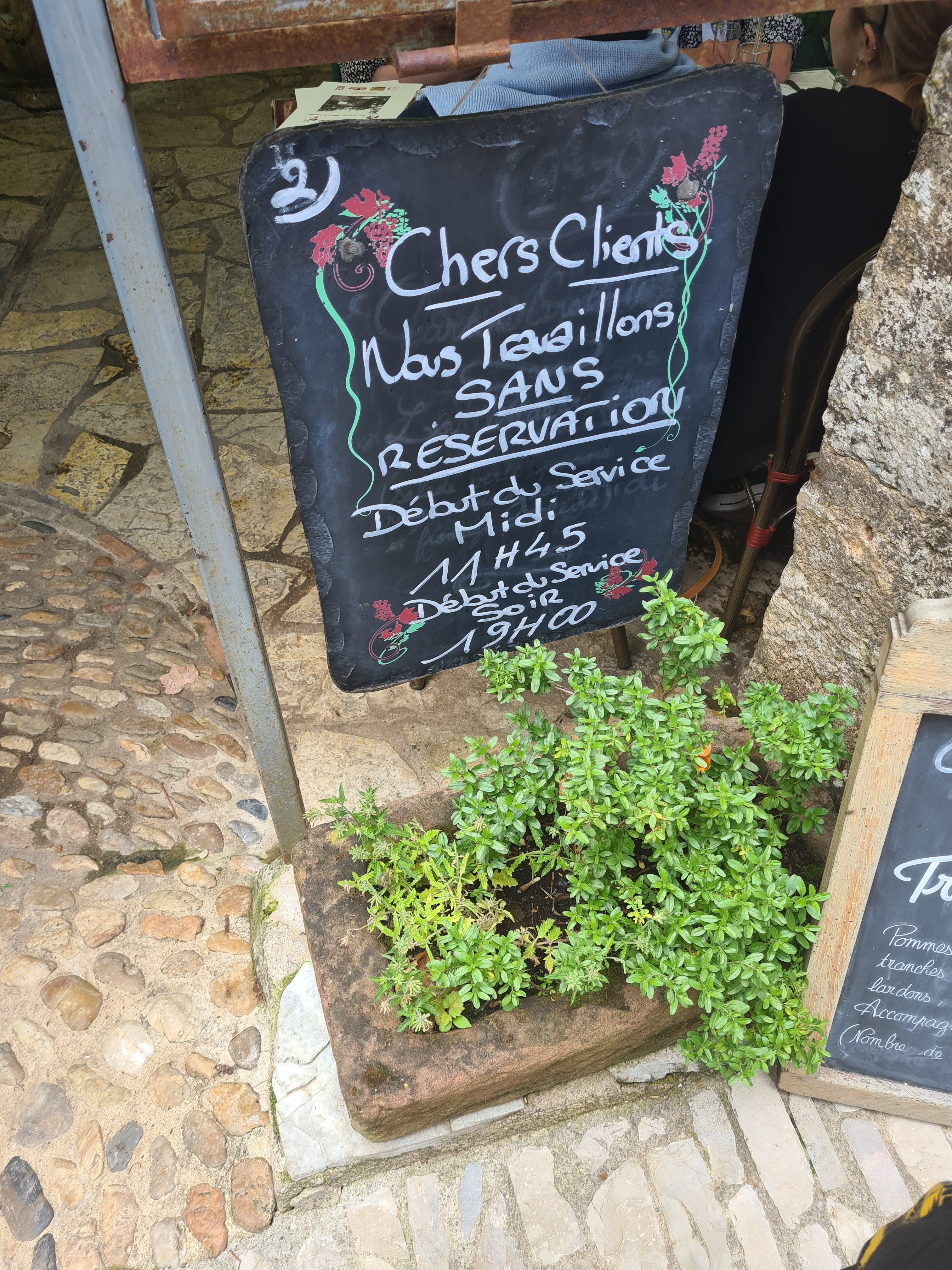 Très joli restaurant avec une terrasse ombragée par une tonnelle de vigne. Seul point négatif,un éclairage aux néons pour le soir au lieu d'un éclairage indirect qui aurait été beaucoup plus joli. Les menus sont très abordables, surtout le plat du jour, situé entre 10 et 14 €. Les parkings sont un peu plus loin, et on accède au village grâce à un chemin au-dessus de la route.