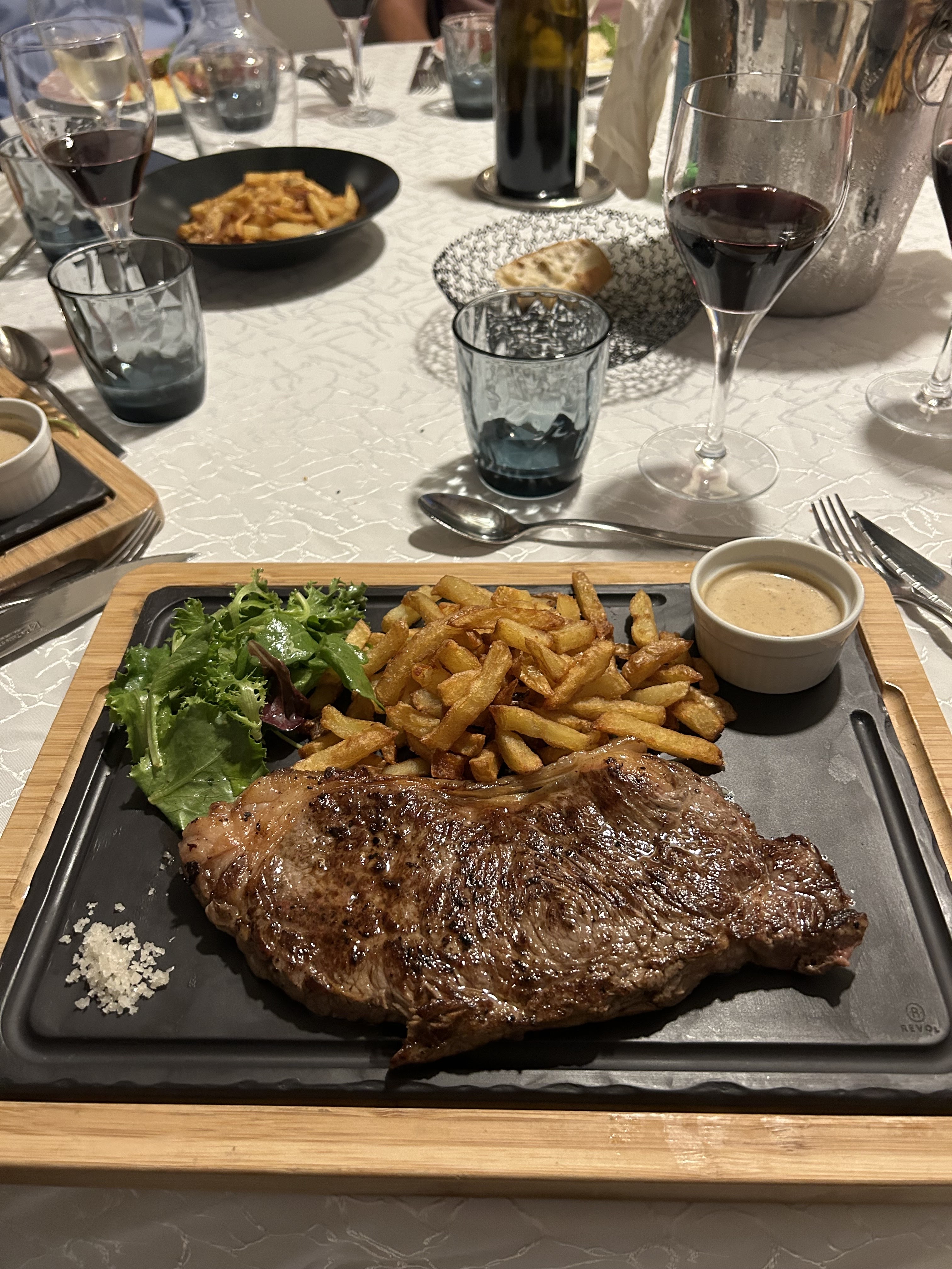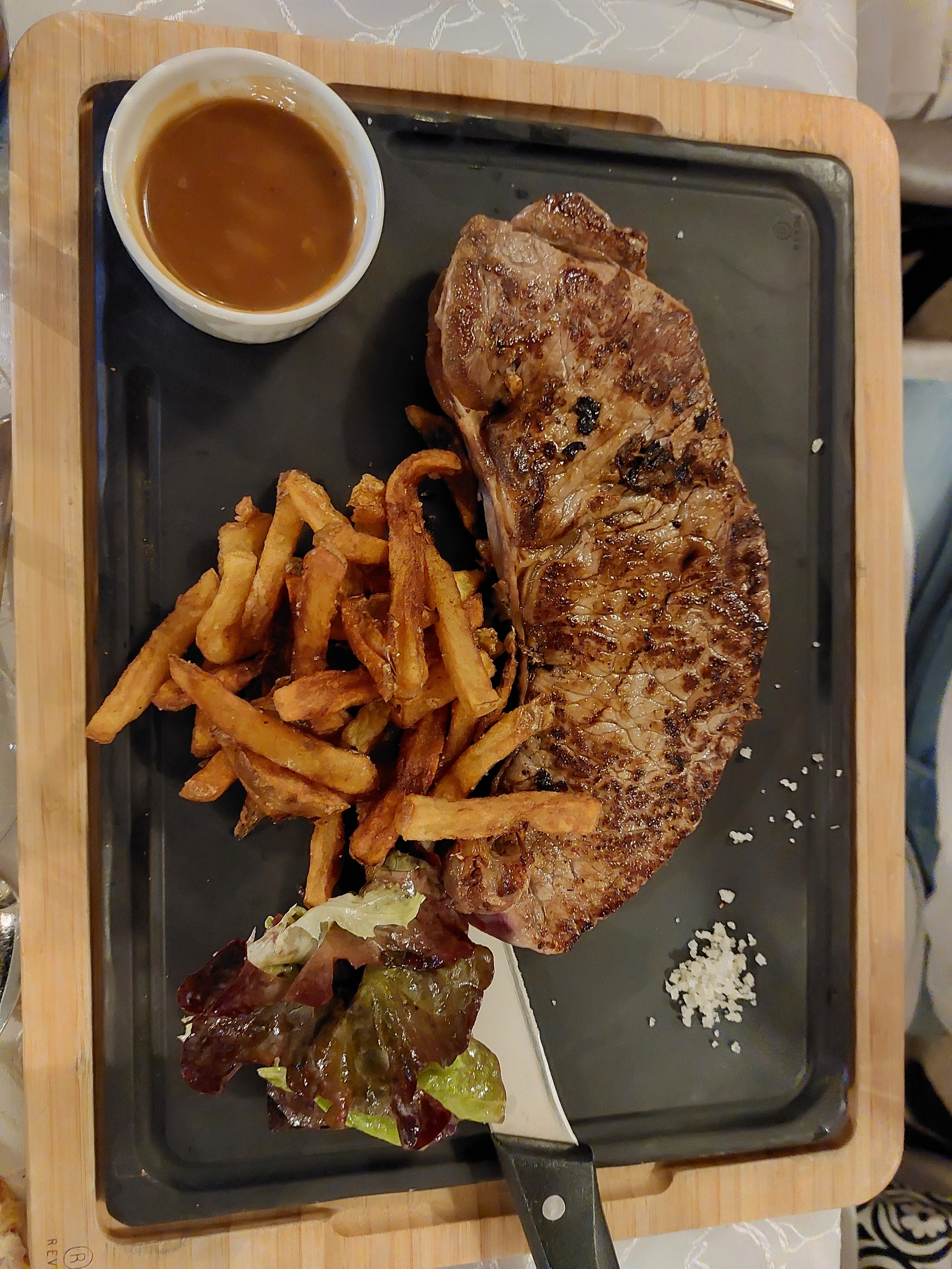 Très bonne expérience. - Température agréable par temps froids. - Excellent repas (Menu dégustation) L'entrée, le repas et le dessert sont servis chaud, cuit comme demandé. Les proportions sont très généreuse (bon mangeur à prévoir) - Qualité des produits excellentes! (foie gras, entrecôte, dessert) - Service avec un peu d'attente, mais le personnel est très agréable, souriant et sympa. - Salle un peu à l'étroit. Très bon restaurant en général! Je recommande fortement.