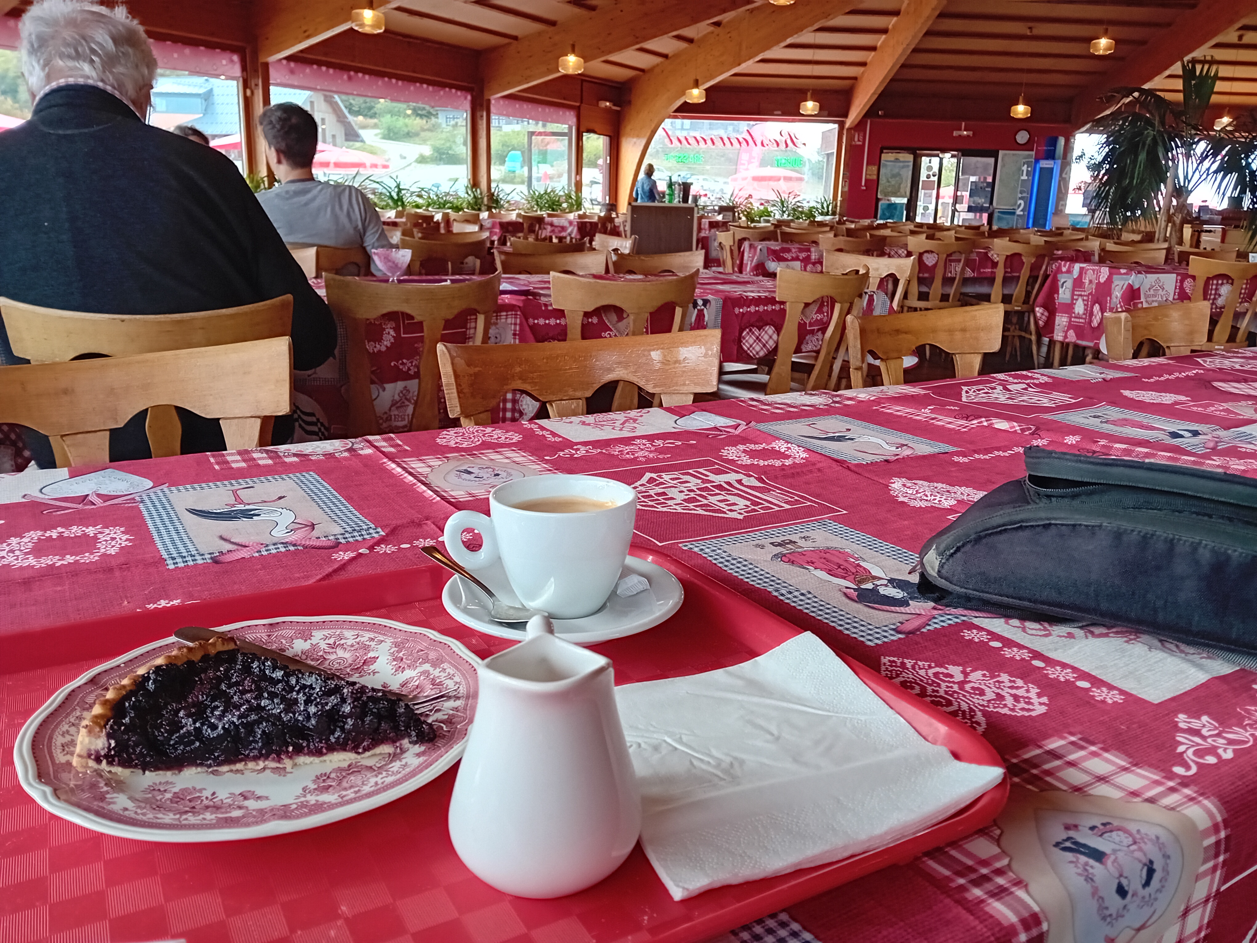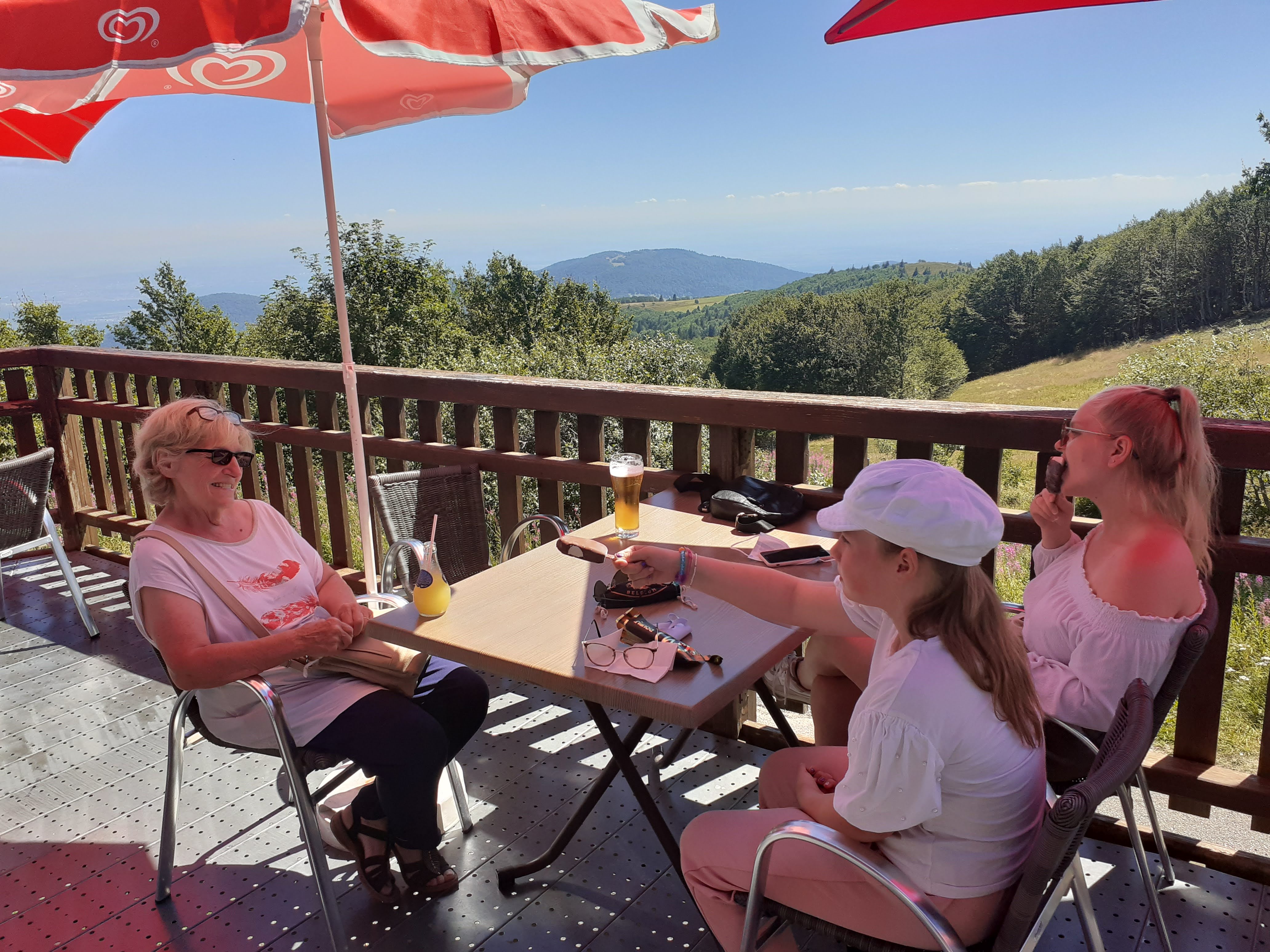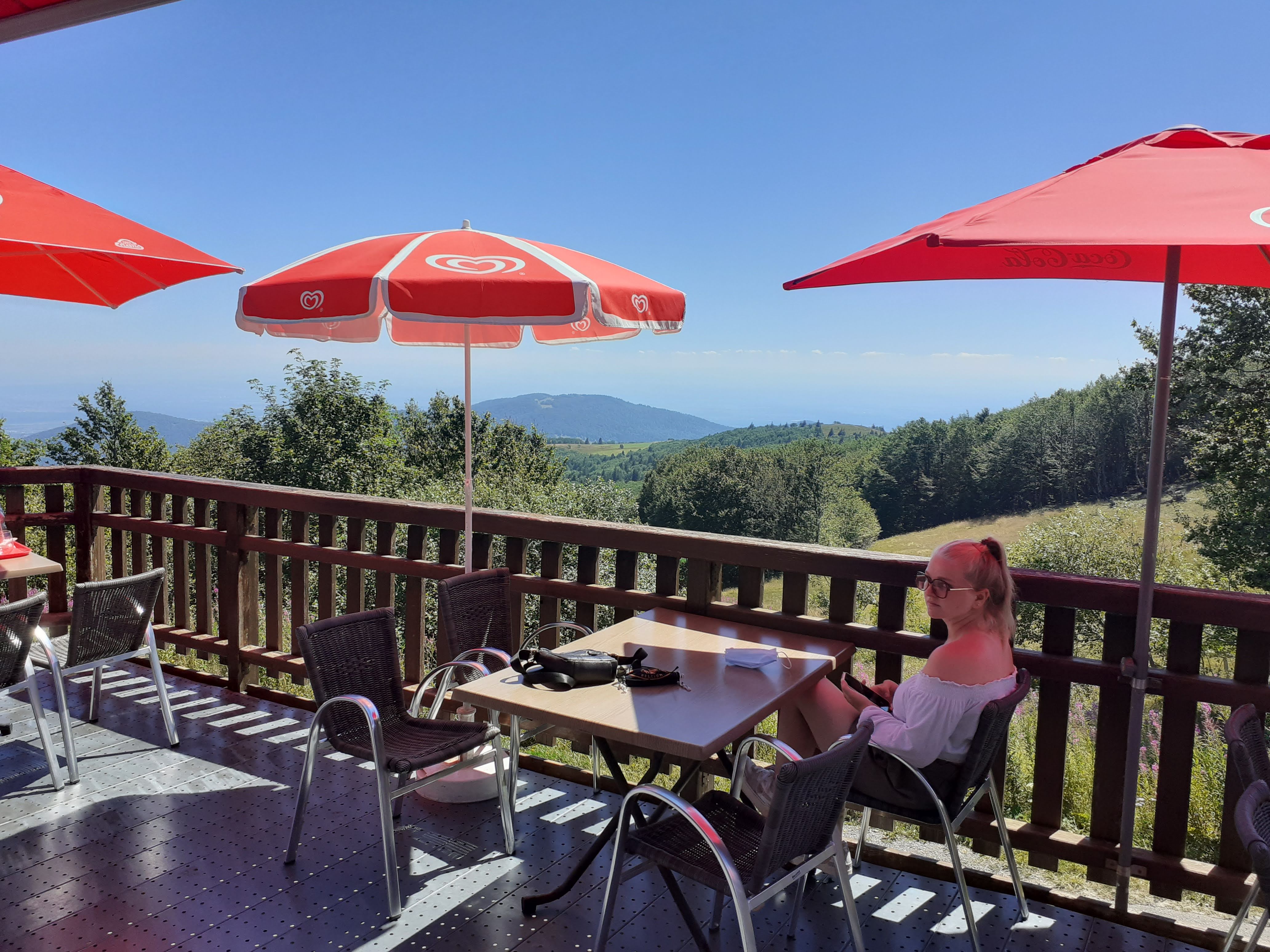 Lieu de repos après une belle randonnée autour du Grand ballon Bière et tarte aux myrtilles, au top! Pour la vue sur les Alpes, on repassera vu la nébulosité du jour