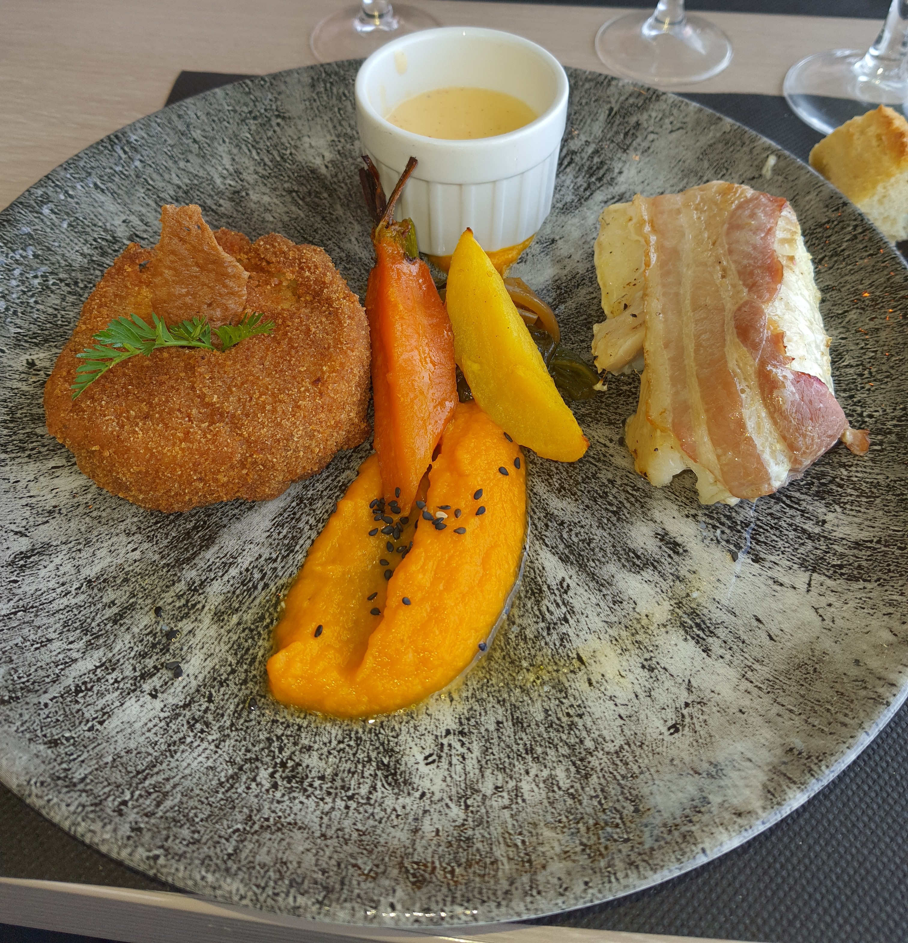 Très bon déjeuner pris au 19ème. Nous avons été placés face à la mer comme demandé lors de la réservation. La vue était superbe malgré la brume. Le dressage des plats est très raffiné et les saveurs sont au rendez-vous. La note du restaurant parle d elle même. Allez-y en toute confiance !