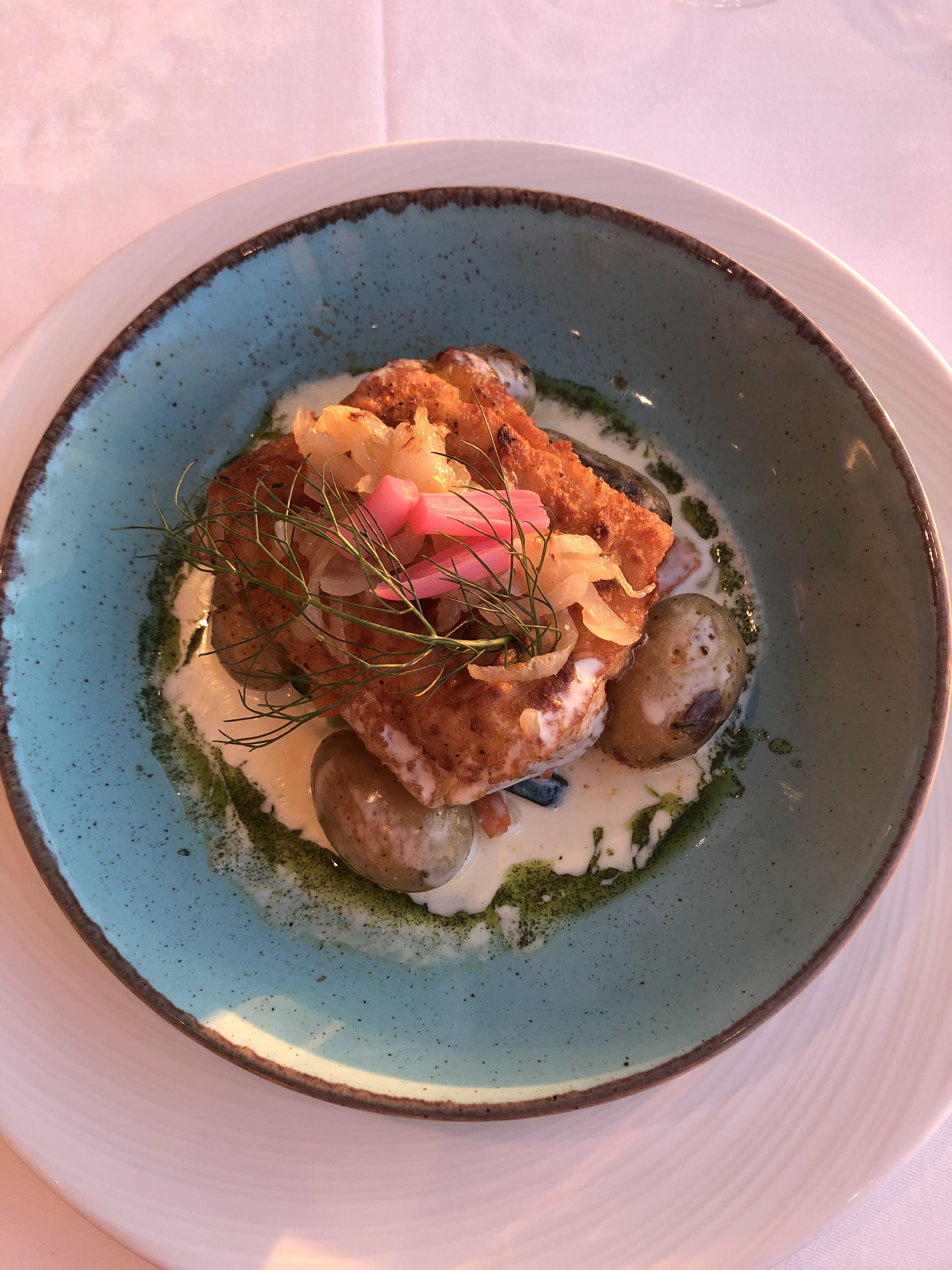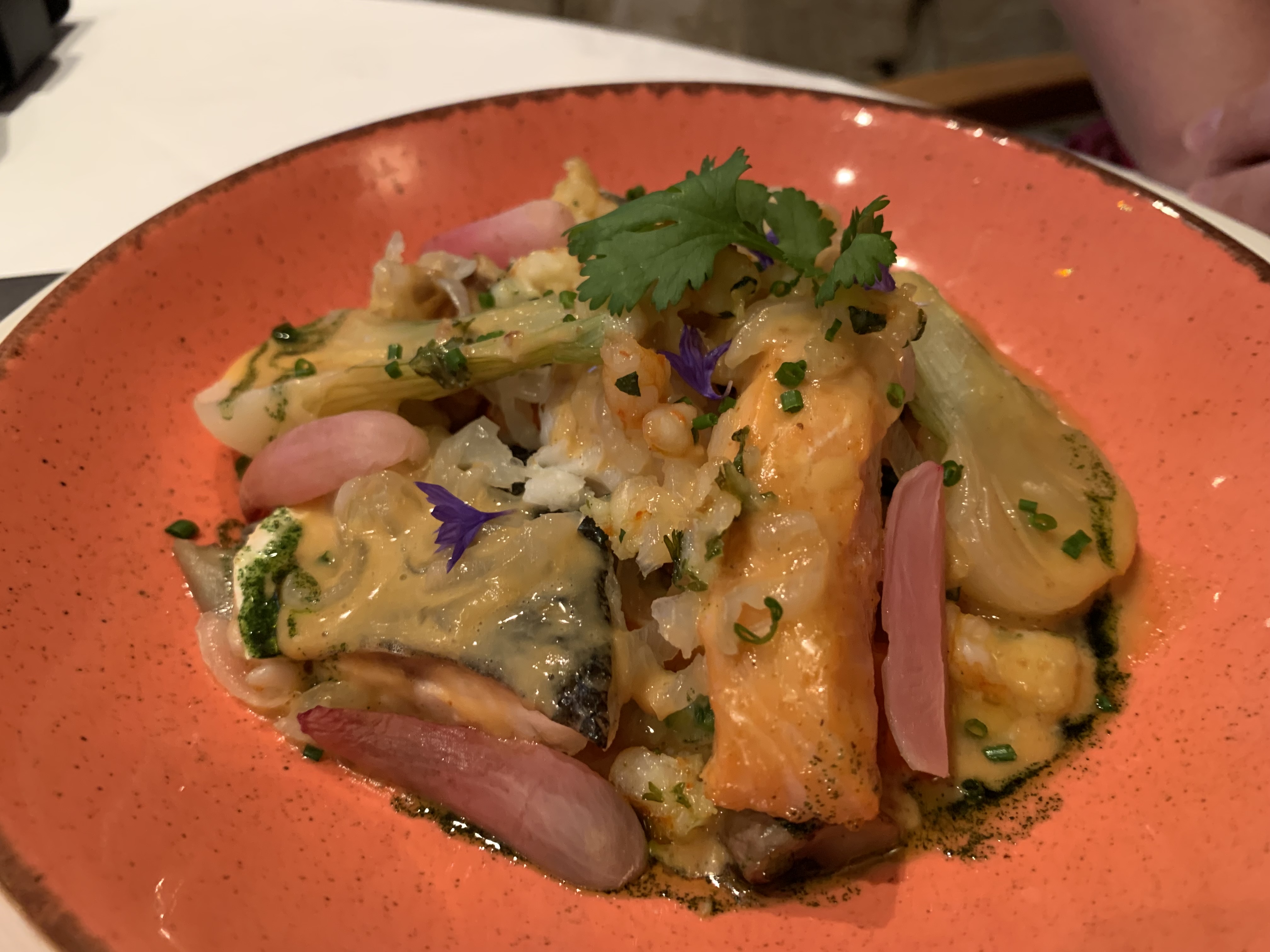 Sauce qui accompagnait le saumon trop goût prononcé de yaourt, aneth pas perceptible. Dessert chocolat tonka trop proche d une génoise, pas assez de goût et de croquant.