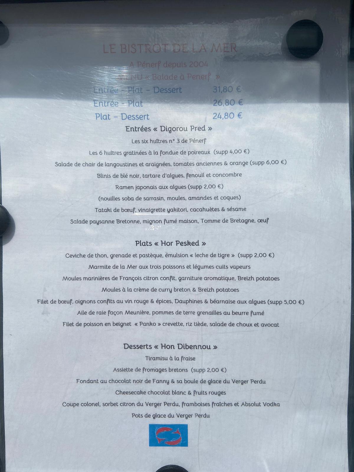 Ne vous arrêtez pas au bistrot de la mer vous serez très déçus. On vous sert des moules dont la moitié ne sont pas ouvertes avec du soit disant curry breton... Vous réclamez parce que vous n'avez pas la moitié qui sont mangeables.Et là au bout de 15 minutes on vous ramène votre reste de marmite de moules semi ouvertes et froides. Sans aucune excuses. La personne qui a pris du bar n'était pas cuit. La même chose nous demandons à le recuire et là au bout de 10 mn on vous ramène votre assiette le dessus cramé et toujours pas cuit. Je ne vous parle pas des desserts. Une panna cotta liquide Une tartelette fine chocolat avec une boule de glace complètement fondue et la serveuse pas du tout gênée de vous servir une glace fondue. Bref allez plutôt au Café Pêcheur vous ne serez pas déçus.