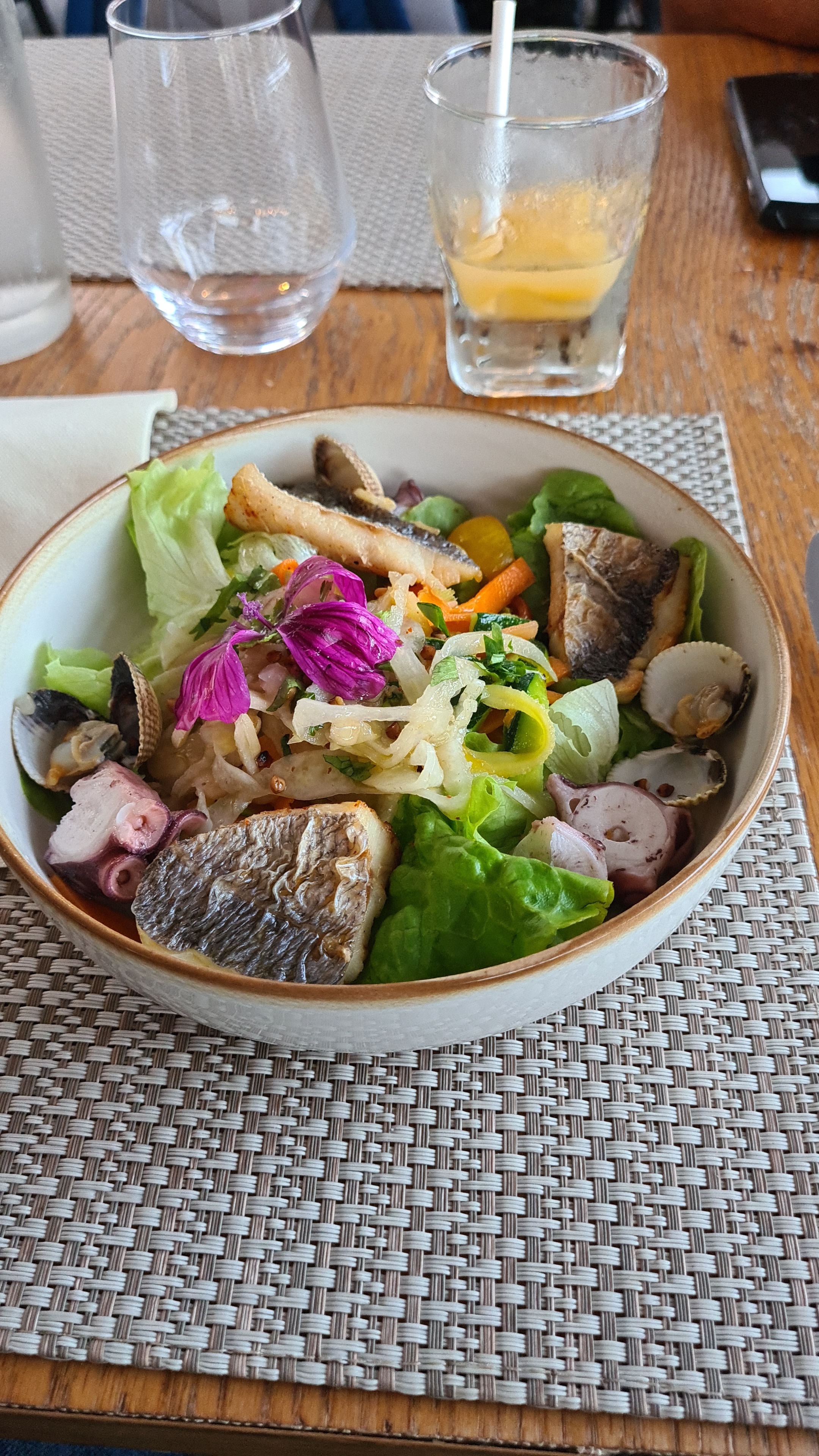 Attente très longue. Coquillage pas cuit, poisson trop cuit. On a du tomber sur le mauvais jour.