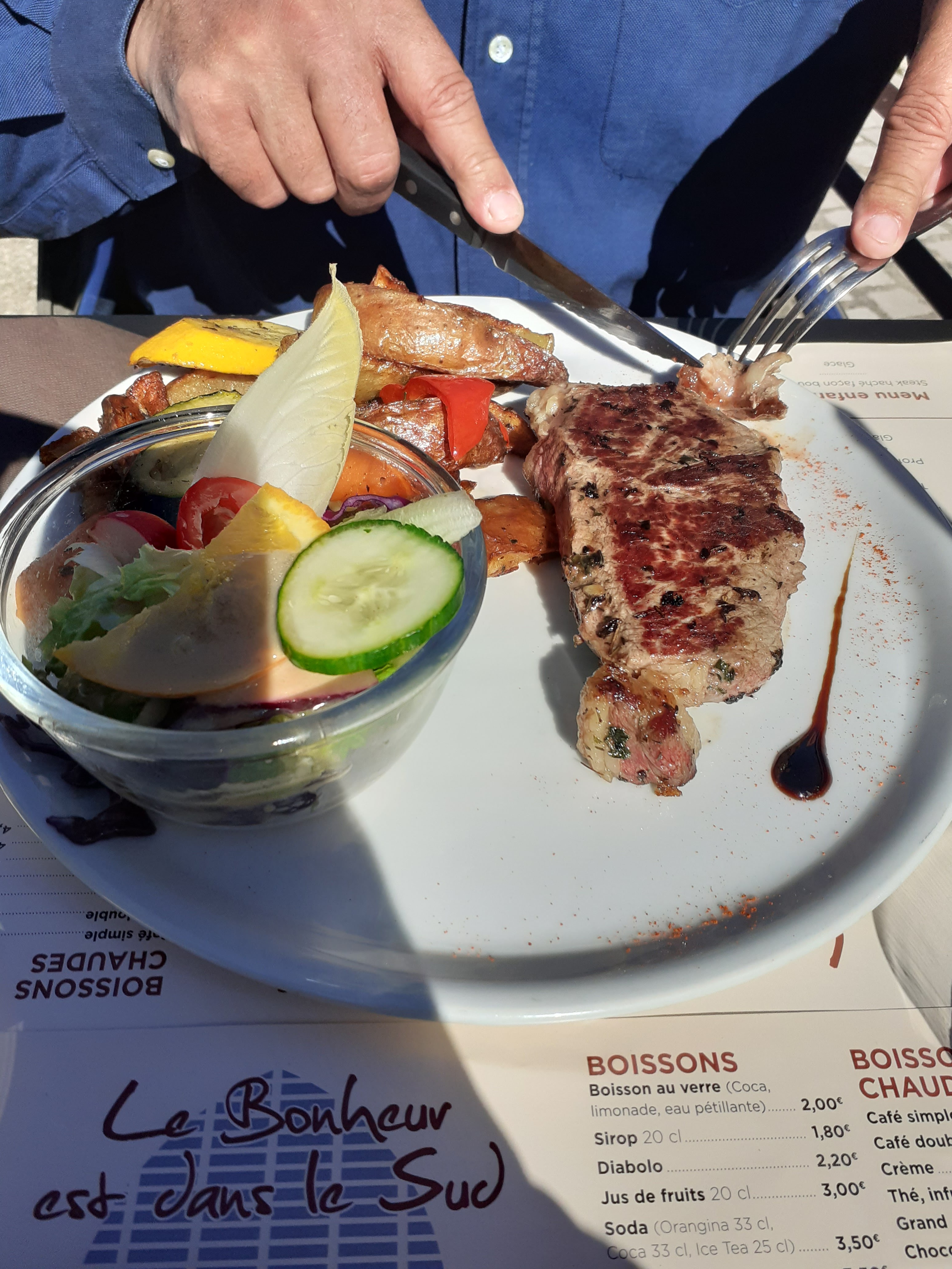 Au hasard nous sommes sortis de l autoroute à la Cavalerie nom du village Charmant ce restaurant situé en face de la pharmacie .Il s appelle le bonheur est dans le Sud .on a eut la dernière table .il vaut mieux réserver. On y a très bien mangé service rapide malgré le monde .Tout le personnel super sympa .c est sûr on y retournera car cette route on la fait plusieurs fois par an