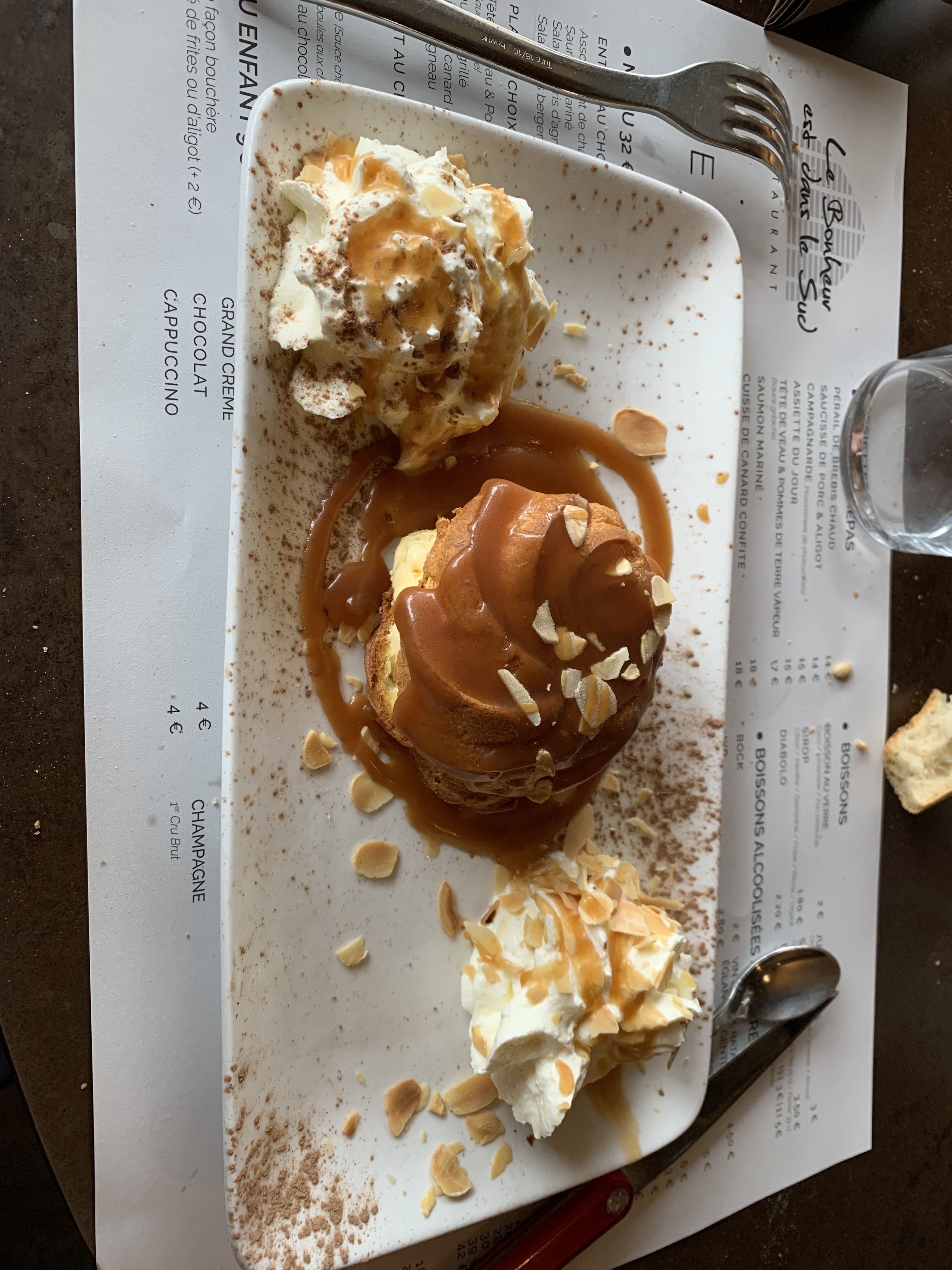 Arrivé un peu tard, j'ai quand même pu manger. Excellent plat du jour, viandre tendre, belle cuisson. Profiteroles caramel beurre salé extra.