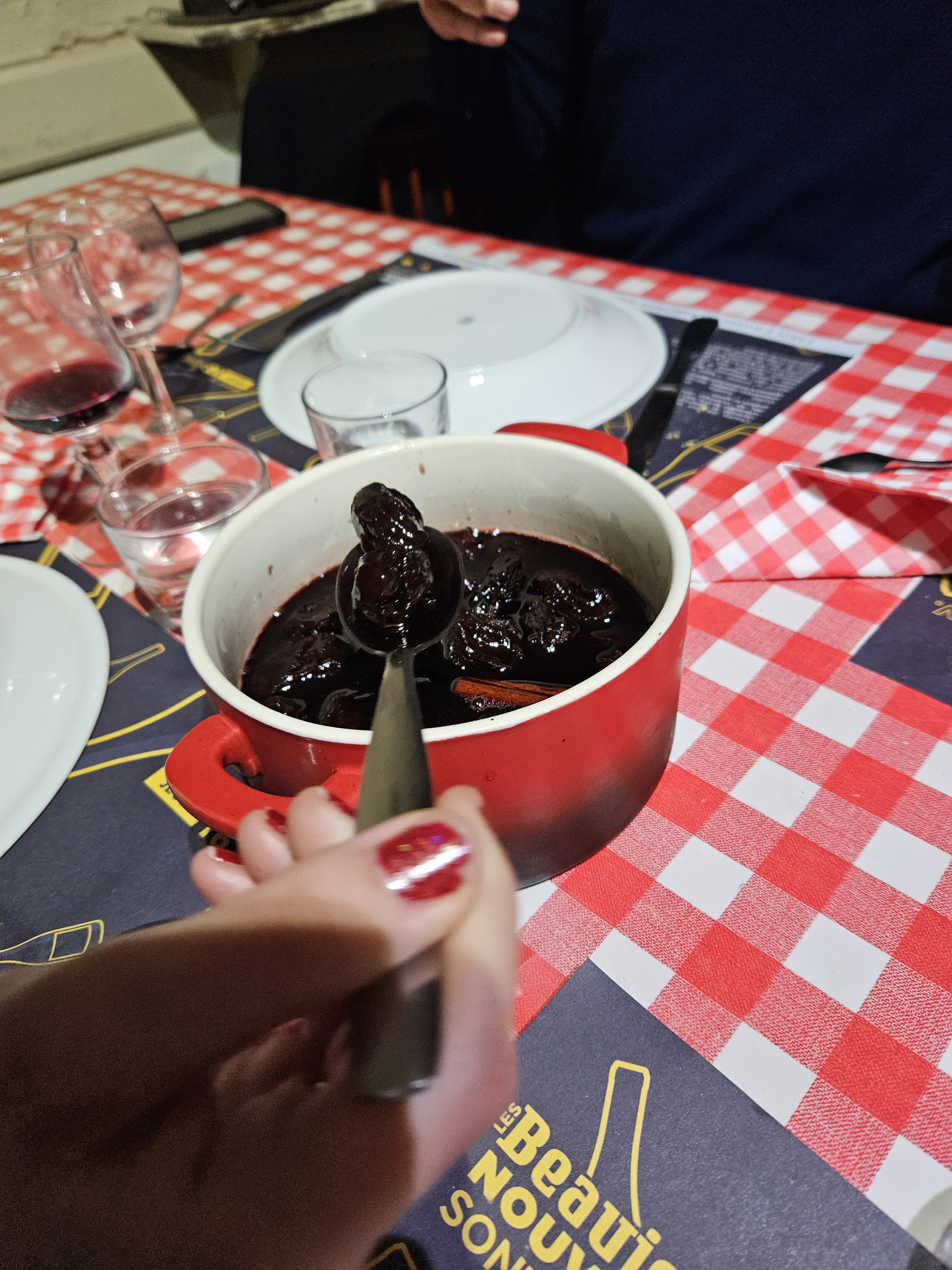 Tout est bon... au Bouchon en beaujolais . On s'arrête par hasard et on est tout contents de découvrir que ce bouchon a le même patron que le bouchon de Saint Didier sur beaujeu que nous connaissons et apprécions ! Pommes de terre harengs, saucisson cru/cuit, viande séchée délicatement relevée, andouillette émincée longuement mijotée, fricassée de volaille à la crème...sans oublier la fameuse glace rose à la praline , une création du patron ...le tout arrosé d'un ptit beaujolais village nouveau fruité et goulayant comme disait mon papa...Allez y les yeux fermés ! Vous ne verrez pas l'extérieur 😉le principal est dans l'assiette et dans l'accueil du patron.