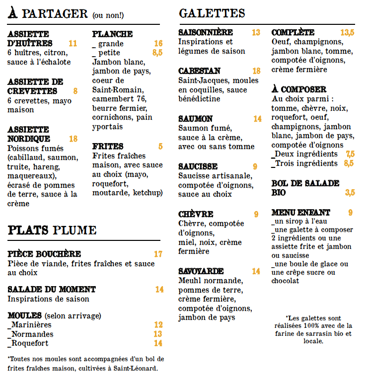 Posté le 02/05/2021 à 16:47"Un restau qui se lance pendant le confinement, ce n'est pas banal, la carte à emporter est de rigueur et le goût est au rendez-vous, deux delicieuses galettes dégustées près de la plage, et une planche de charcuteries et fromages emportée pour le dîner, de bons produits, les boissons (jus de pomme, cidre, bière) bio artisanales et locales et qui semblent amoureusement sélectionnées. Et l'accueil ? Chaleureux et agréable comme le reste. Un point négatif, on était de passage à Yport et vous êtes trop loin de chez nous ;)"