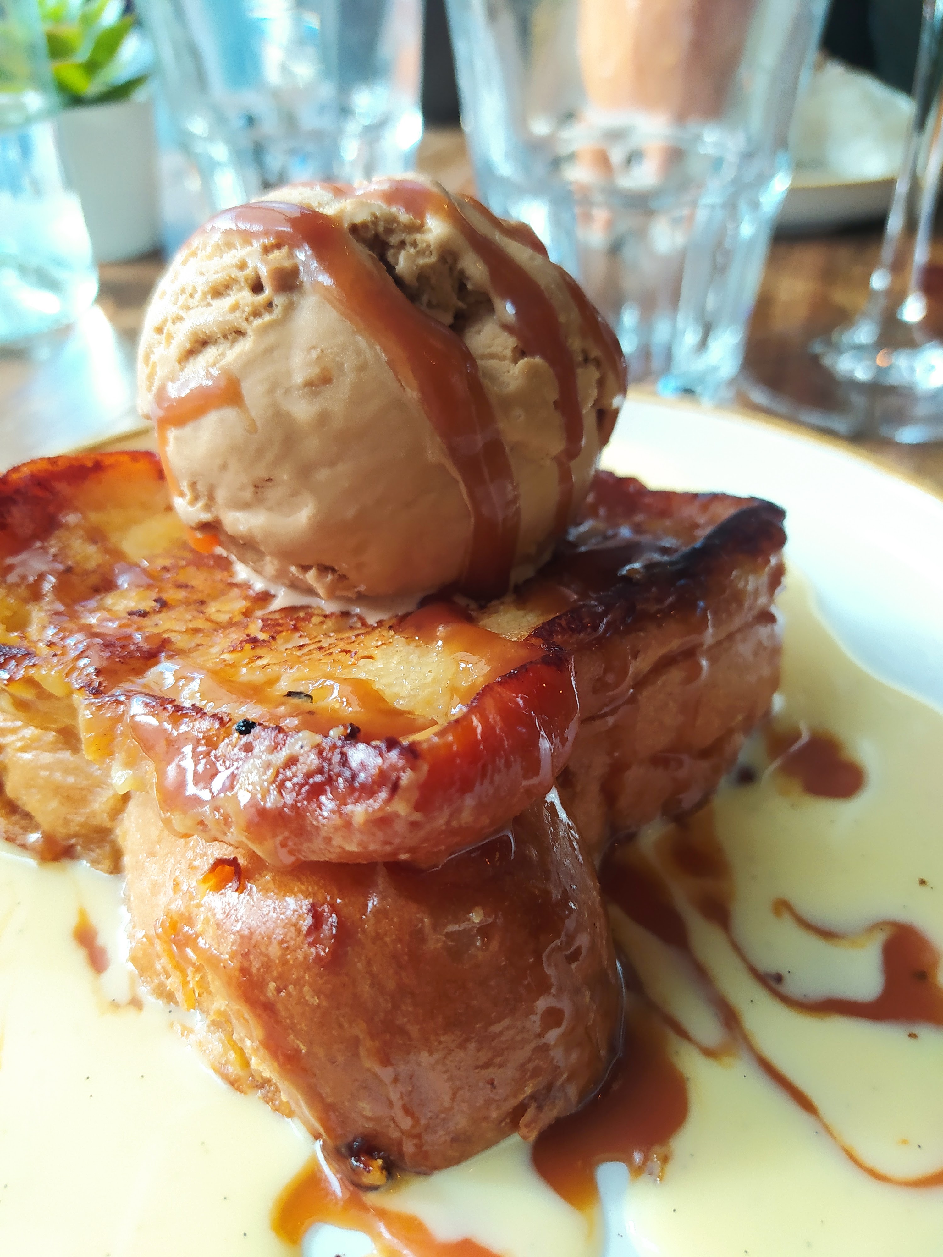 Un repas de bonne qualité avec notamment en dessert une brioche façon pain perdu à tomber accompagnée de glace au caramel et d'une crème anglaise
