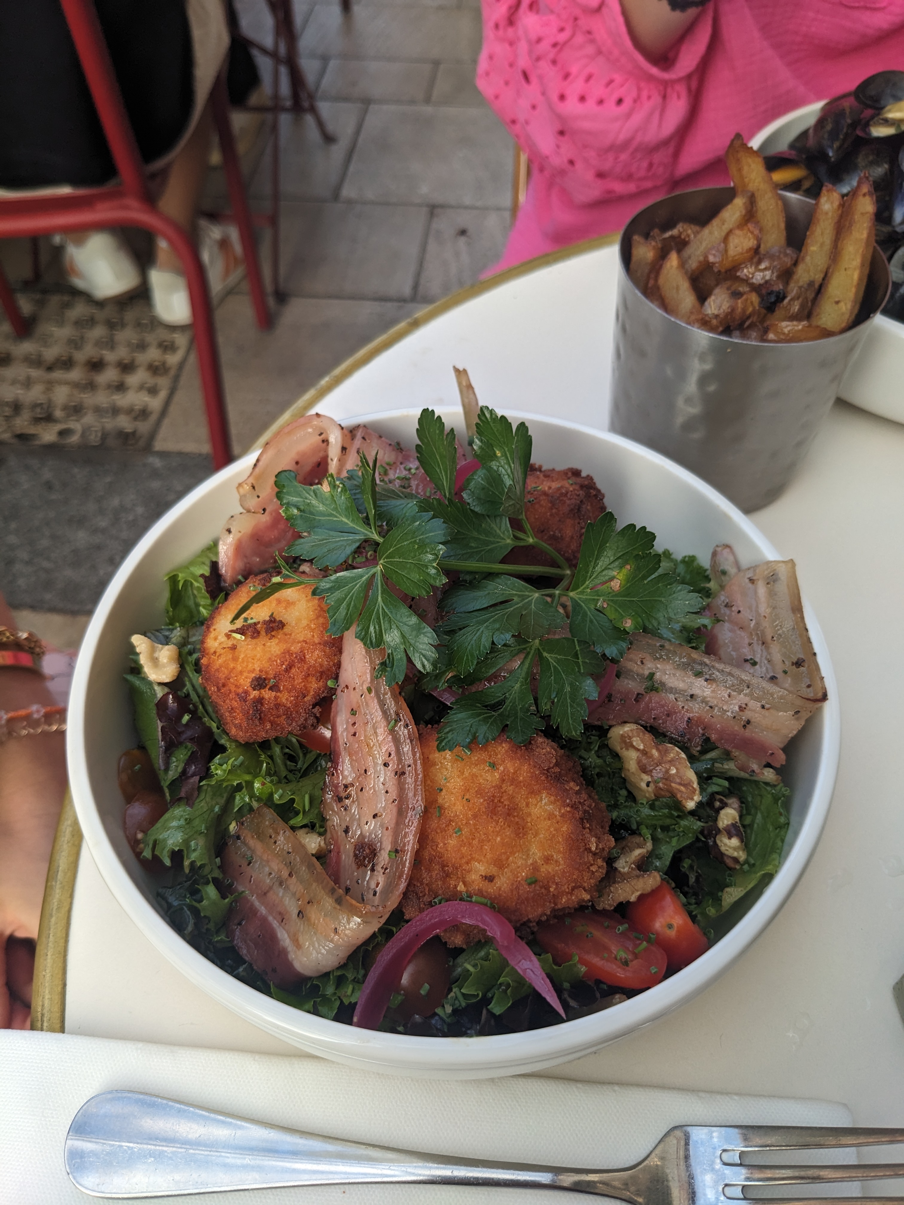 Super bon et cadre sympa, jolie déco et personnel efficace. Salade vraiment bonnes et mention spéciale pour les rillettes de daurade et la brioche perdue, une tuerie. Pas de réservations mais beaucoup de place disponible, seul bémol c'est assez bruyant. A recommander !